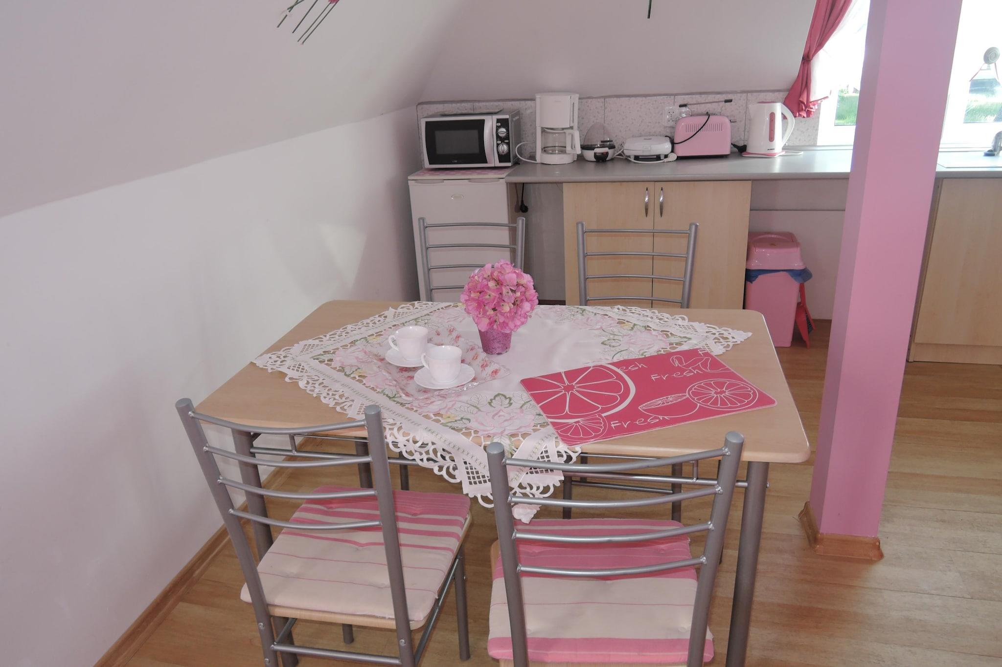 På 2. etage: (Køkken(elkedel, cooker, brødrister, espressomaskine, mikrobølgeovn, køleskab), Stue/soveværelse(dobbeltsovesofa, spisebord), soveværelse(dobbeltseng, Fjernsyn(Tyske TV-kanaler)), badeværelse(bruser, håndvask, toilet)) Internetadgang, terrasse(deles med andre gæster, 25 m2), parkering