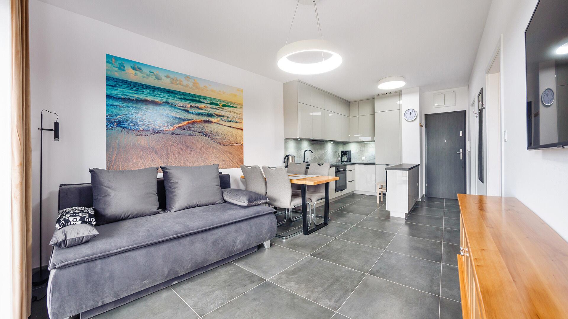 Nur 100 Meter trennen die Apartments vom breiten, sandigen Strand – ideal für Sonnenanbeter ebenso wie für ausgedehnte Spaziergänge entlang der Küste. Das Rauschen der Wellen und die frische Meeresbrise schaffen eine unvergleichliche Atmosphäre, die zur vollkommenen Entspannung einlädt.