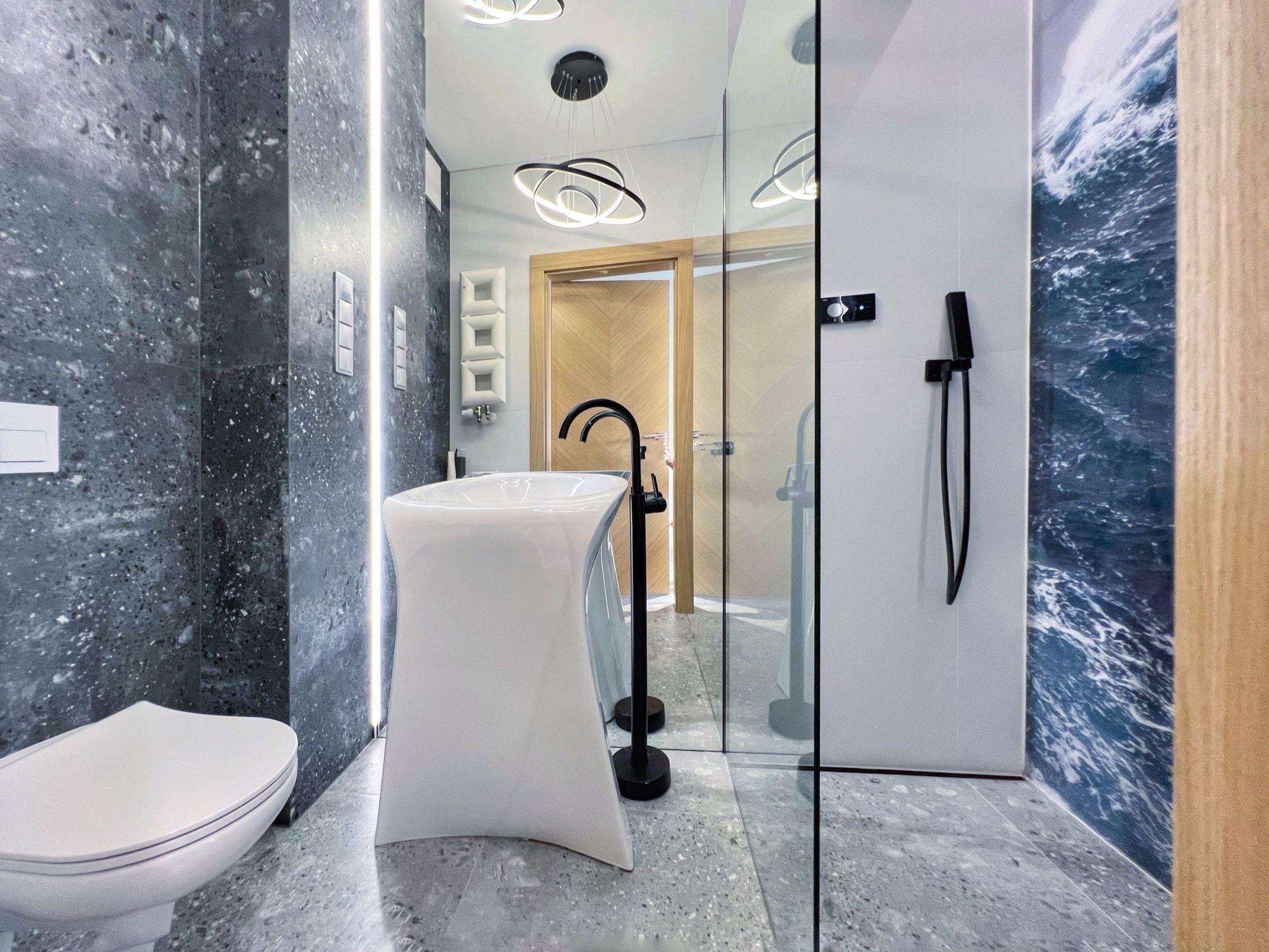 Designer bathrooms equipped with Tres shower mixers with electronic touch panel.