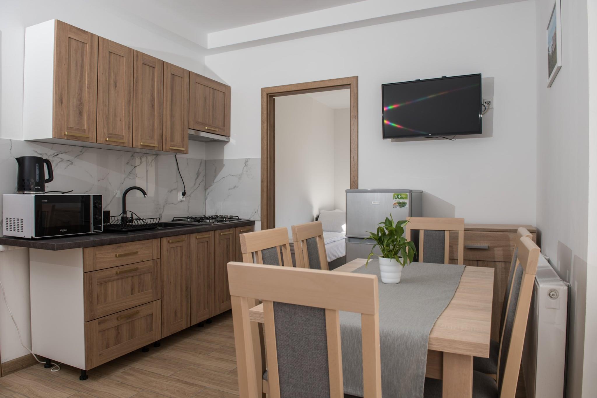 Et familie rekreativt center med en swimmingpool, i et roligt område, ved siden af et stort vandland. 10 minutters gang til stranden ved havet. Komfortabel 2-værelses ferielejlighed i stueetagen. Det er designet til komfortabelt at rumme 7 personer. Den består af en stue (dobbelt fold-ud sofa, bord med stole og TV), 2 separate soveværelser og et badeværelse med bruser. Stuen er forbundet med køkkenet. Lejligheden har en afslapningsterrasse med et sæt havemøbler og en grill. Trådløst internet er tilgængeligt for gæster. Centrets største attraktion er den nye opvarmede swimmingpool (åben fra maj til september). Swimmingpoolen har tag. I det indhegnede område af rekreationskomplekset er der en parkeringsplads (1 plads/hus), en volleyballbane, en legeplads og en cykeludlejning. Prisen for opholdet inkluderer: sengelinned, håndklæder, vandforbrug, elforbrug, varme, swimmingpool, internet, slutrengøring, parkering (1 plads/lejlighed), barneseng og høj stol (forudgående reservation nødvendig). Jaroslawiec er et roligt sommerresort beliggende på den centrale kyst, tæt på Darlowo og Ustka. Et vidunderligt klima og landskaber, fyrreskove, klart vand i havet, en klippe ved havet - det er fordelene ved Jaroslawiec, der får denne by til at tiltrække skarer af turister hvert år. Der er også mange interessante attraktioner, der venter på turister her, som vil diversificere deres ferie ved havet. Jaroslawiec tilbyder også en rig gastronomisk base. Stranden i Jaroslawiec er ideel for turister, der kan lide at solbade på uoverfyldte steder. På stranden kan du se farverige fiskerbåde og finde gyldent rav. Efter den nylige renovering er stranden meget bred og smuk. Du kan tage til den nærliggende sø (ca. 2 km), hvor du også kan bade, eller leje en fiskerbåd.