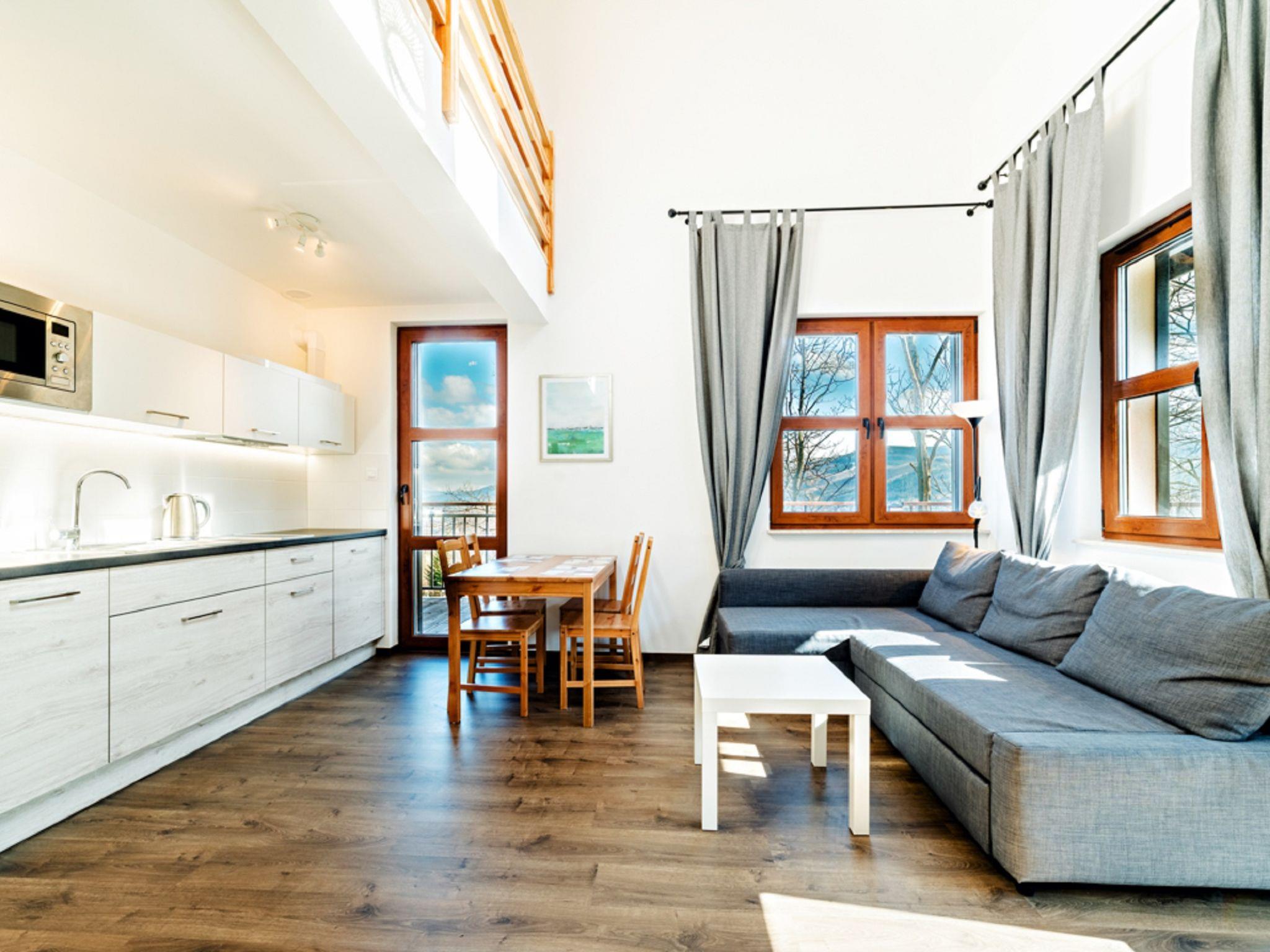 Karpacz: Modern, cosy apartment block "Karpacz Residence". In a quiet, sunny, elevated position. In the house: WiFi, central heating system. Parking (extra) at the house on the premises. Restaurant 1.1 km, bus stop 950 m. Ski lift 800 m. Nearby attractions: Park Wodny Tropikana 700 m, Swiatynia Wang 1.1 km. Well-known ski regions can easily be reached: Pod Wangiem Duzy Ski Lift 700 m, Wyciag narciarski Bialy Jar 800 m, Skocznia narciarska Orlinek 1.3 km. Please note: the photograph shows a typical example. Additional accommodations can be booked. The apartment may be on the ground floor, first floor or second floor. Some apartments with mountain views / partial views. There may be an additional parking fee paid on spot. Infant accepted over the maximum number of people - up to 3 years of age.