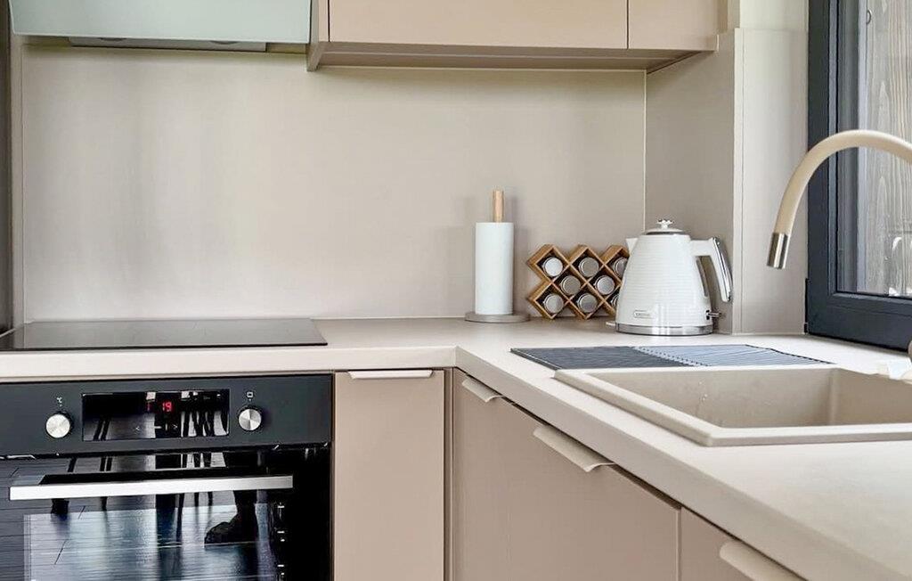 Træd indenfor og oplev den varme opholdsstue med den hyggelige hjørnesofa og harmoniske træpaneler. Brug det åbne rum til at slappe af, læse eller nyde hyggelige aftener. Gulv-til-loft-vinduerne tilbyder udsigt over den store græsplæne og oversvømmer rummet med naturligt lys. Tilbered jeres måltider i det moderne køkken og nyd dem derefter i den stilfulde spisestue med udsigt over det grønne.