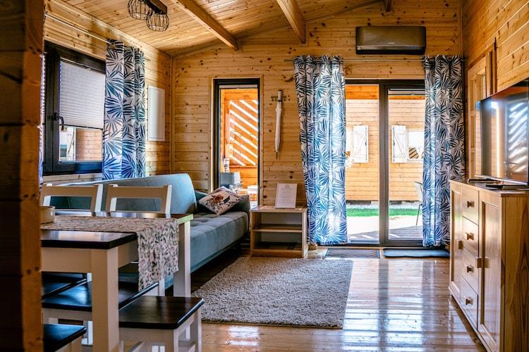 Stueetage: (åbent køkken(kogeplade(Komfur med to kogeplader, induktion), elkedel, emhætte, mikrobølgeovn, køle-fryseskab), stue / spisestue(dobbeltsovesofa, Fjernsyn(fladskærm), spisebord), soveværelse(dobbeltseng), soveværelse(3-etage-køjeseng), badeværelse(bruser, håndvask, toilet, føntørrer)) Reception, Internetadgang, Parkering, Cykeludlejning, Legeområde, Græsplæne, Bubble bath(deles med andre gæster, udendørs, betalt, varmelegeme), sauna(deles med andre gæster, betalt), varme(elektrisk, gennem aircondition), klimaanlæg, terrasse(privat, overdækket), have(deles med andre gæster, indhegnet), havemøbler, solstole, grill(trækul), rutsjebane(deles med andre gæster), cykler til rådighed(på anmodning), hængekøje, Haveskur, Gyngestativ
