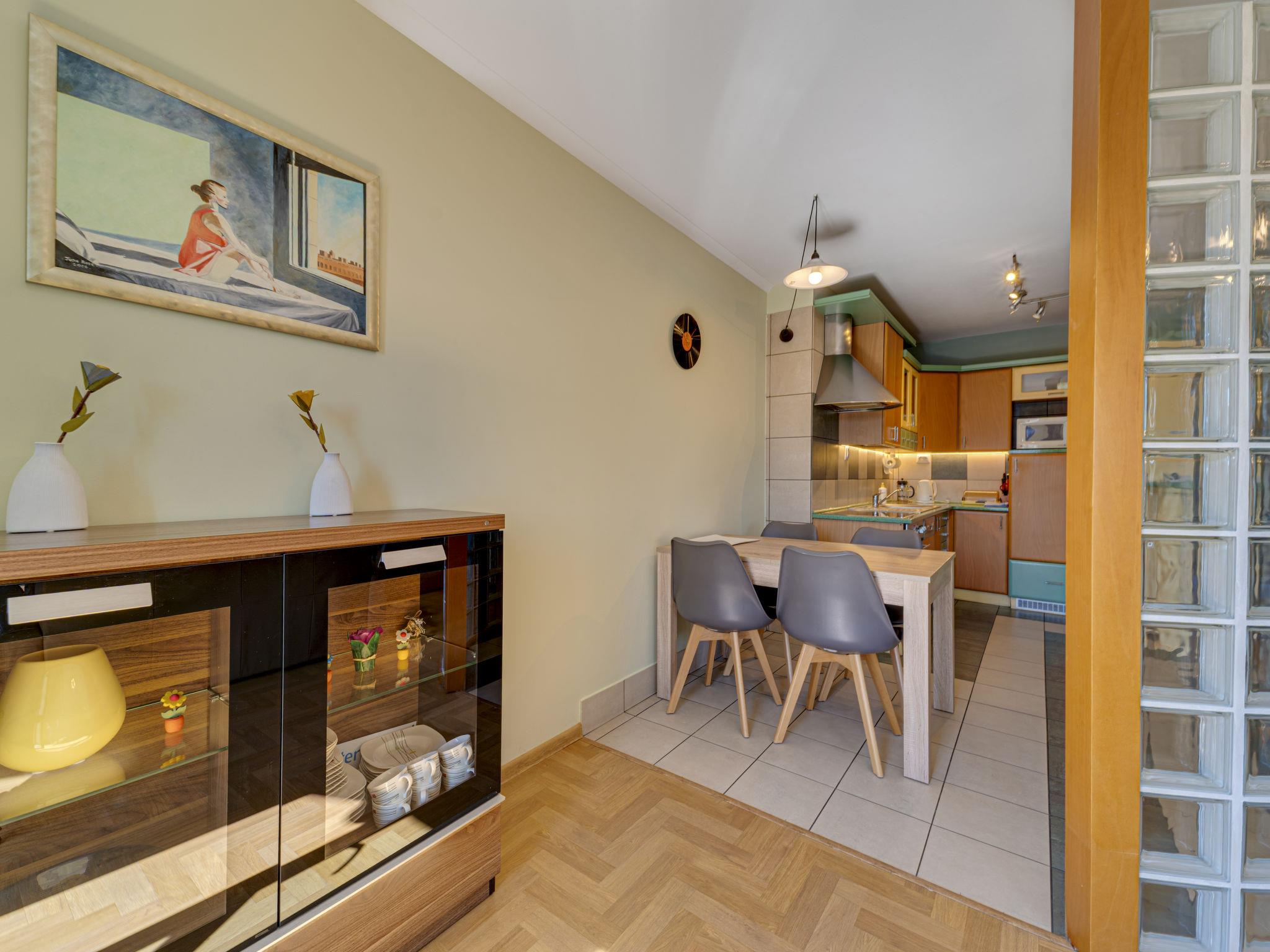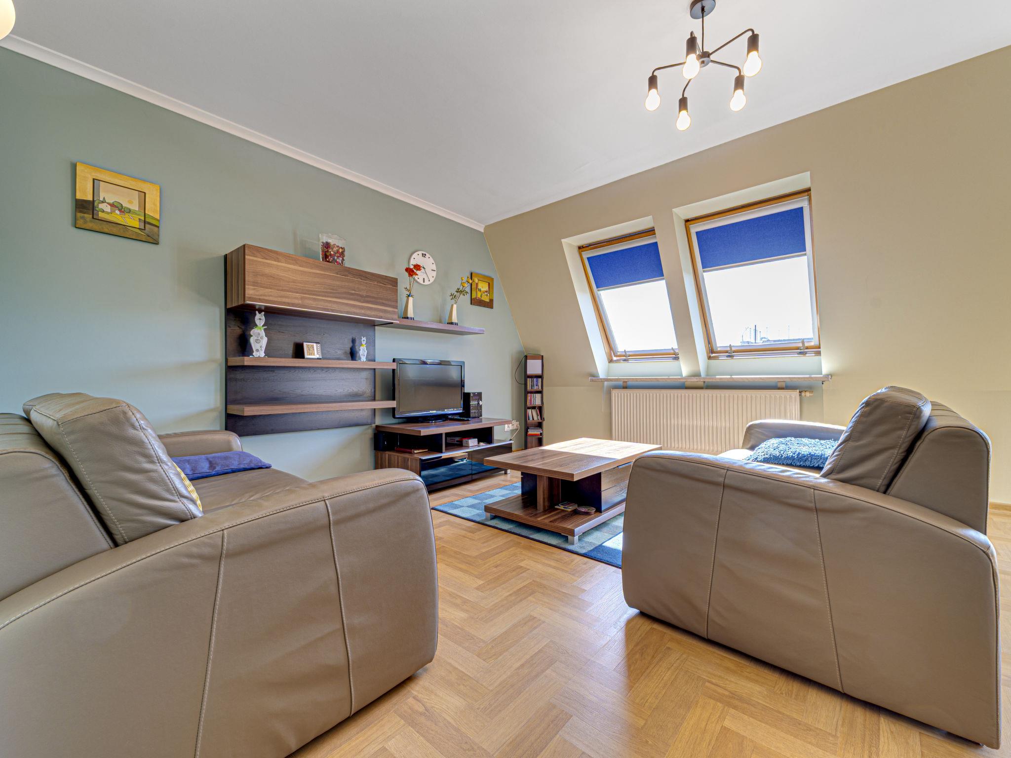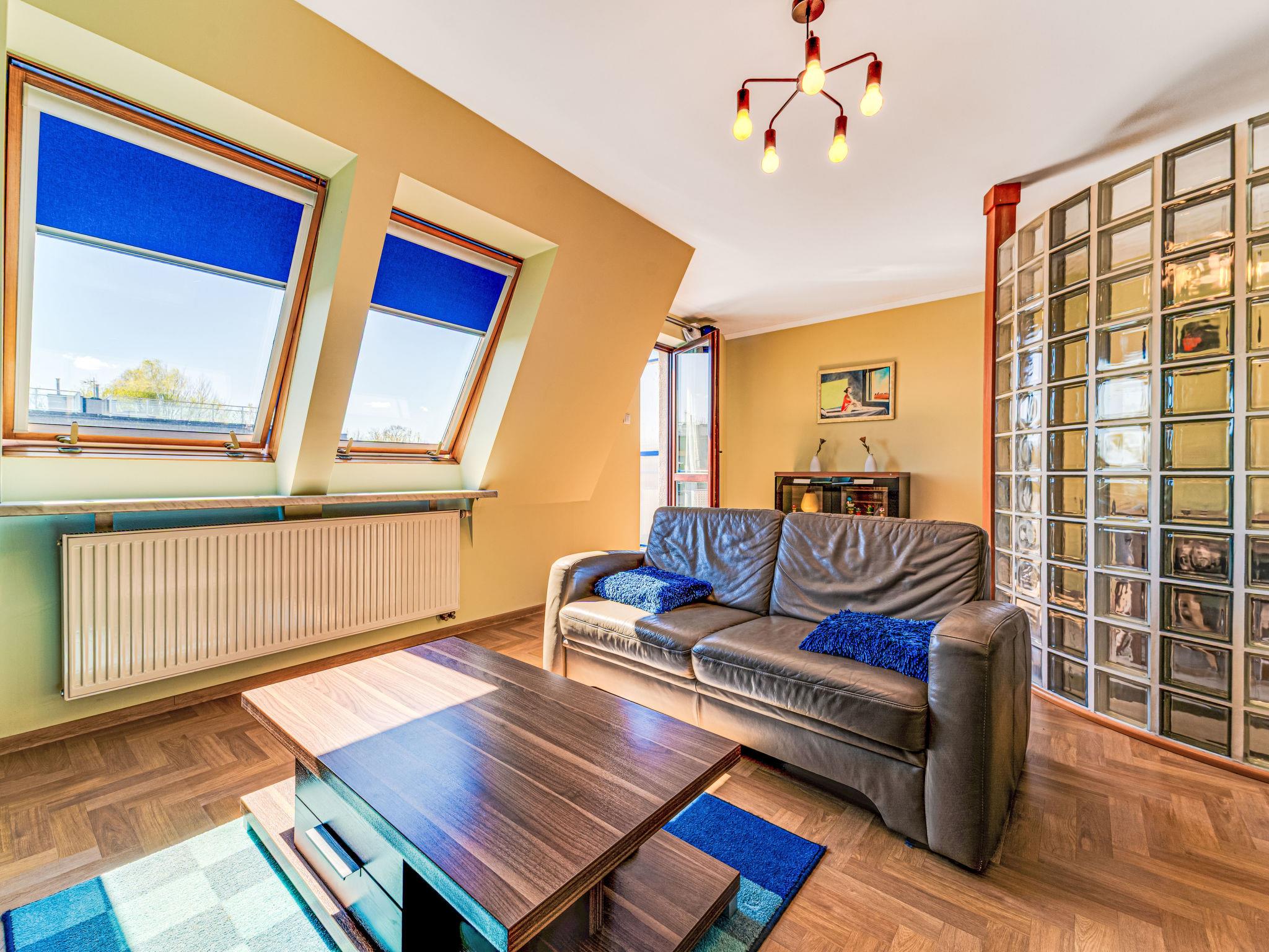 3-room apartment 70 m2, on the top floor. Practical and beautiful furnishings: open living room with 2 double sofabeds (140 cm), TV, radio, CD-player, hi-fi system and DVD. Exit to the balcony. 1 small room 9 m2, with sloping ceilings with 1 double bed (140 cm, length 200 cm). 1 small room 8 m2, with sloping ceilings with 2 beds (80 cm, length 200 cm). Open kitchen (oven, dishwasher, 4 ceramic glass hob hotplates, microwave) with bar. Bath/WC. Balcony. Facilities: children's high chair, baby cot for up to 2 year olds, hair dryer. Internet (WiFi). Please note: TV only PL. Smoke alarm. 52031321214