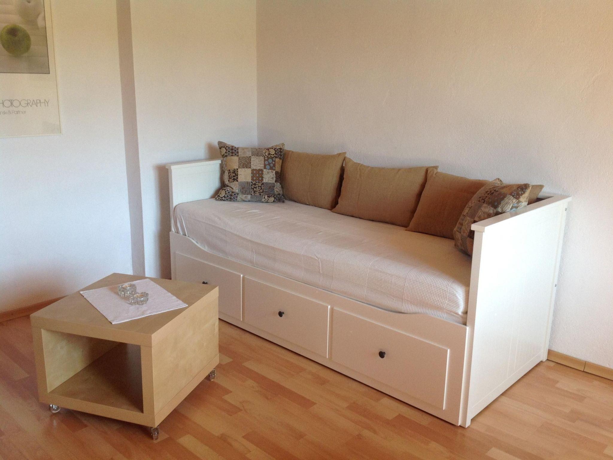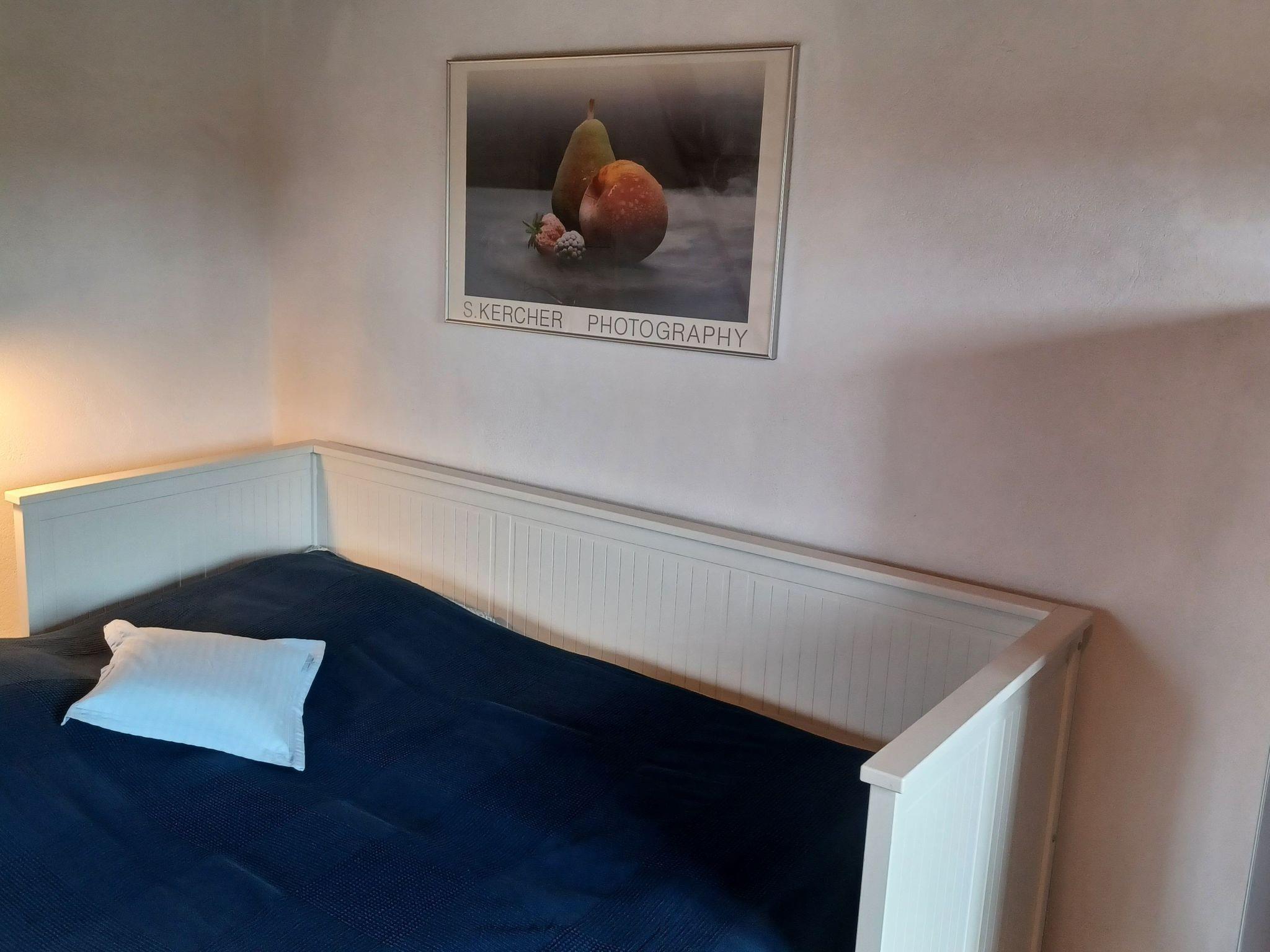 Maximum 1 pet/ dog allowed. The 60 m² holiday flat is ideal for 4-5 people and has a daybed sofa in the living area, which can be converted into a large, comfortable double bed in a few simple steps. As the ceiling is very high, a floor with a bedroom with 2 single beds has been created. A third bed can be added on request. The large, open-plan living area with kitchenette has a dining table with 5 chairs, satellite TV and free WiFi. The bathroom with window has a shower, toilet and washbasin.