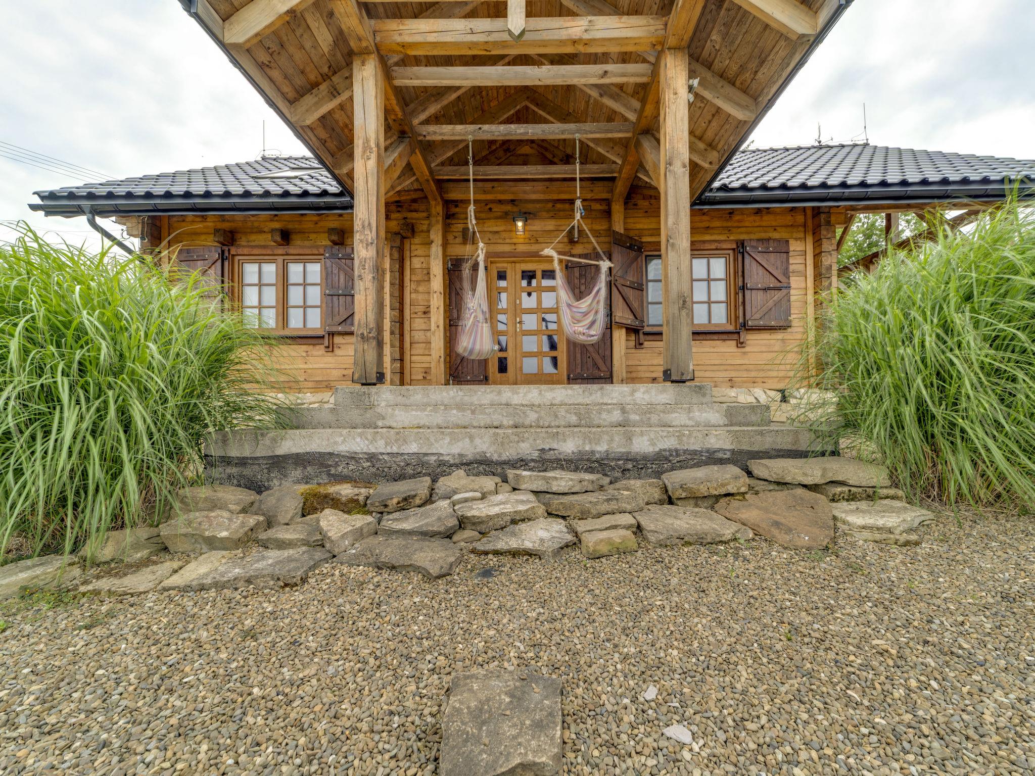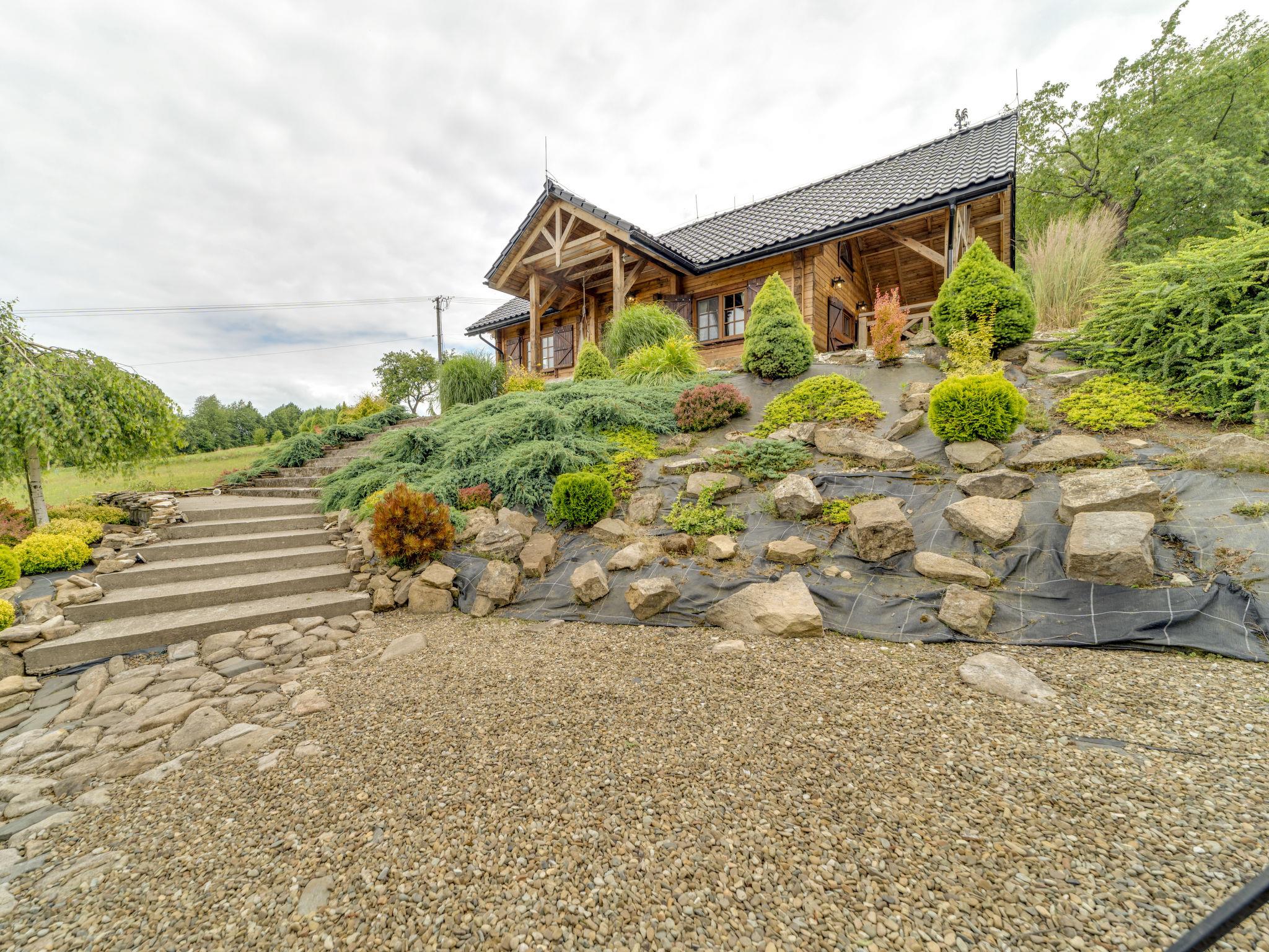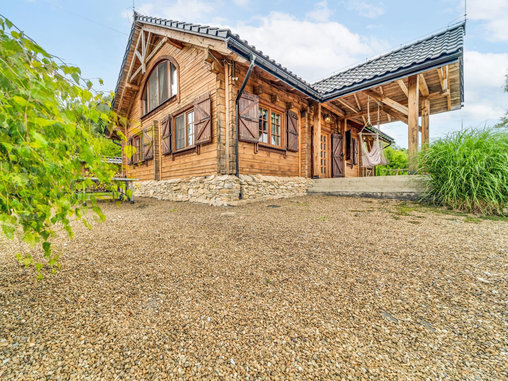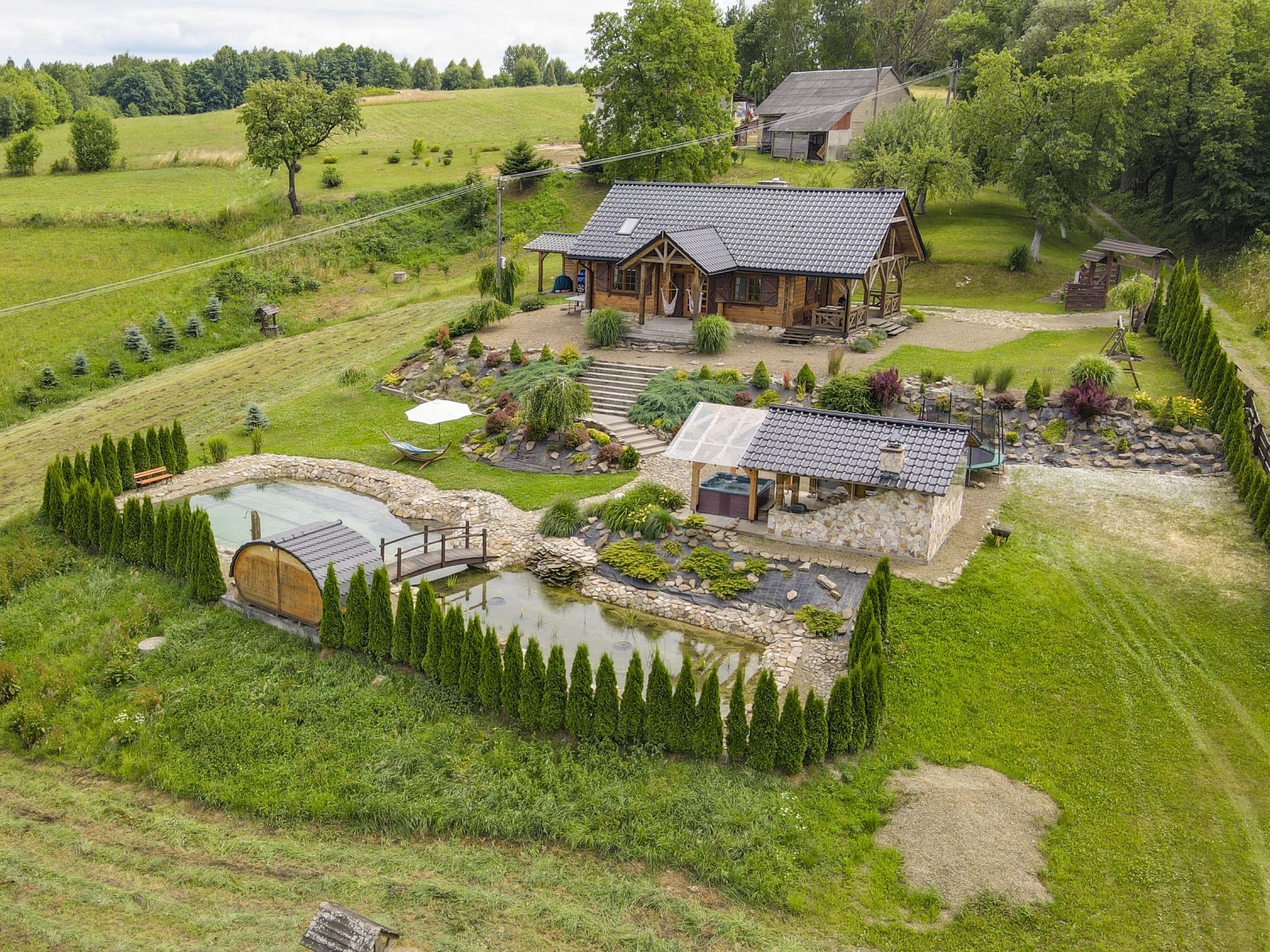 Large, beautiful, comfortable single-family house "Bieszczady Chata", built in 2015. On the outskirts, in a quiet, sunny, elevated position on a slope, in the countryside. For shared use: property 3'500 m2, natural garden 2'500 m2, lawn for sunbathing. Hot tub, table tennis, terrace, garden furniture, barbecue, children's playground. In the house: WiFi, trampoline, central heating system, washing machine. Available: bicycles. Steep motor access (via unmade road). In Winter: please take snow chains. Parking at the house. Carport. Shop, grocery, bus stop 800 m. Ski lift 35 km. The summer kitchen allows guests to stay outdoors all the time and enjoy the beautiful views. You can buy vegetables, fruit and cold-pressed oil on site. You can try local products (also available for purchase) or order a homemade dinner. Homemade dinner can be ordered at least 3 days in advance. Winter - winter sports, T-bar lifts (10 km) and chair lifts (Pulawy Górne - 36 km). At a distance of 50 km. Slovakia, Svidnik - a large Aquapark with thermal waters.