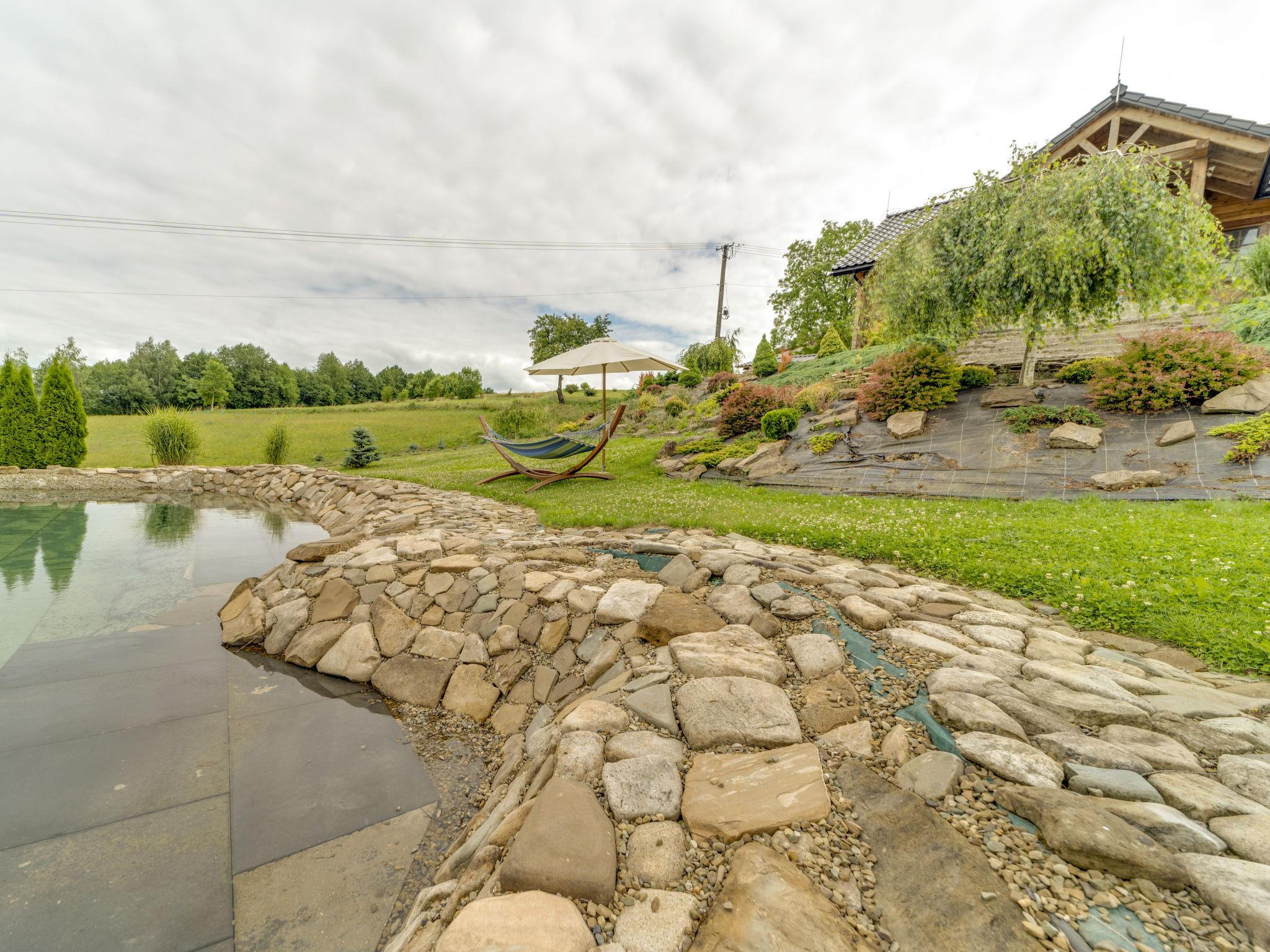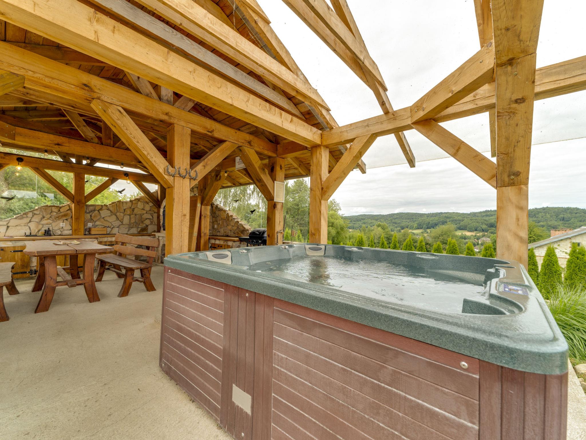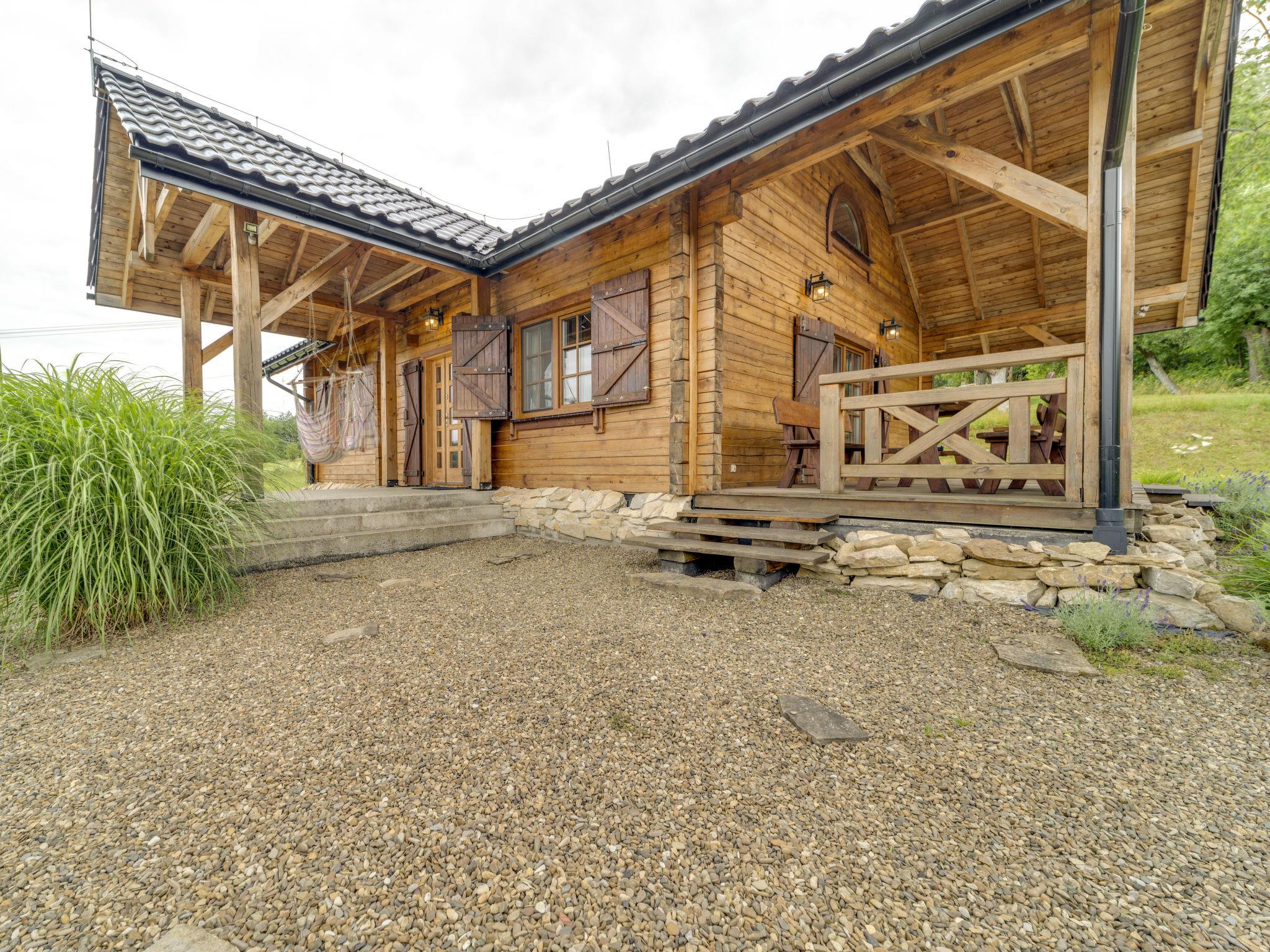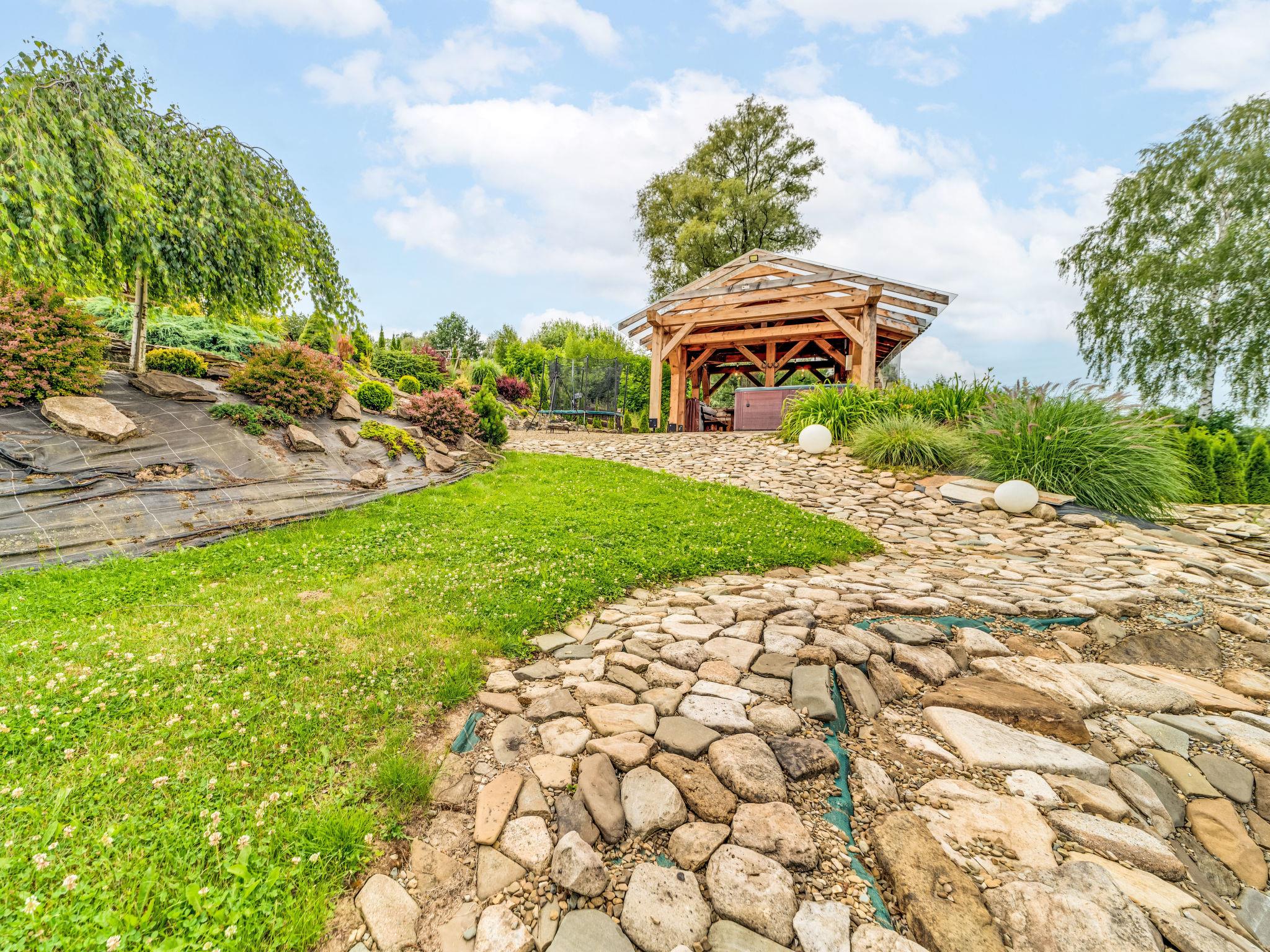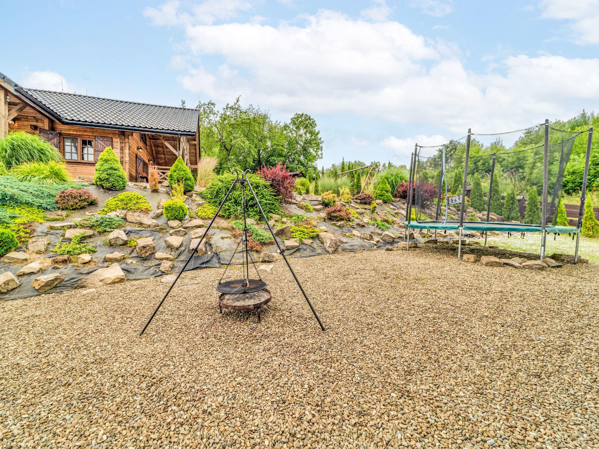 Large, beautiful, comfortable single-family house "Bieszczady Chata", built in 2015. On the outskirts, in a quiet, sunny, elevated position on a slope, in the countryside. For shared use: property 3'500 m2, natural garden 2'500 m2, lawn for sunbathing. Hot tub, table tennis, terrace, garden furniture, barbecue, children's playground. In the house: WiFi, trampoline, central heating system, washing machine. Available: bicycles. Steep motor access (via unmade road). In Winter: please take snow chains. Parking at the house. Carport. Shop, grocery, bus stop 800 m. Ski lift 35 km. The summer kitchen allows guests to stay outdoors all the time and enjoy the beautiful views. You can buy vegetables, fruit and cold-pressed oil on site. You can try local products (also available for purchase) or order a homemade dinner. Homemade dinner can be ordered at least 3 days in advance. Winter - winter sports, T-bar lifts (10 km) and chair lifts (Pulawy Górne - 36 km). At a distance of 50 km. Slovakia, Svidnik - a large Aquapark with thermal waters.