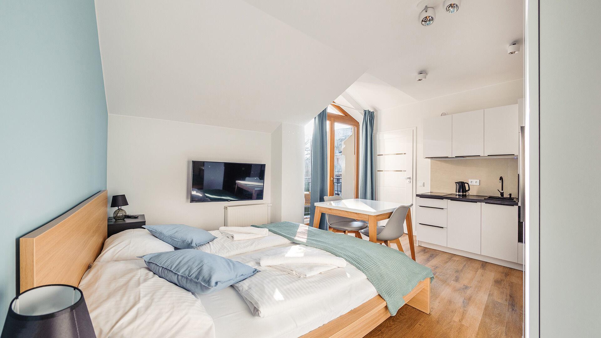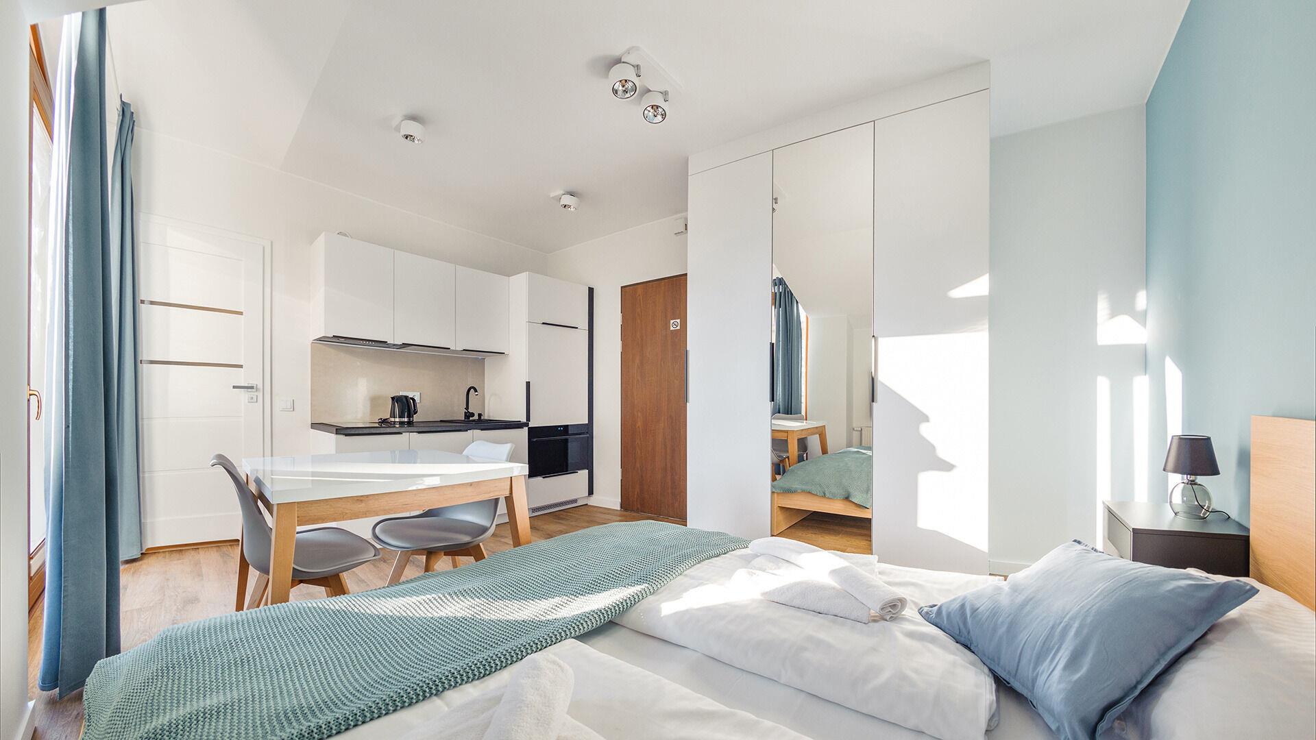 • Haustiere sind in der ausgewählten Wohnung erlaubt. Die Kosten für den Aufenthalt mit einem Haustier betragen 40 PLN pro Tag.