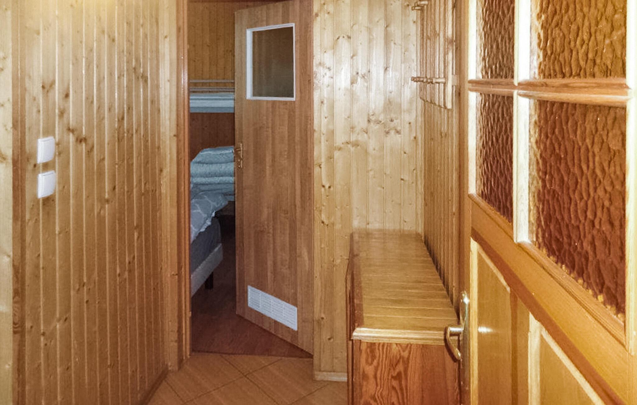 Oplev det indbydende interiør med masser af træ, der skaber en varm og rolig atmosfære. Find jer til rette i den hyggelige opholdsstue med sofa eller brug spiseområdet til fælles måltider. Tilbered enkle måltider i det åbne tekøkken. Yderligere afslapning venter i den fælles sauna, som giver beroligende varme efter en aktiv dag.
