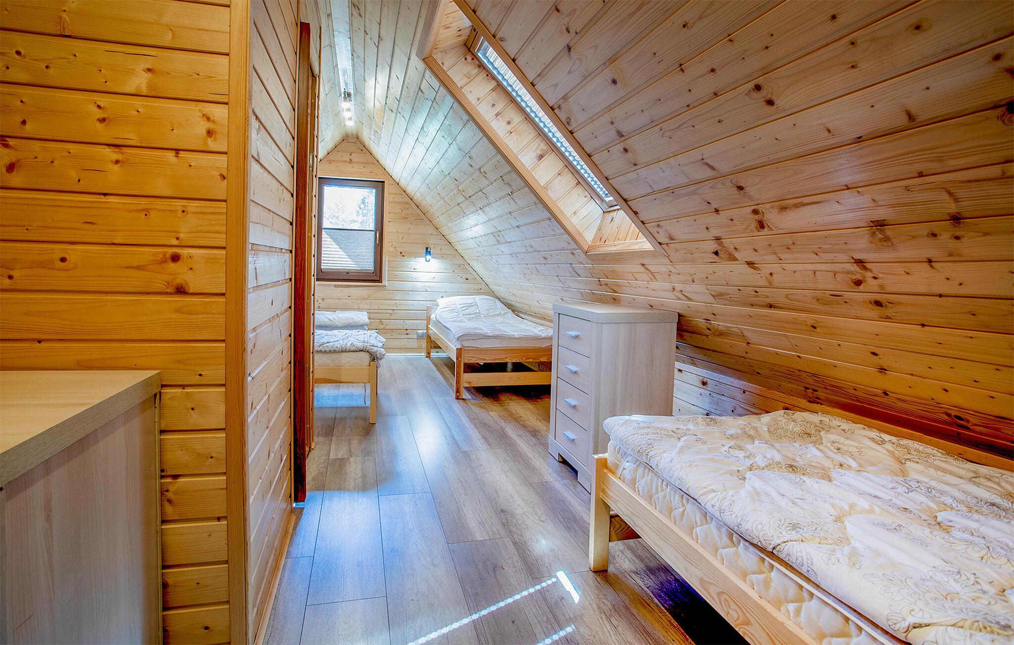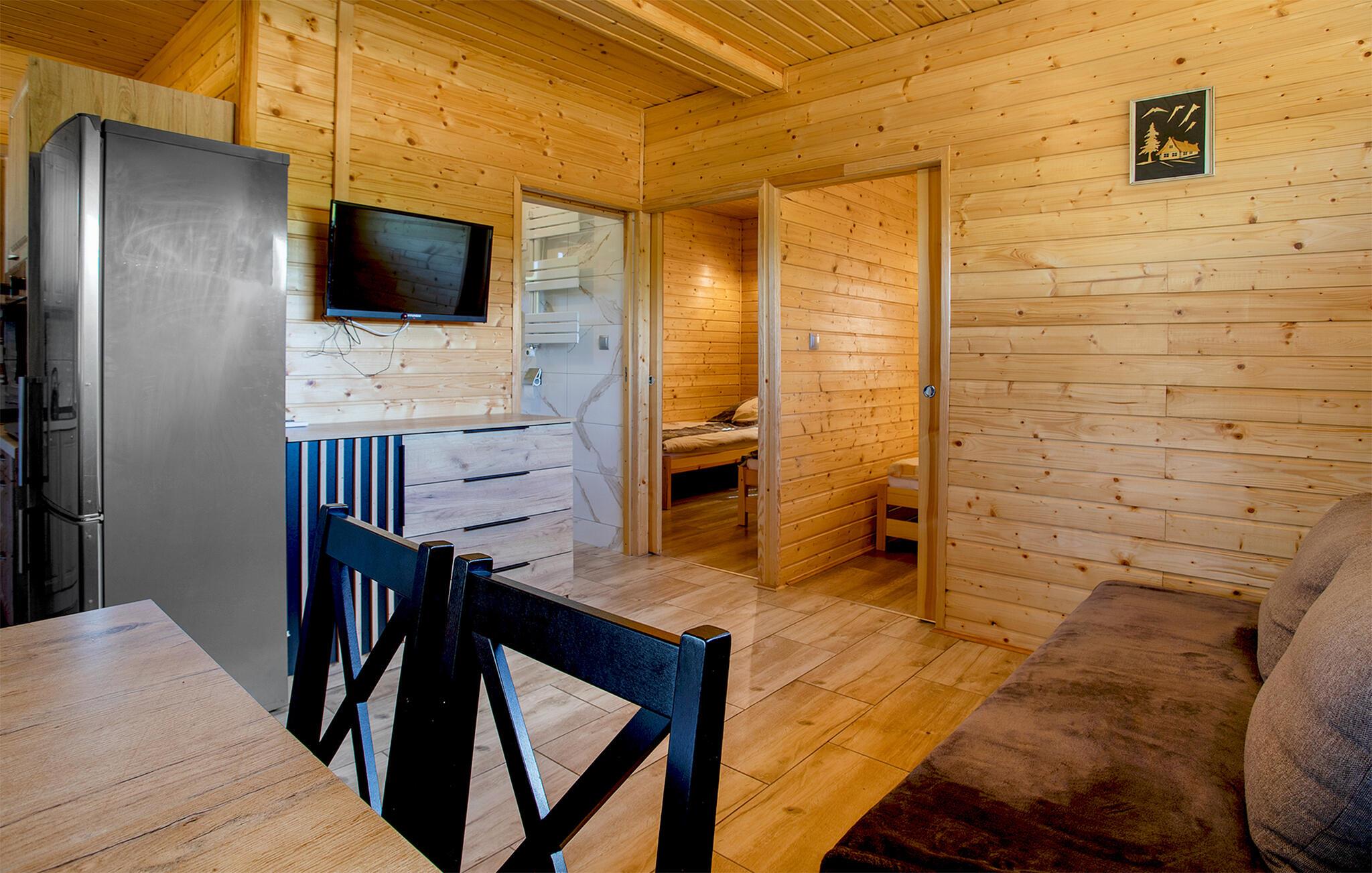 Dette hyggelige træhus tilbyder friluftsmennesker muligheden for at slappe af fra hverdagen og lade batterierne op i charmerende omgivelser. Tilbered lækre retter i det praktiske køkken, og planlæg jeres aktiviteter sammen ved det indbydende spisebord. Efter en lang dag udendørs inviterer den komfortable opholdsstue til at nyde sociale spilleaftener eller en afslappende bog.