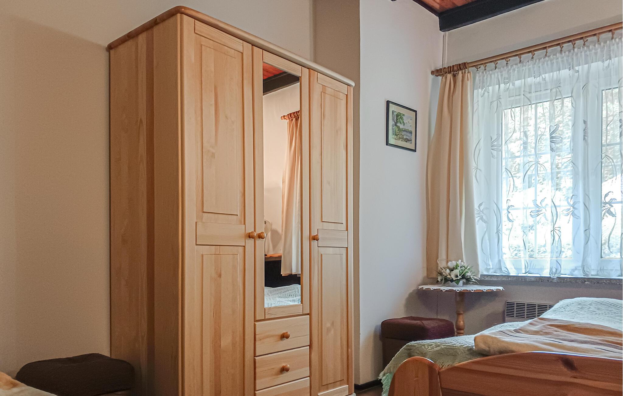 Dette dejlige feriehus af sten ligger på en lukket grund i skønt område. Ved huset er der terrasser med udsigt til skoven. I dette uforstyrrede område ligger der kun 3 feriehuse og naturparken er ikke langt væk. Til husets praktiske udstyr hører bl.a. en sauna. Derudover er der også en kakkelovn og et røgeri. Efterår/vinter (31.10.-1.4.) er huset kun for max. 6 pers., da annexet er uopvarmet. I annekset/soverummet er der også fitnessredskaber. I kan bruge den nærliggende bro til at fiske fra. Søen Ciche er rig på fisk. Ejer hjælper gerne med at købe fisketegn. Til Gorzow Wielkopolski/Landsberg er der ca. 25 km. I skal købe fiskekort for at fiske i Parzenskosøen. I kann enten vælge et der giver tilladelse til at fiske fra land (gyldig 7 eller 14 Tage) og mod ekstra betaling også fra båd.