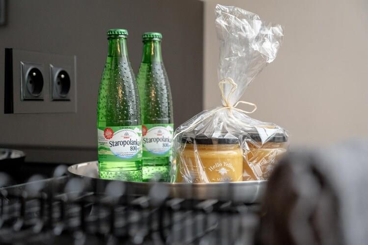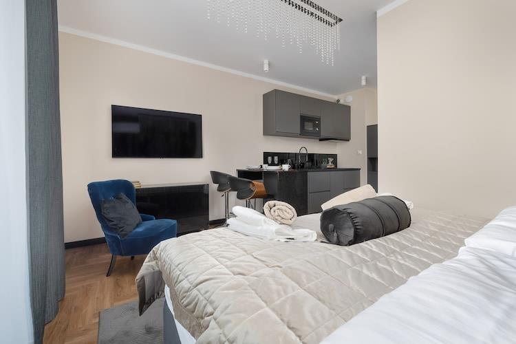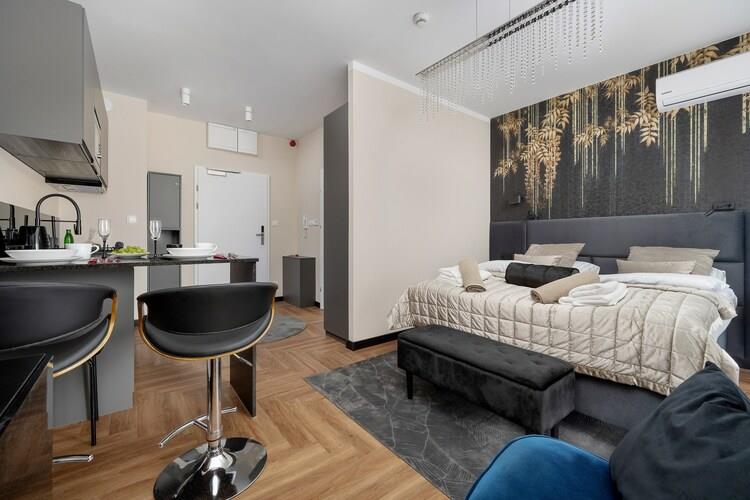 En ferielejlighed i et moderne resortkompleks med swimmingpool, sauna og spabad. Beliggende i hjertet af en fashionabel og populær kurby. Denne ferielejlighed ligger på 4. sal (elevator tilgængelig) med balkon og en fantastisk udsigt over det omkringliggende område. Lejligheden er et åbent rum med et separat soveværelsesområde (to enkeltsenge, der kan sættes sammen til en dobbeltseng), en spiseplads og et veludstyret køkken. Der er også et badeværelse med bruser. Gulvvarme og aircondition er også tilgængelige. Trådløst internet er tilgængeligt. Lejligheden har en gratis underjordisk parkeringsplads. Komplekset tilbyder gæsterne gratis adgang til en indendørs swimmingpool, der er åben året rundt, med separat børnepool, sauna og spabad. Gæsterne har også gratis adgang til et vaskerum og en ismaskine. Der er også et fitnessrum og et legerum til børnene. Prisen inkluderer: el- og vandforbrug, aircondition, varme, swimmingpool, sauna, spabad, fitnessrum, legerum til børnene og internet. Polanica Zdrój er en kurby ved forbjergene. Byen er meget velholdt og fascinerende med sine mange pladser, promenader og parker. Der er masser af steder at slentre og behagelige cykelruter. Der er adskillige gode restauranter, og om aftenen er det værd at se det fortryllende lys- og musikshow ved byens springvand. Der er også en sommerkælkebane. Bjergvandrere vil nyde en tur til Errant Rocks i Taffelbjergene. Om vinteren kan skiløbere nyde det professionelle skisportssted Zieleniec (17 km fra Polanica).