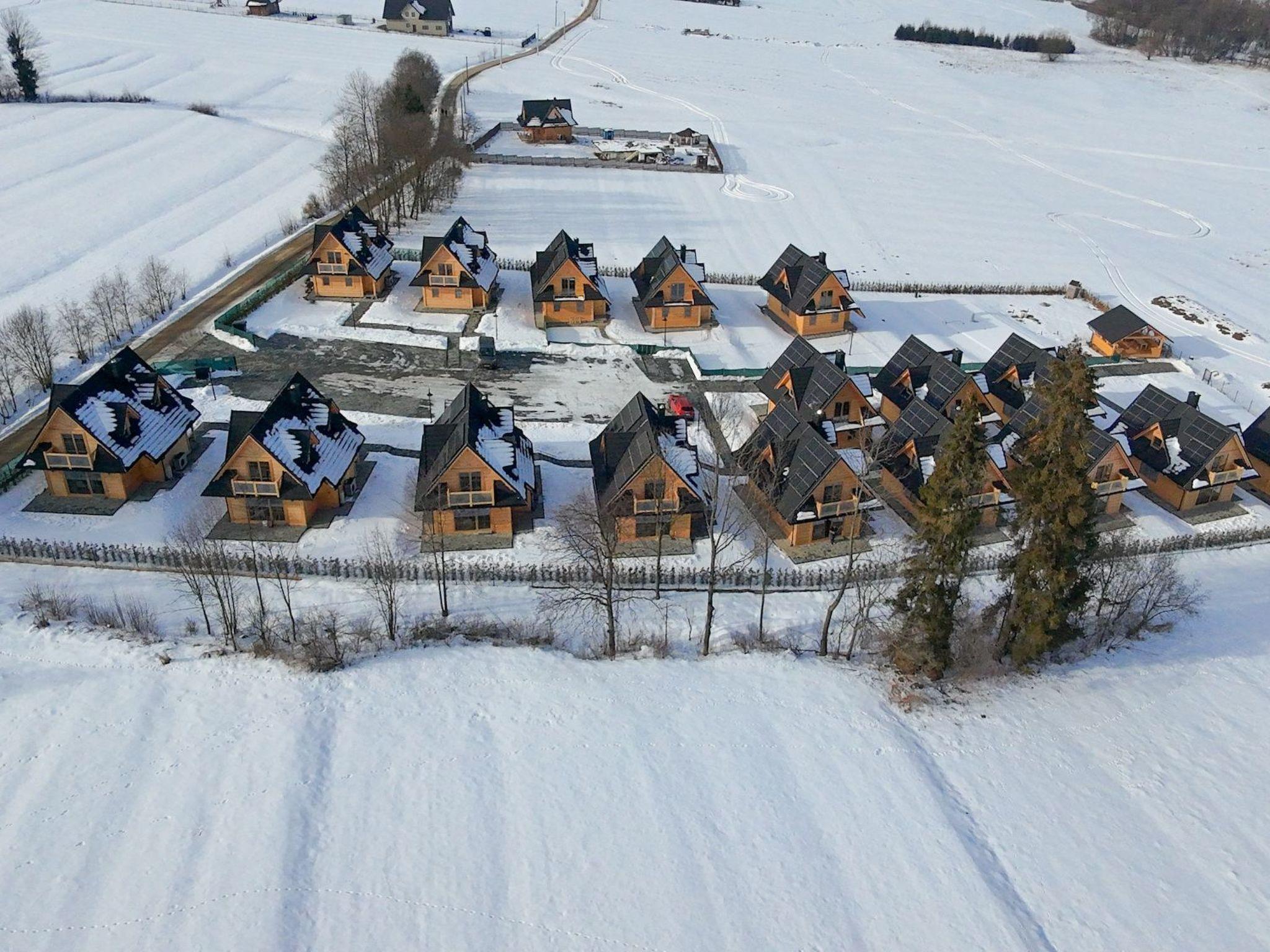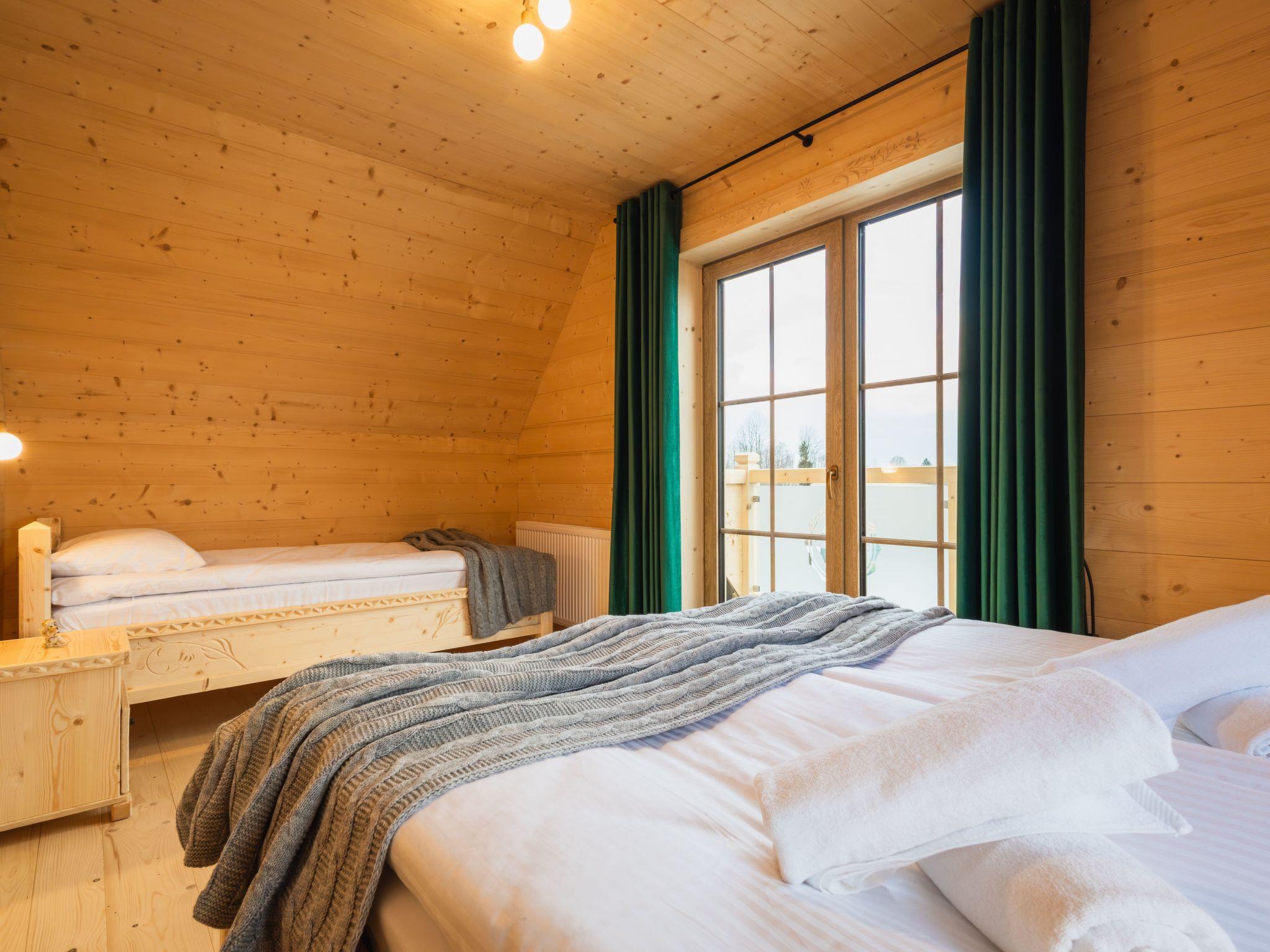 Each cottage is a spacious interior with a living room, a fully equipped kitchen, an additional toilet and a terrace overlooking the surrounding meadows and forests. In the upper part of the cottage there are two bedrooms with balconies with views and a bathroom. Each bedroom has two beds, one double and one single.
