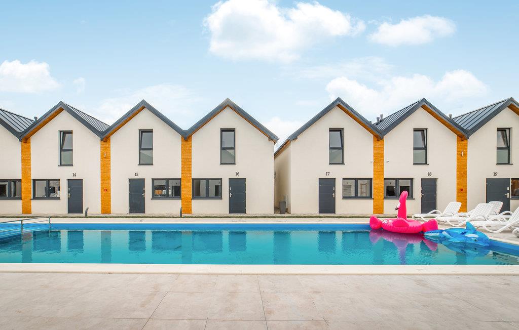 Dette komfortabelt møblerede rækkehus ligger i et feriested med yderligere 20 huse. En stor, delt og indhegnet ejendom er tilgængelig for jer. Hvert hus er udstyret med en grill og havemøbler, en privat terrasse og have. I stueetagen er der en rummelig stue med et veludstyret køkken og et badeværelse. På 1. sal er der 2 komfortable soveværelser og et toilet. Der er aircondition i hvert hus for ekstra komfort på varme sommerdage.