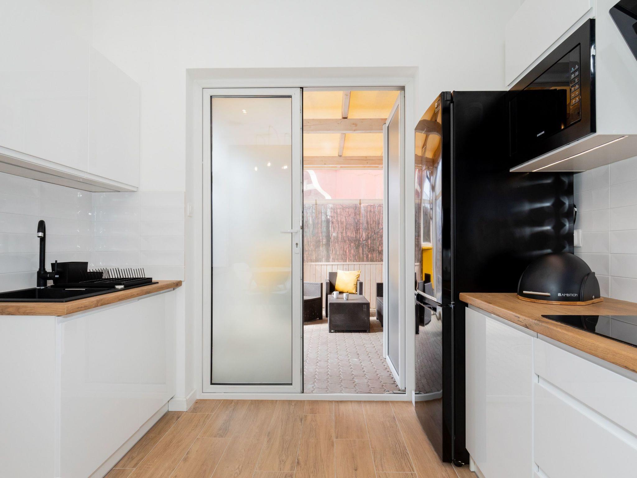 Designed with the utmost comfort in mind, the flat's interior spans the ground floor with an interesting level difference between the living room and the rest of the house. The kitchen charms with its full equipment: here you will find an induction hob, fridge, dishwasher, microwave and overflow coffee machine, as well as a full set of plates, glasses and cutlery. An elegant dining table with chairs completes this space, right next to the living room and bedroom, where satellite TVs are at guests' disposal and sleeping comfort is provided by a sofa bed for two and twin beds. The bedroom offers additional spaciousness, and a large mirrored wardrobe completes the hallway. The bathroom is equipped with a comfortable shower and hairdryer, providing an unparalleled level of comfort.