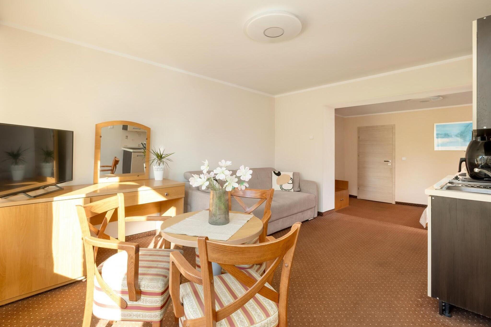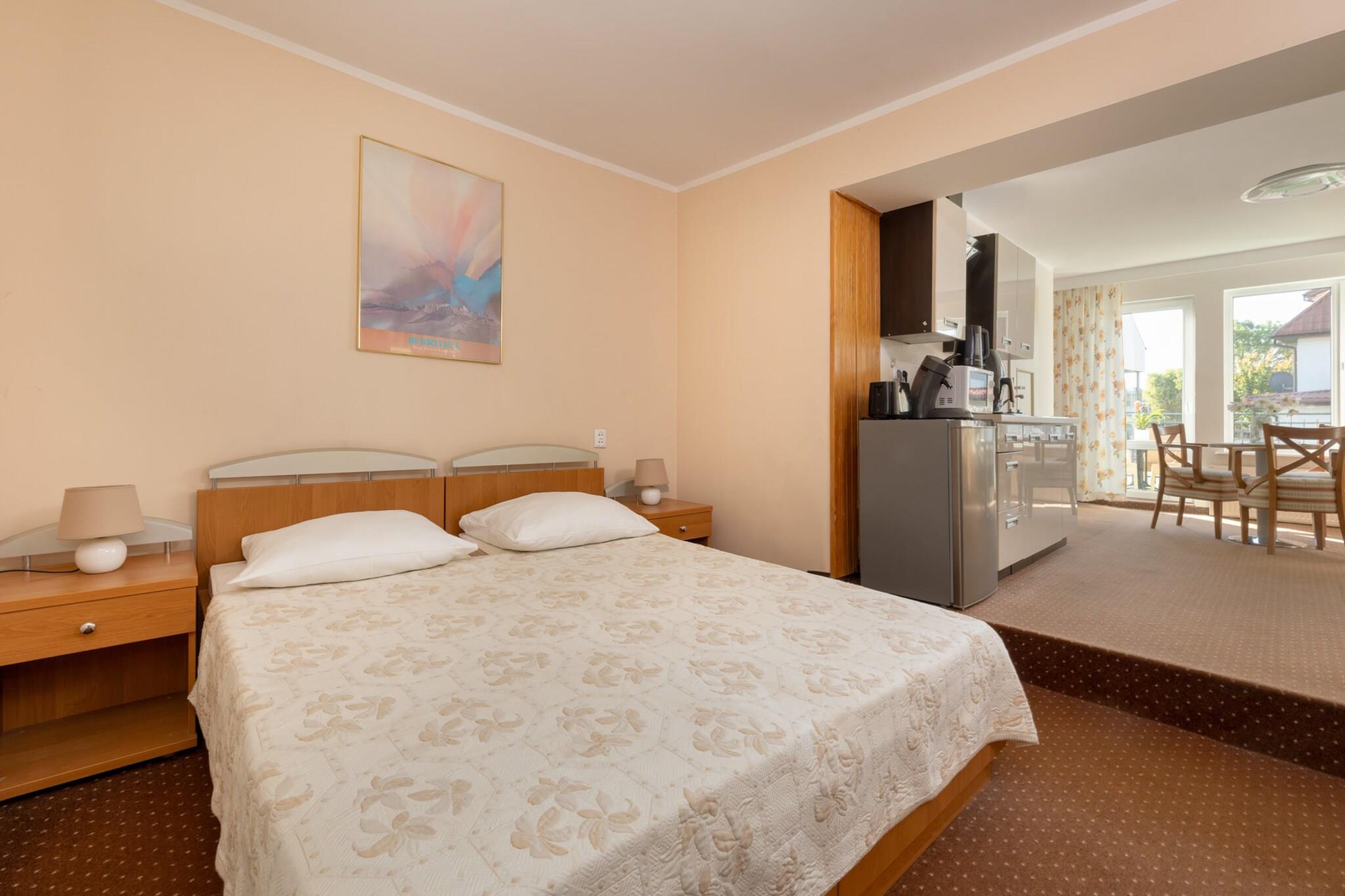 En intim lejlighedsbygning i et roligt område, i centrum af feriestedet. 300 m til stranden Restauranter, caféer, butikker og alle feriestedets attraktioner ligger inden for få skridt. Studielejlighed på første sal. Det har en stor, indhegnet terrasse med et sæt havemøbler. Gæsterne har til deres rådighed et åbent rum bestående af et opholdsområde (tv, dobbelt sovesofa, bord), et veludstyret køkken og et separat soveværelse med en komfortabel dobbeltseng. Badeværelse med bruser. Centralvarme. Trådløst internet er tilgængeligt. I det indhegnede område ved siden af bygningen er der en parkeringsplads, et havepavillon og en offentlig grill. Der er en intim restaurant/bar i stueetagen. Her serveres morgenmad og aftensmad i form af en buffet. Du kan også bestille frokoster (flere attraktive muligheder hver dag). Prisen for opholdet inkluderer: sengelinned, håndklæder, el- og vandforbrug, internet, parkering, slutrengøring. Barneseng og høj stol på forespørgsel. Rewal er en charmerende badeby. Det tilbyder turister en ren strand og en uforglemmelig udsigt fra klipperne ved havet. Der er en fiskebase her, perfekt som baggrund for souvenirbilleder. Du skal se byens symbol: de mægtige Rewal Whales på promenaden ved siden af udsigtsplatformen. Børn vil blive glade for et besøg i Hvalparken, med ægte havgiganter. En tur til det store Sandra vandland i nabolandet Pogorzelica vil være fantastisk underholdning for hele familien. Byens stolthed er den renoverede smalsporede jernbane, som giver dig mulighed for at tage på en charmerende tur til nærliggende feriesteder.