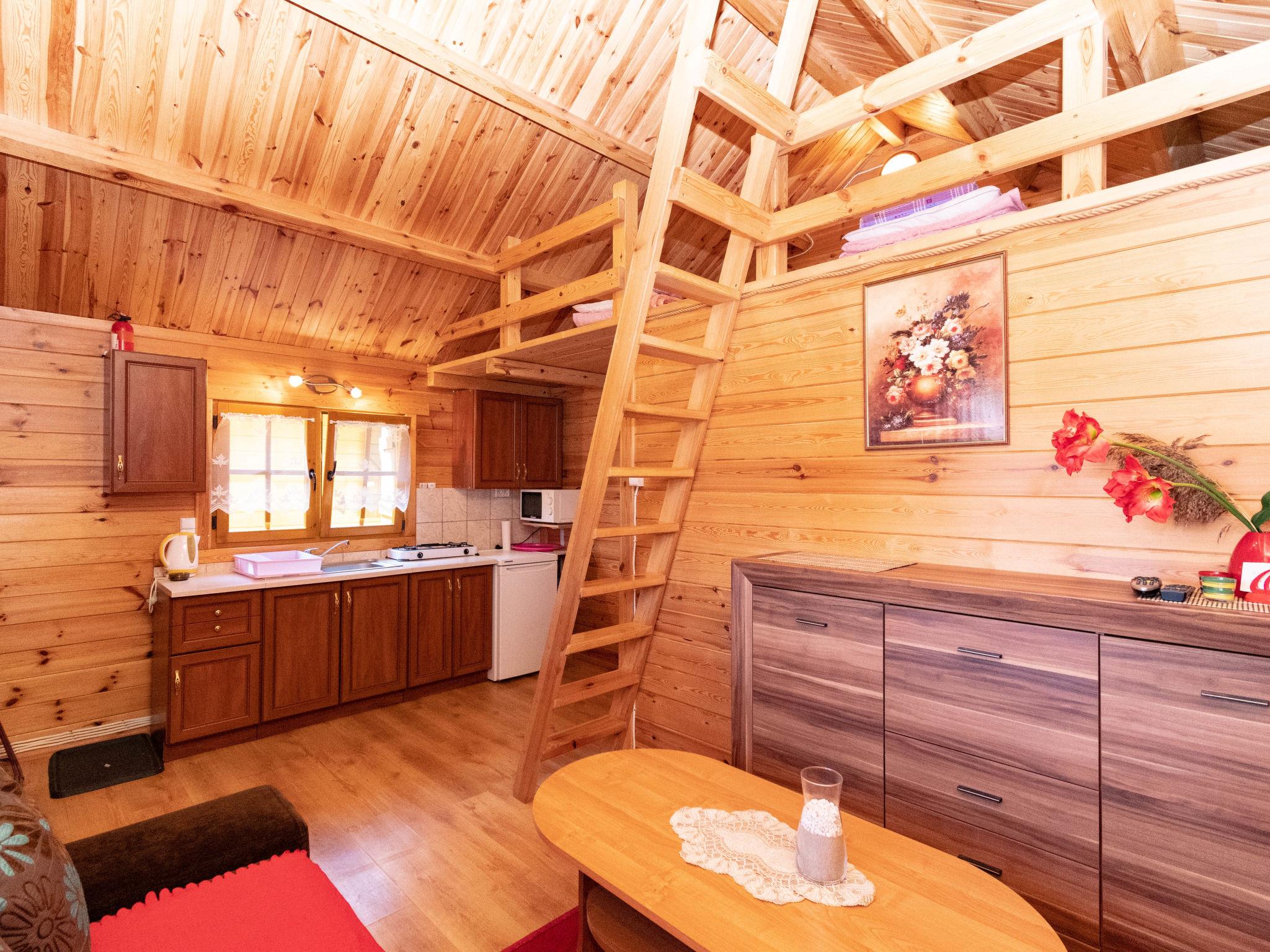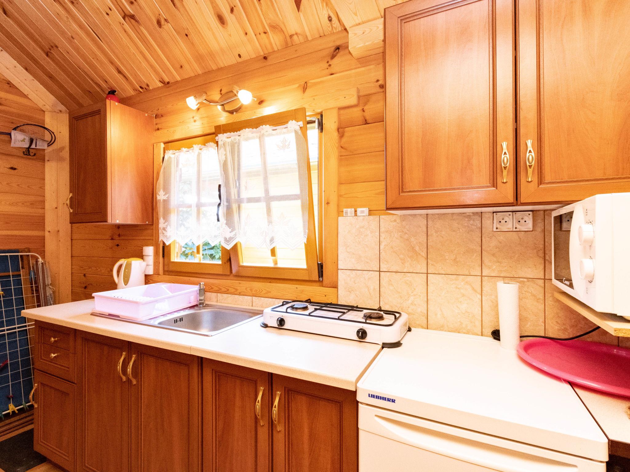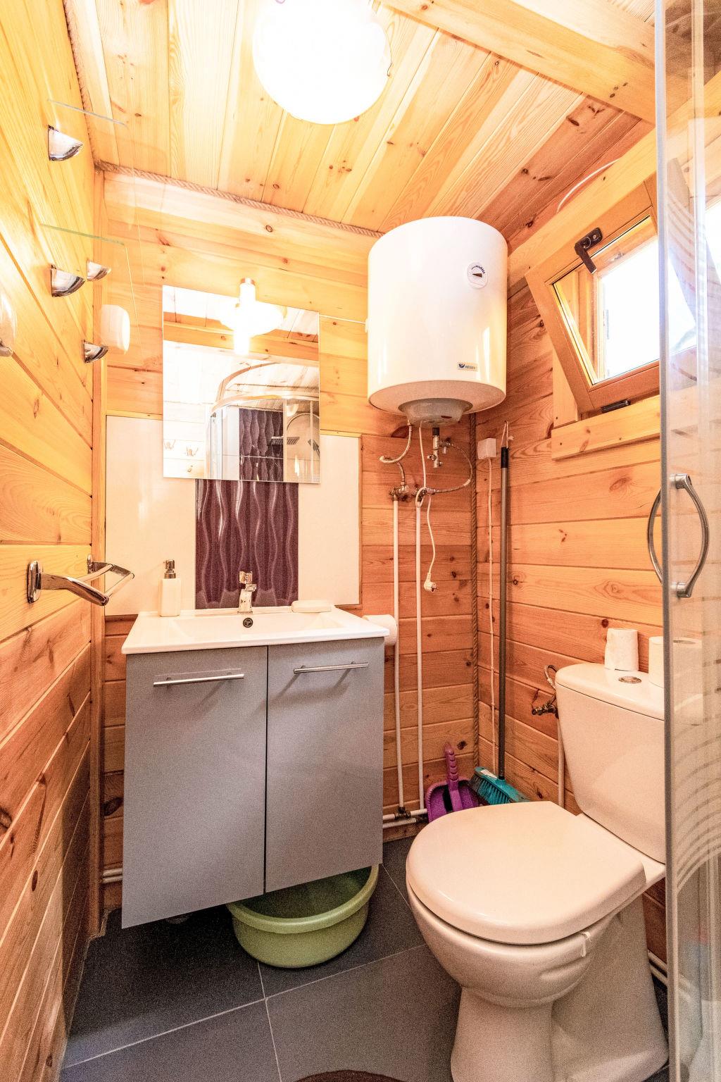 3-room house 35 m2 on 2 levels. Comfortable and cosy furnishings: living/sleeping room with 1 sofabed and satellite TV. Exit to the terrace. 1 room with 1 french bed. Open kitchen (2 ceramic glass hob hotplates, microwave, grill) with dining nook. Shower/WC. Heating, electric heating, boiler (80 litres). Top floor: (ladder) open gallery with sloping ceilings with 2 sleeping facilities. Terrace 10 m2. Terrace furniture, deck chairs (2). View of the resort. Facilities: dryer, iron, hair dryer. Internet (WiFi). Parking at the house. Please note: smoke alarm. The cottages may differ in the type of beds and kitchen equipment (double beds 140 cm or 2 single beds, kitchen equipped with a dining corner or table, gas stove or ceramic hob). Instead of an enclosed bedroom, some sleeping areas are located in an open-plan area (gallery, alcove, etc.).