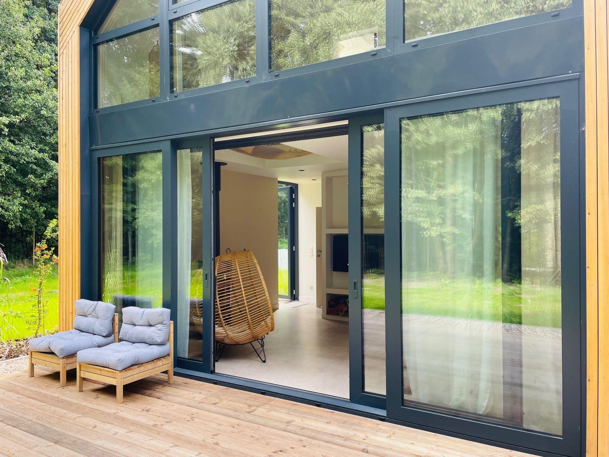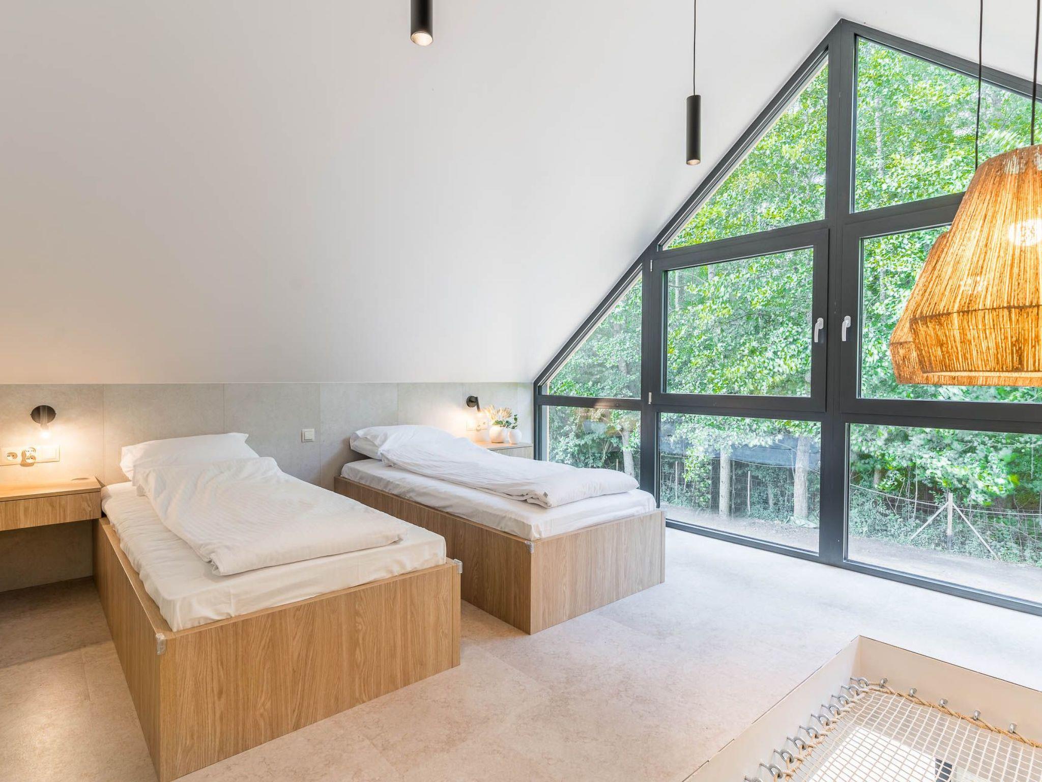 One bedroom is furnished with 2 single beds and a unique openwork relaxation area with a panoramic window facing the forest. The second bedroom, on the other hand, features a large double bed together with a private free-standing bathtub and a dressing table with mirror and a view of the garden and the stream.