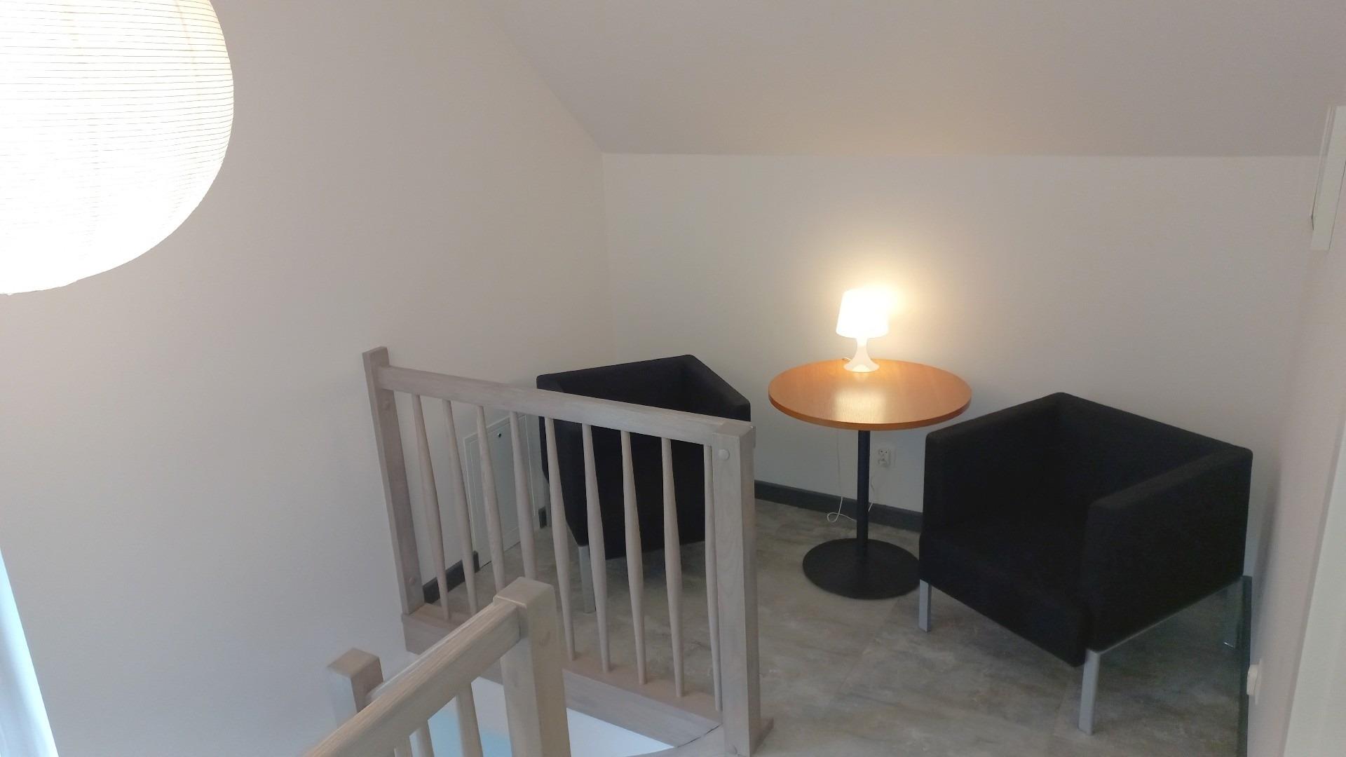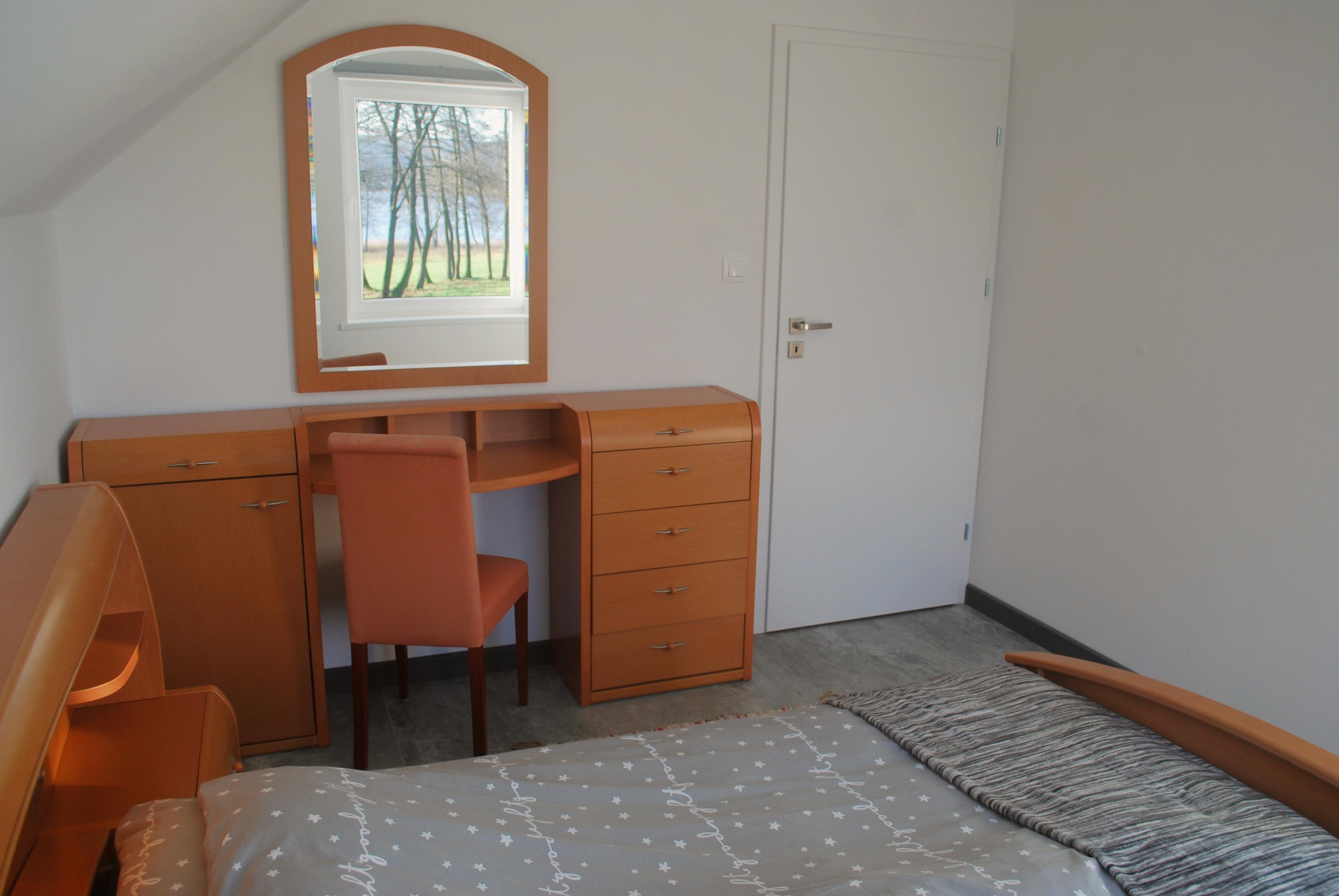 Eine offene Treppe zum Boden, wo Sie 2 Schlafzimmer und ein Badezimmer mit Dusche, Waschbecken und zweite Toilette finden. 1 Schlafzimmer mit Doppelbett und 1 Schlafzimmer mit zwei Einzelbetten. Kleiderschrank und Nachttisch in jedem Zimmer. Landung mit Stauraum (eventuell für 5. Bett in Absprache).