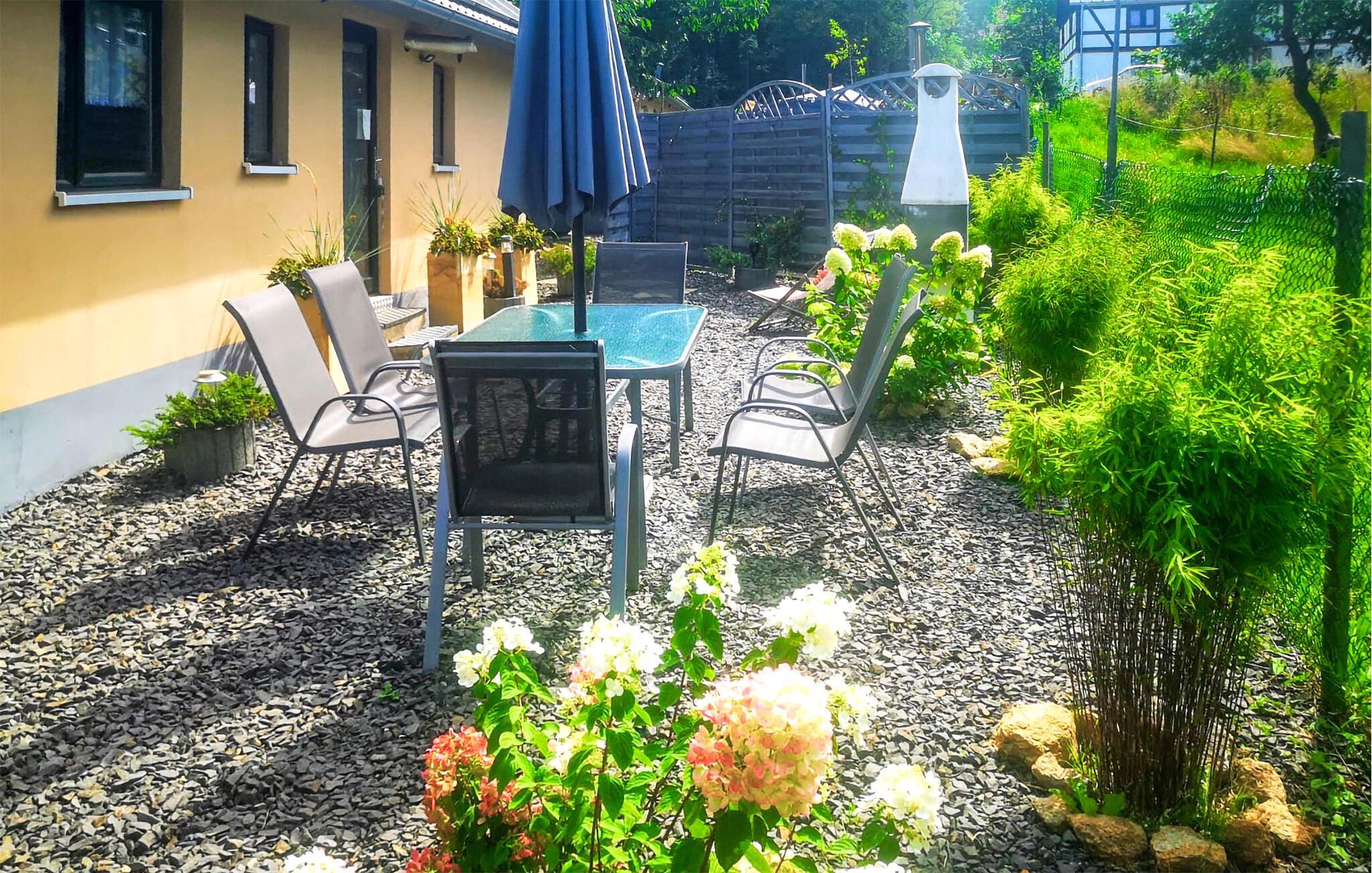 Gå udenfor og slap af på den velholdte terrasse med havemøbler og grill. Lad blikket vandre over haven eller nyd jeres fritid i wellness-området. Få varmen i den fælles sauna eller forkæl jer selv med en pause i det hyggelige vildmarksbad.