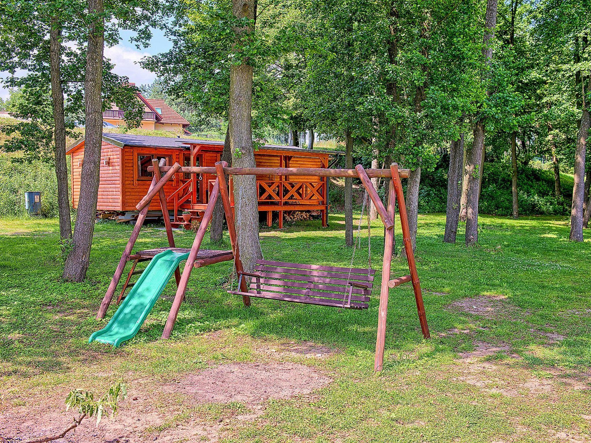 The covered terrace has garden furniture. Directly next to the cottage there is a children's playground with a swing, sandpit and a fireplace. The cottage is equipped with a coal-fired barbecue. The cottage borders the forest and is 10 metres from the lake.