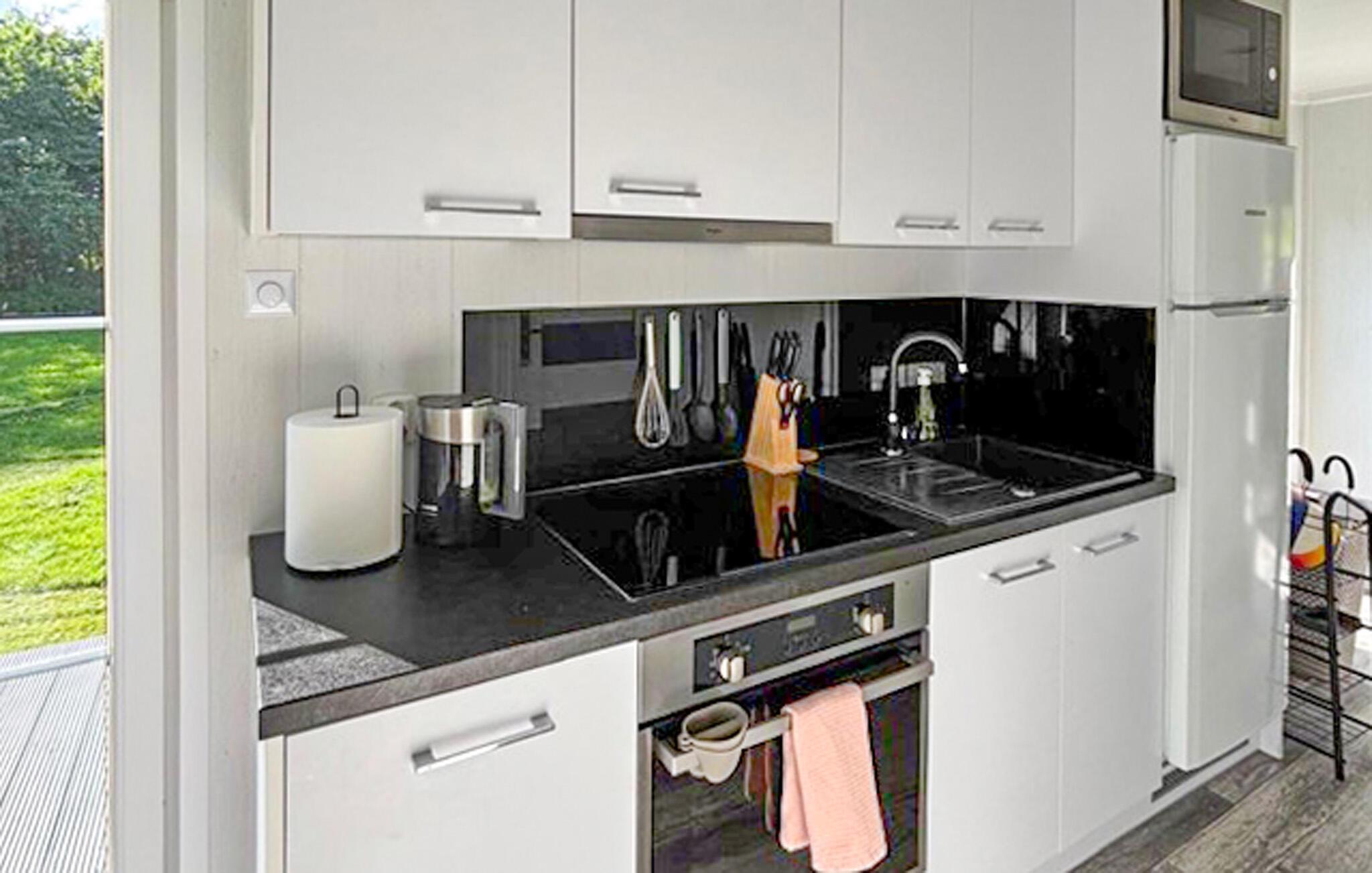 Nyd afslappende dage i dette stilfulde feriehus, der kombinerer moderne komfort med naturlige omgivelser. Fyld dagene med hyggestunder, hvor I er par eller familie – her finder I den ideelle blanding af afslapning, aktivitet og komfort. Træd ind i den lyse opholdsstue og føl jer straks hjemme. Brug det lille køkken til at tilberede måltider sammen og spis ved spisebordet med udsigt over den frodige have. Gør det behageligt i sofaen og nyd den rolige atmosfære, der forstærkes af store vinduer og varme farver.