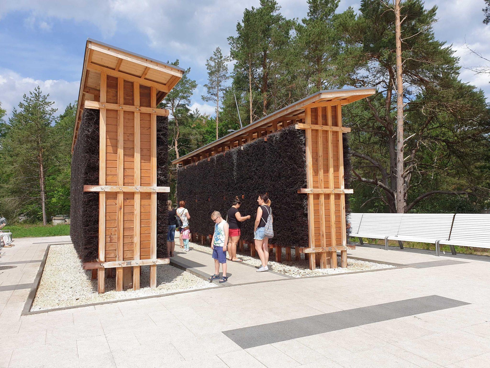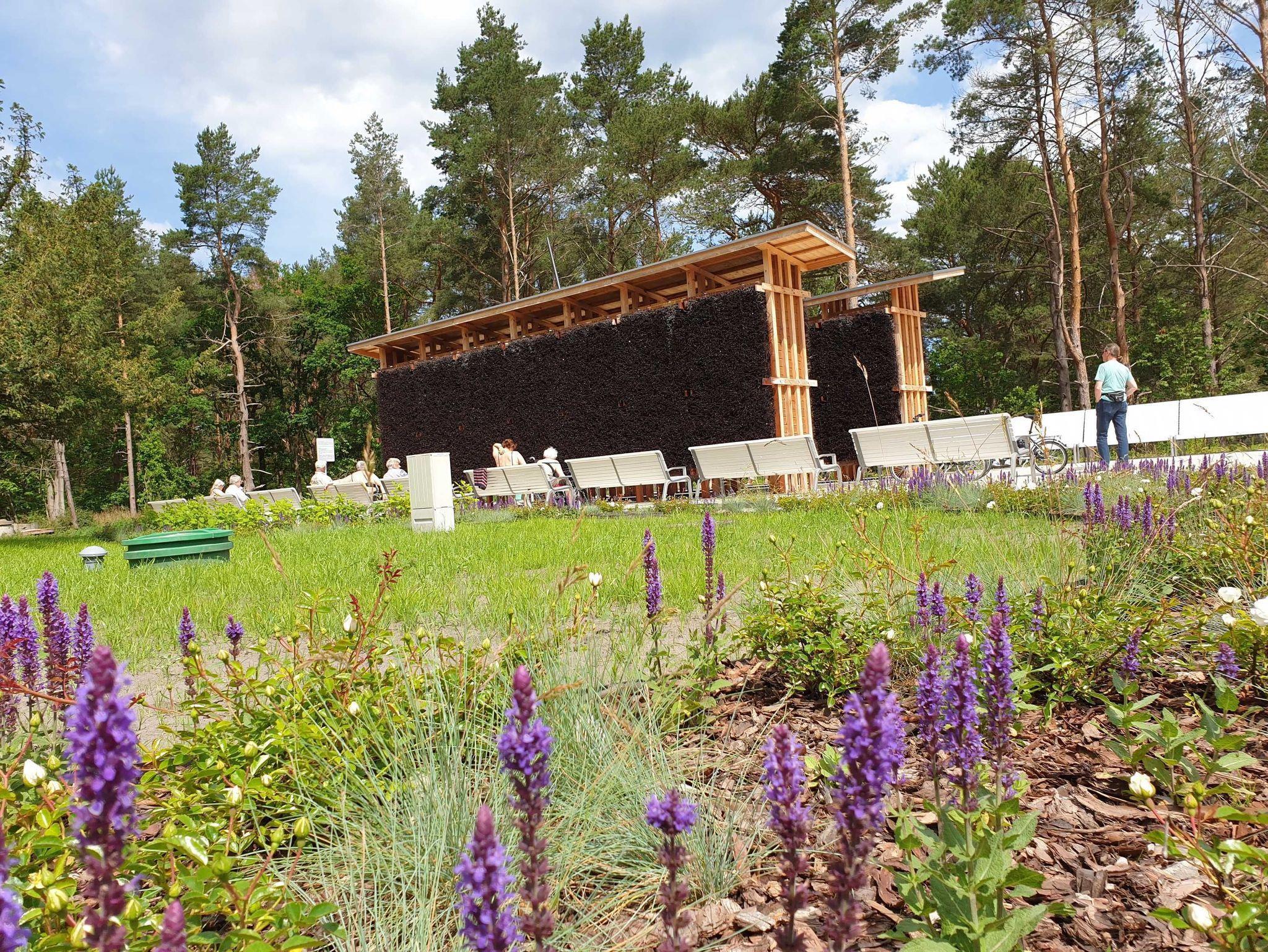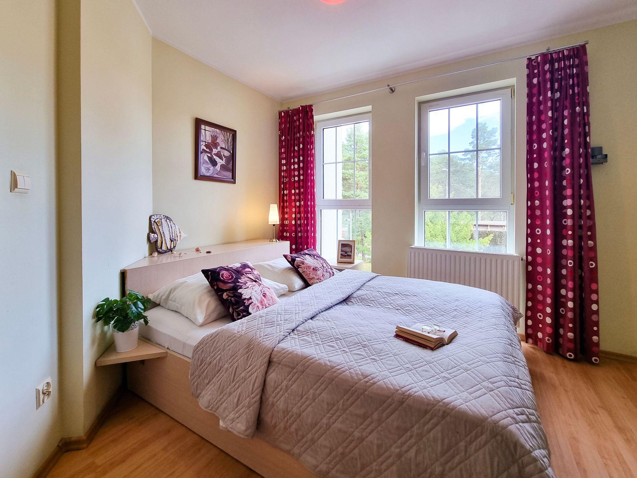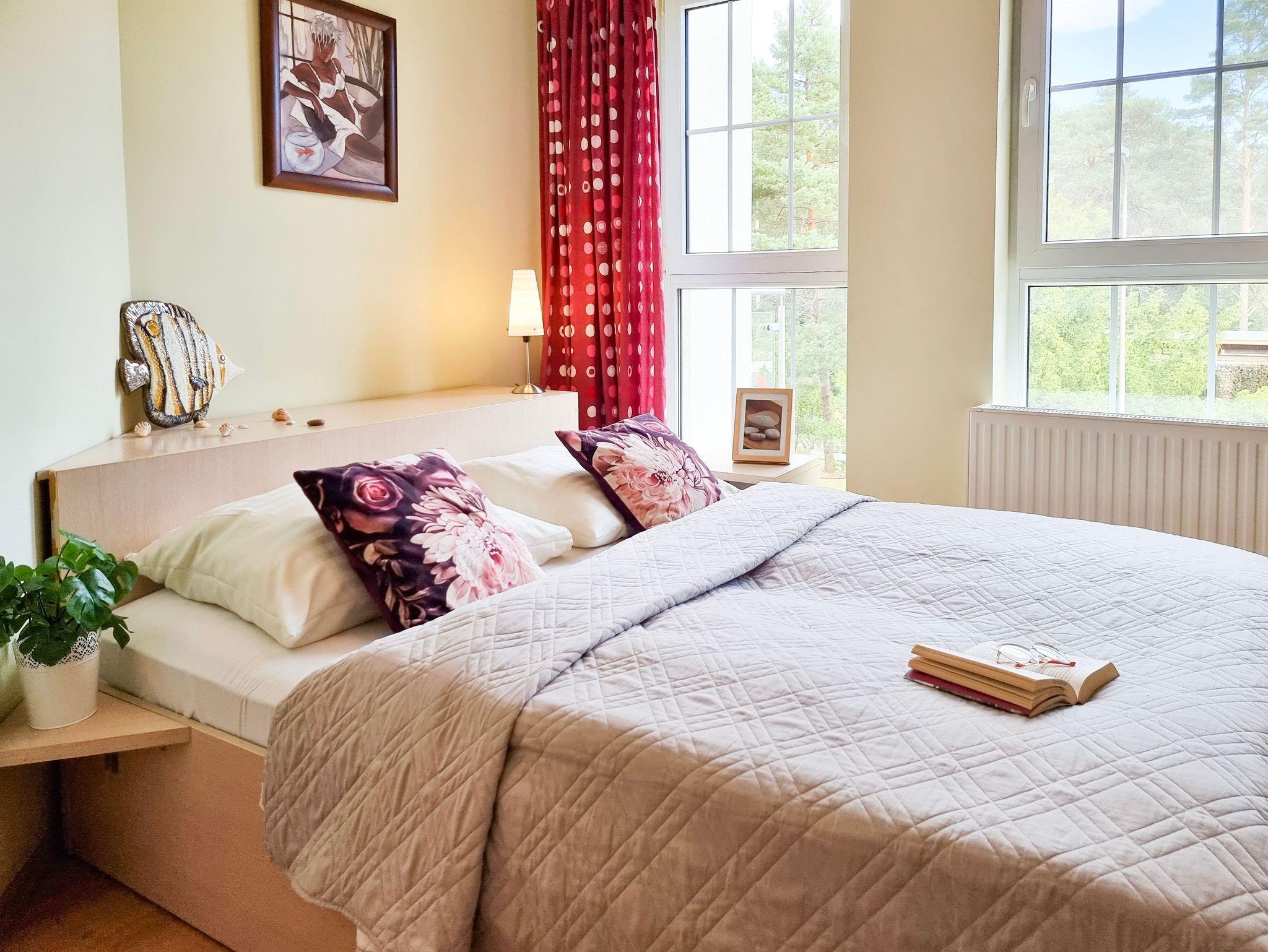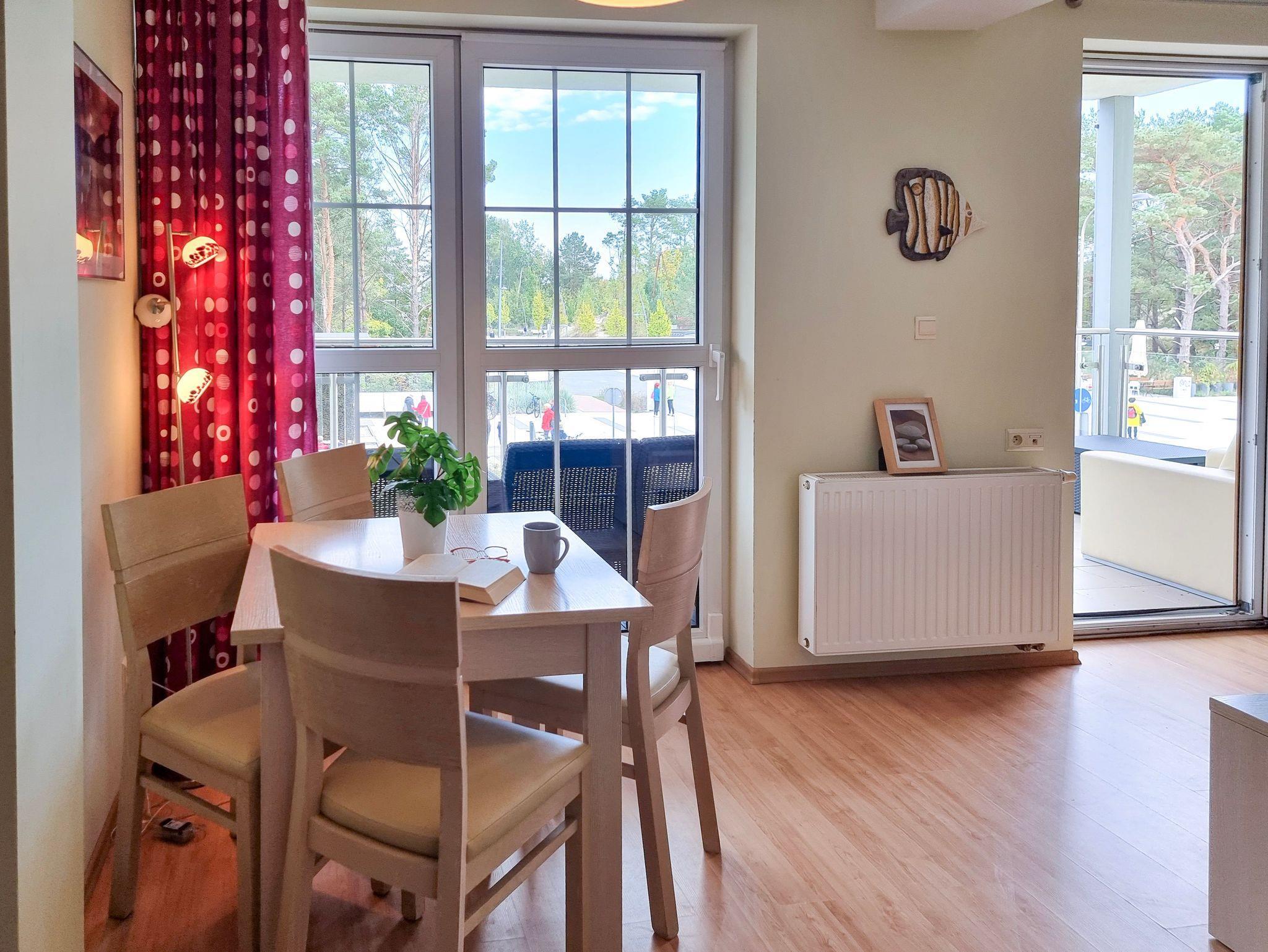 Das Wohnzimmer mit Küchenzeile und großem Balkon (zur Nordseite gerichtet, mit direkten Blick auf die Gradierwerke), es ist ebenfalls mit einem Schlafsofa, einem Tisch mit 4 Stühlen und einem LCD-Fernseher ausgestattet.