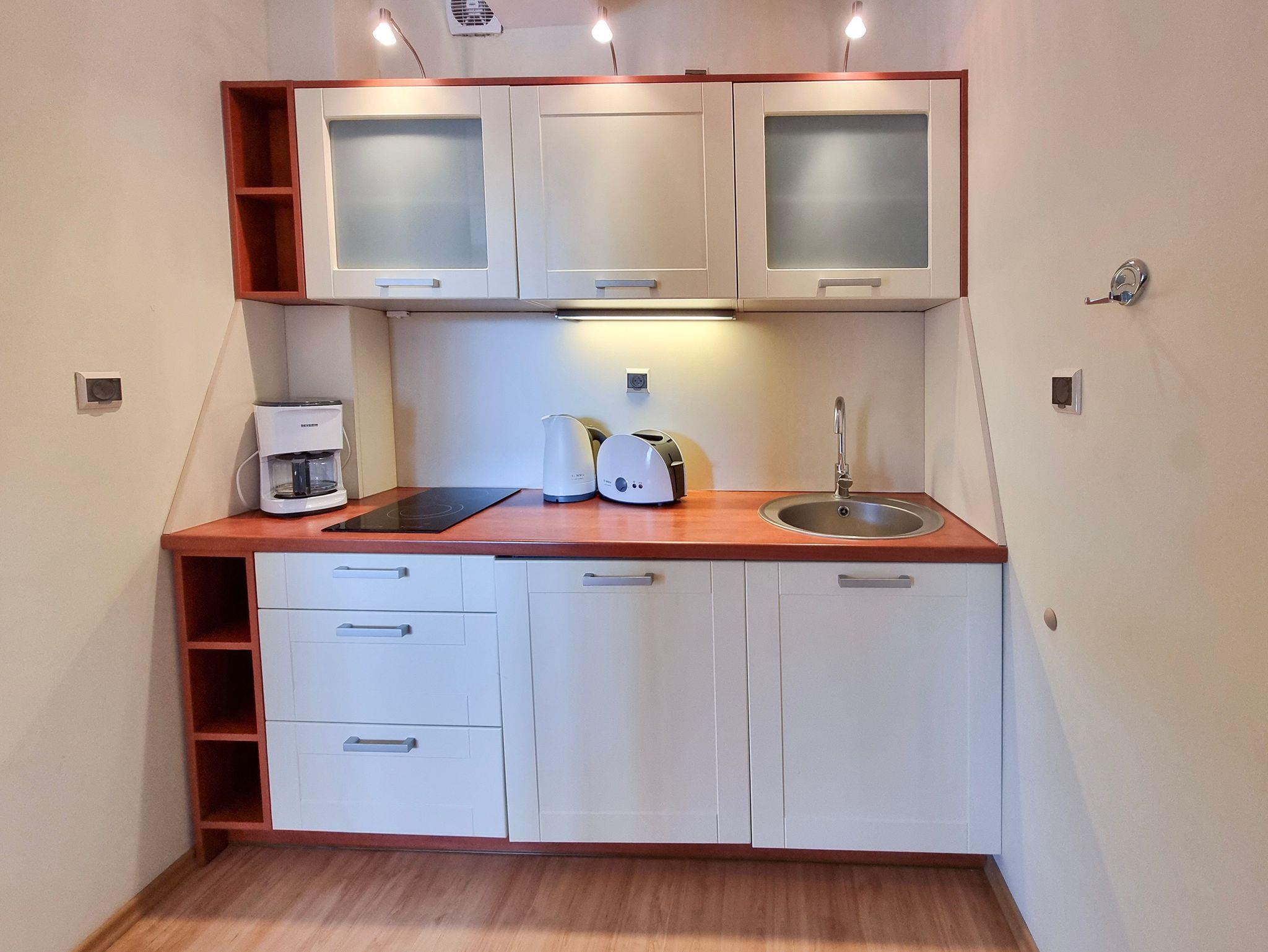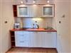 Die Küchenzeile ist mit notwendigen Geschirr und Besteck für die Zubereitung und den Verzehr von Mahlzeiten ausgestattet, ebenfalls mit einem Elektroherd mit 2 Heizflächen, Unterbaukühlschrank, Toaster, einer Überlauf-Kaffeemaschine und einer Doppelkammerspüle.