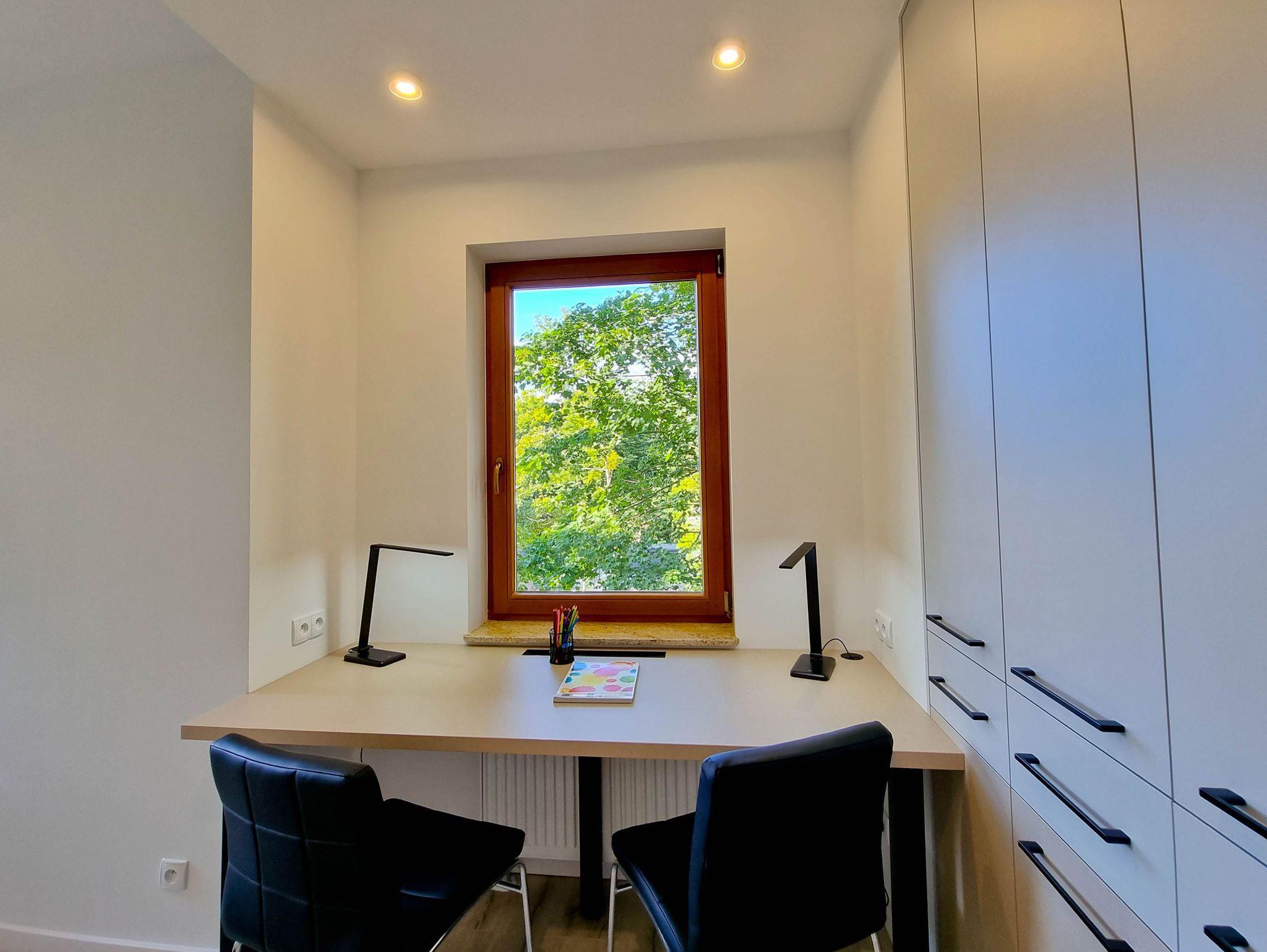 Das Wohnzimmer ist als Lounge-Bereich eingerichtet. Es gibt ein ausklappbares Ecksofa mit Schlaffunktion (Fläche nach dem Ausklappen 140x200cm), einen Couchtisch und ein Fernsehgerät, das den Empfang von polnischen und deutschen terrestrischen Sendungen ermöglicht. Das Zimmer hat auch einen Esstisch mit 6 Stühlen. Die Küchenzeile ist mit den notwendigen Küchenutensilien, Wasserkocher, Backofen, Geschirrspüler, Toaster, Mikrowelle und Dunstabzugshaube ausgestattet. Die Fenster des Wohnzimmers und des Balkons blicken auf die Südseite, von wo aus man einen Blick auf die grüne Wand des an die Sienkiewicz-Residenz angrenzenden Waldes hat.