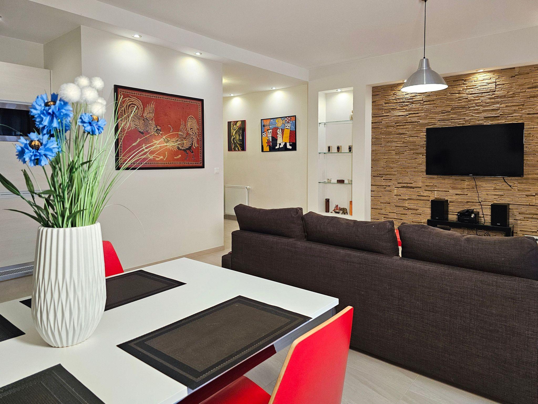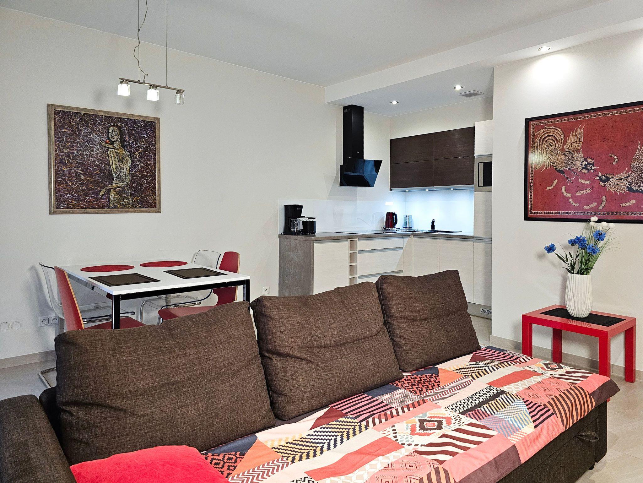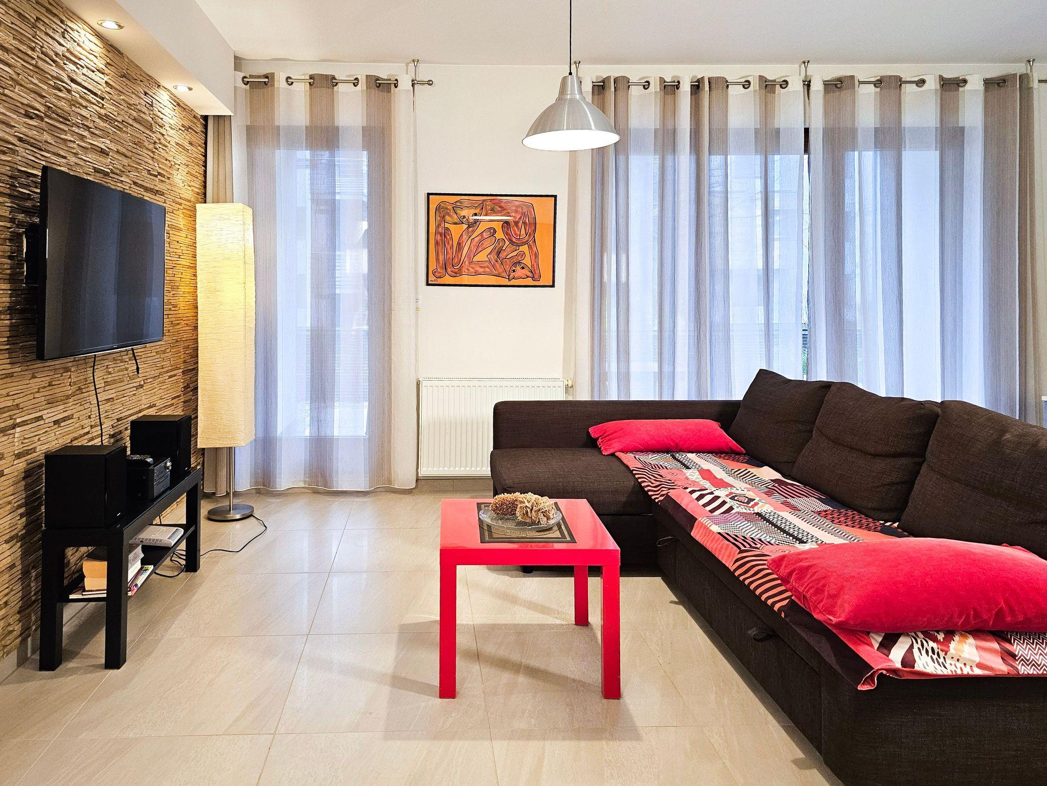 Das Wohnzimmer verfügt über einen Sitzbereich, mit einem Ecksofa mit Schlaffunktion (nach dem Ausklappen 140x200cm), einen Couchtisch, LCD-Fernseher, der den Empfang polnischer und deutscher Sender ermöglicht.