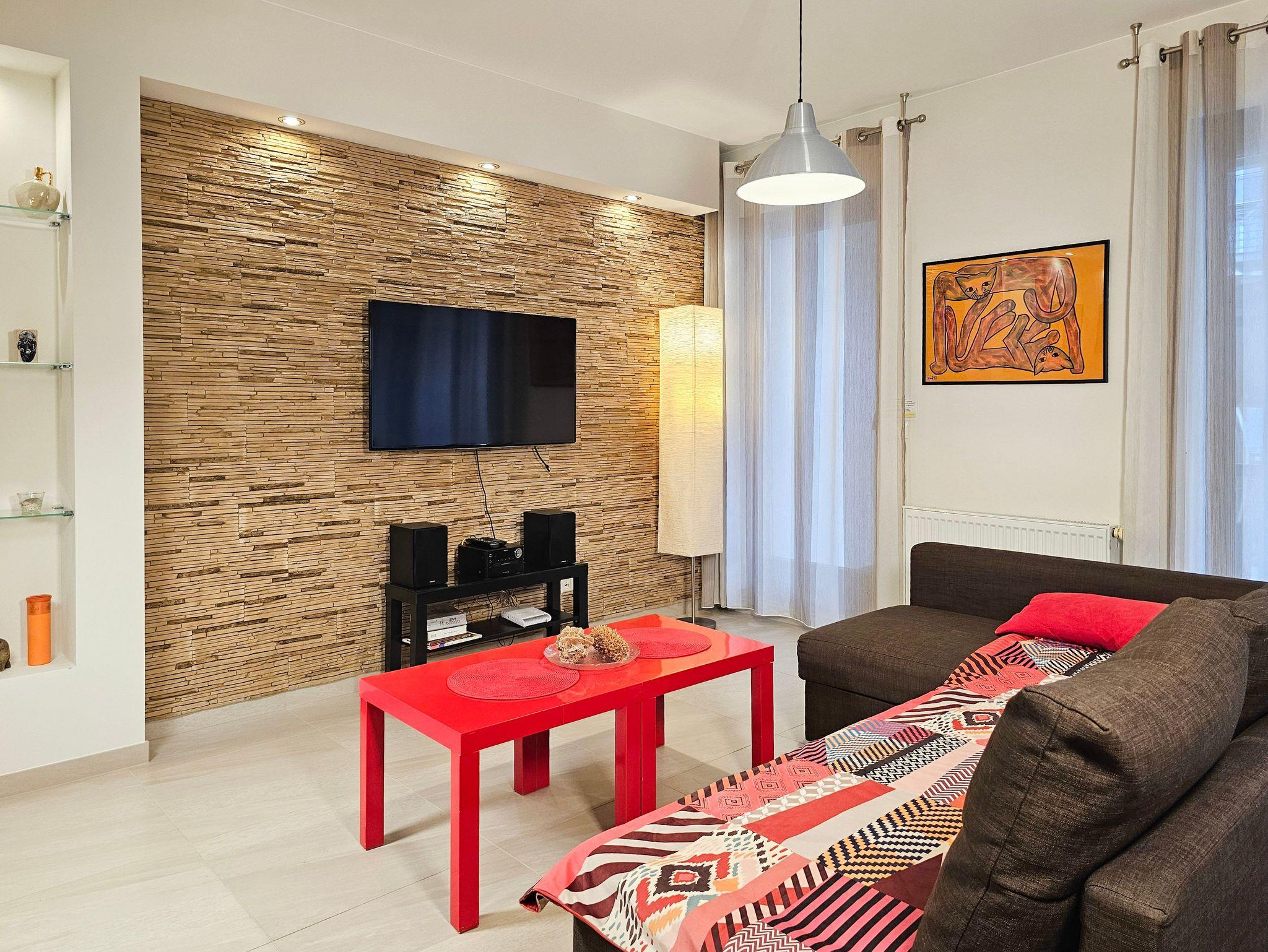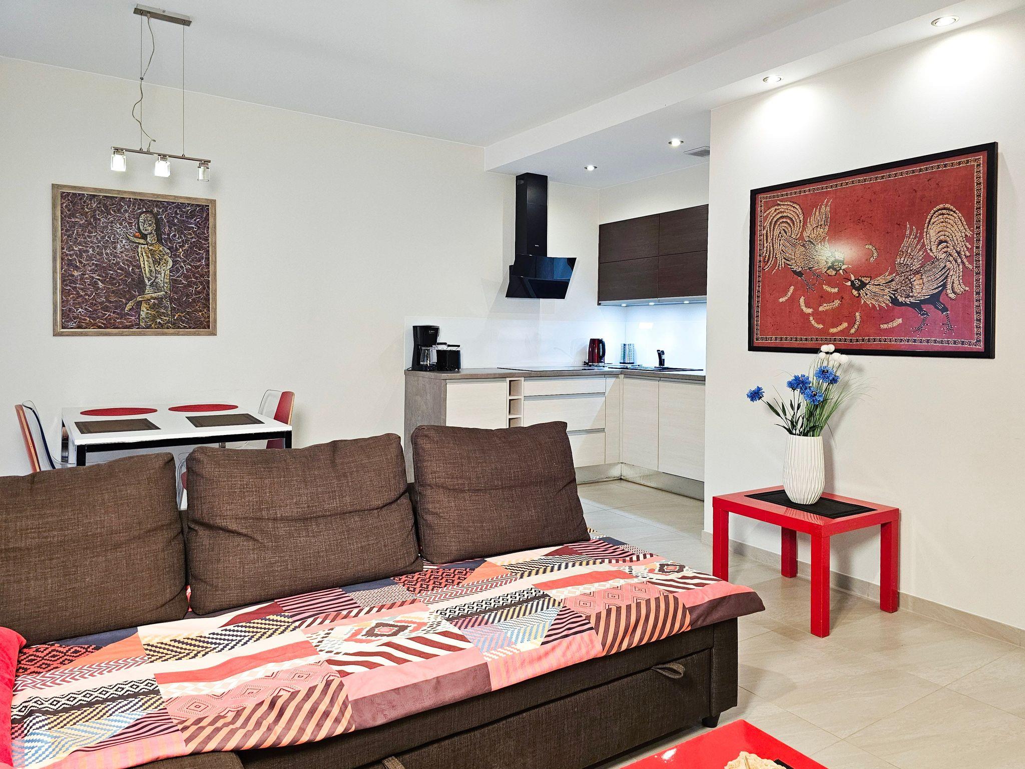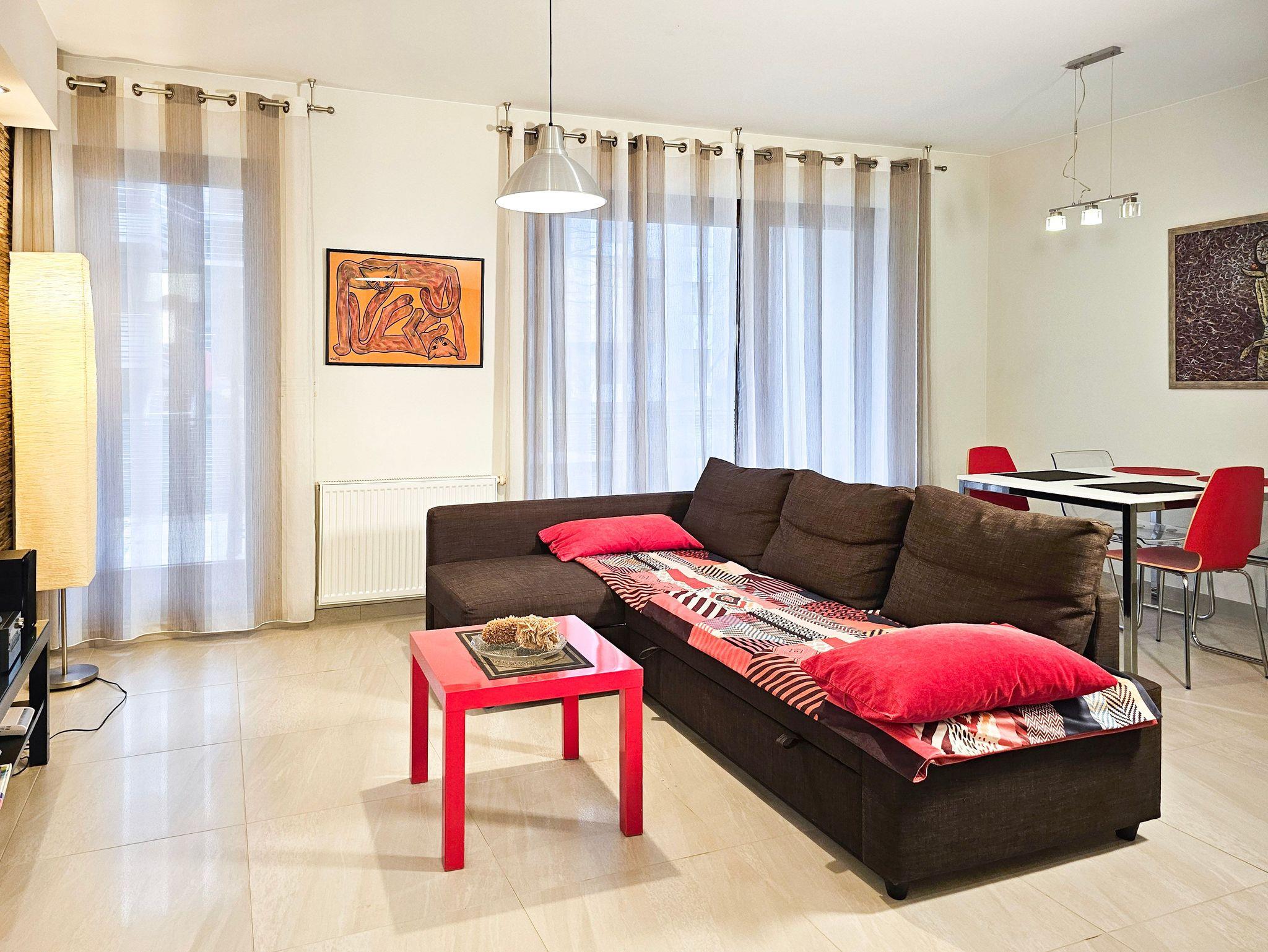 Das Wohnzimmer verfügt über einen Sitzbereich, mit einem Ecksofa mit Schlaffunktion (nach dem Ausklappen 140x200cm), einen Couchtisch, LCD-Fernseher, der den Empfang polnischer und deutscher Sender ermöglicht.