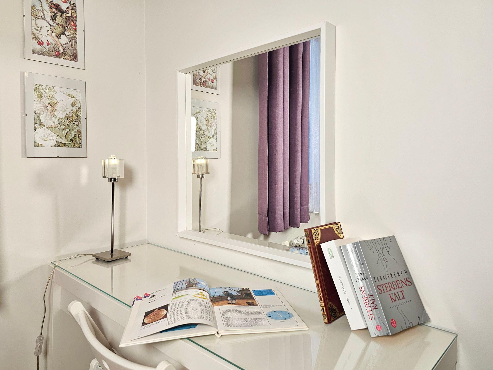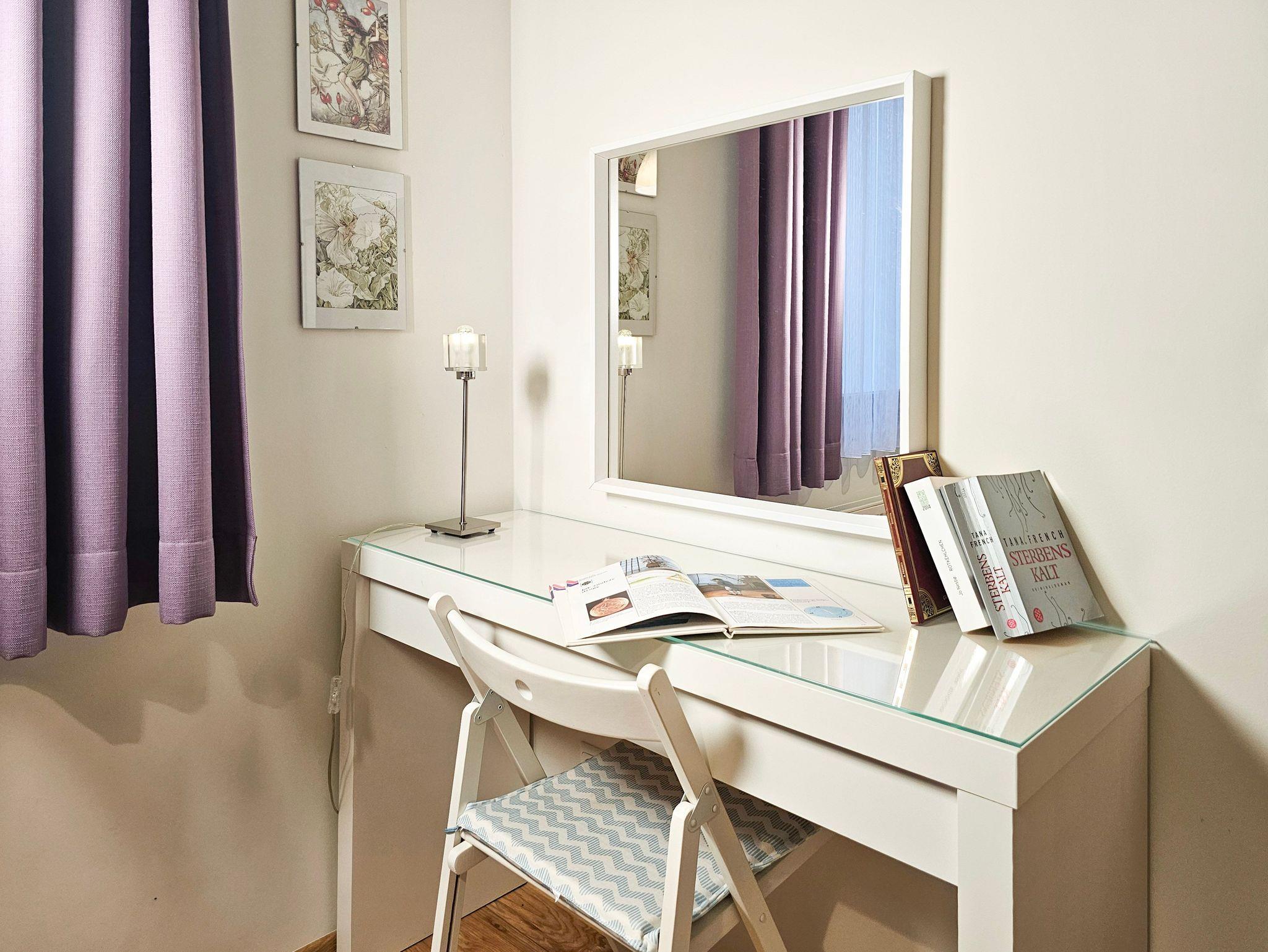 Im Schlafzimmer steht ein Doppelbett, ein großer Kleiderschrank und eine Frisierkommode.