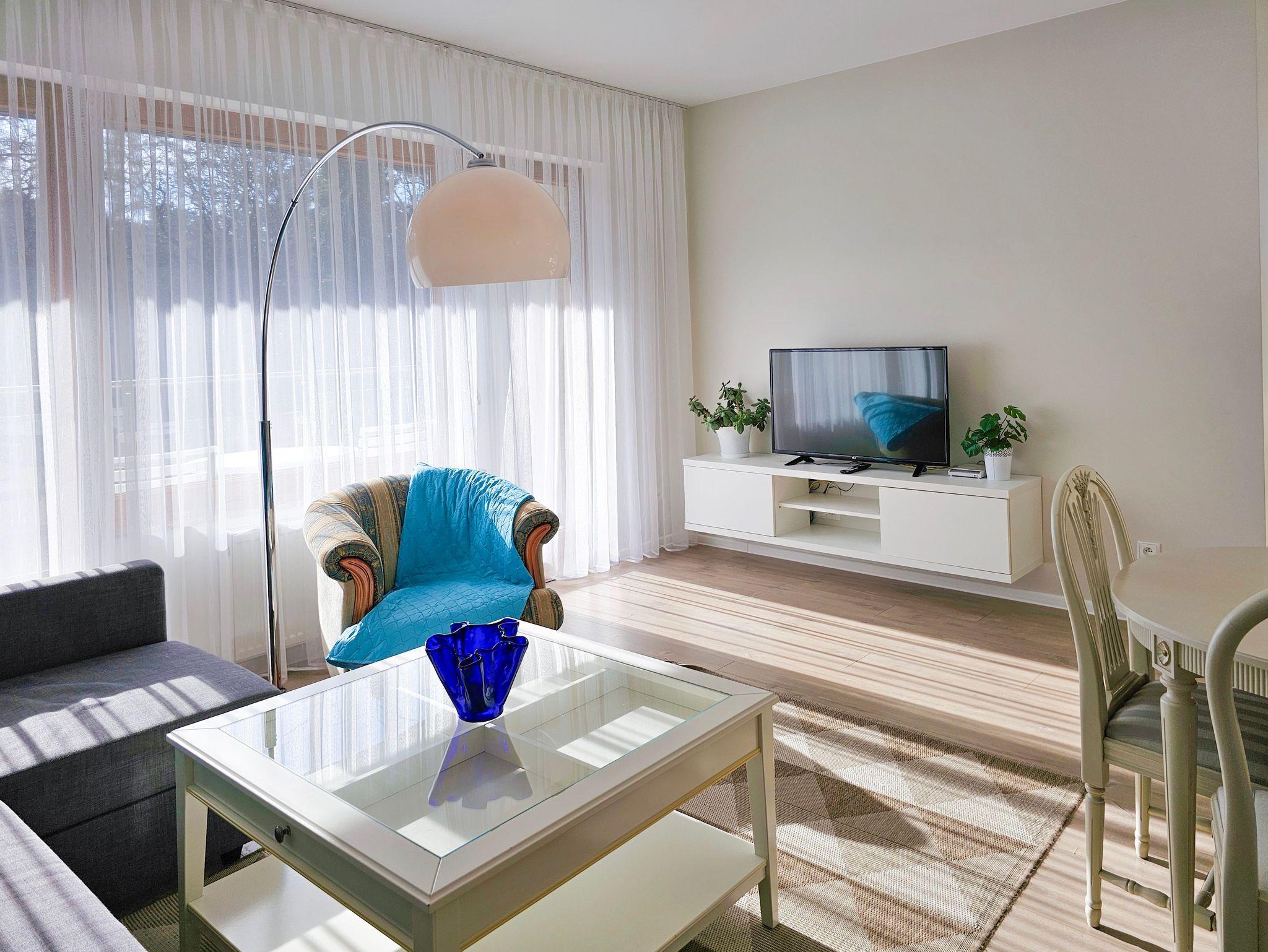 Das Wohnzimmer besteht aus einem ausklappbaren Ecksofa (Fläche nach dem Ausklappen 140x200cm), welches man ebenfalls zum Schlafen nutzen kann, einem Couchtisch, einem Esstisch mit 6 Stühlen und einem Fernseher, der den Empfang polnischer und deutscher Sender ermöglicht.
