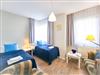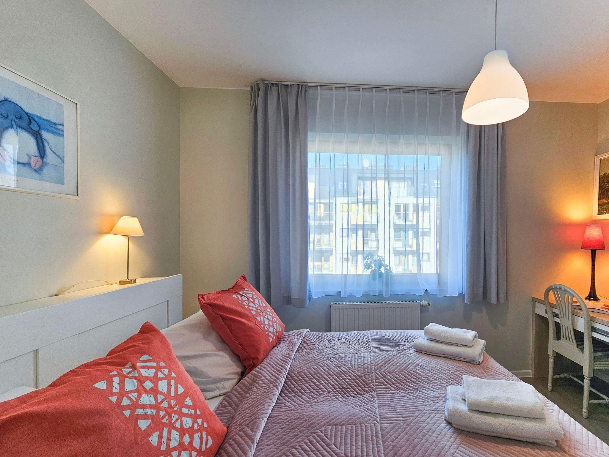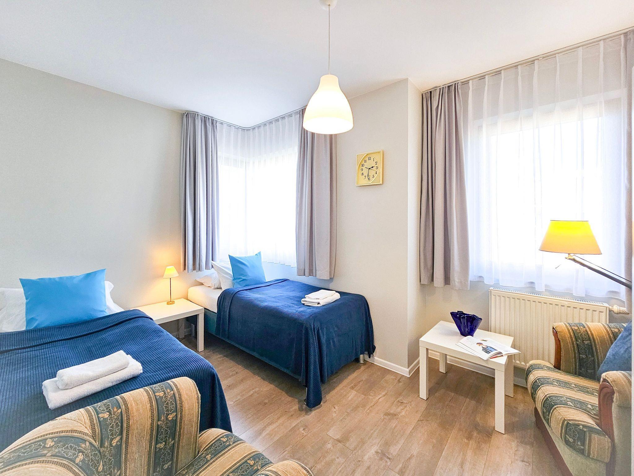 Sie besteht aus zwei Schlafzimmern und einem geräumigen Wohnzimmer mit Balkon. Die Fenster der beiden Schlafzimmer sind nach Norden zum Innenhof gerichtet. Eine Schlafzimmer ist mit einem Doppelbett, Kleiderschrank und einem Nachttisch mit Lampen ausgestattet und ein Frisiertisch, zweite Schlafzimmer mit zwei Einzelbetten.