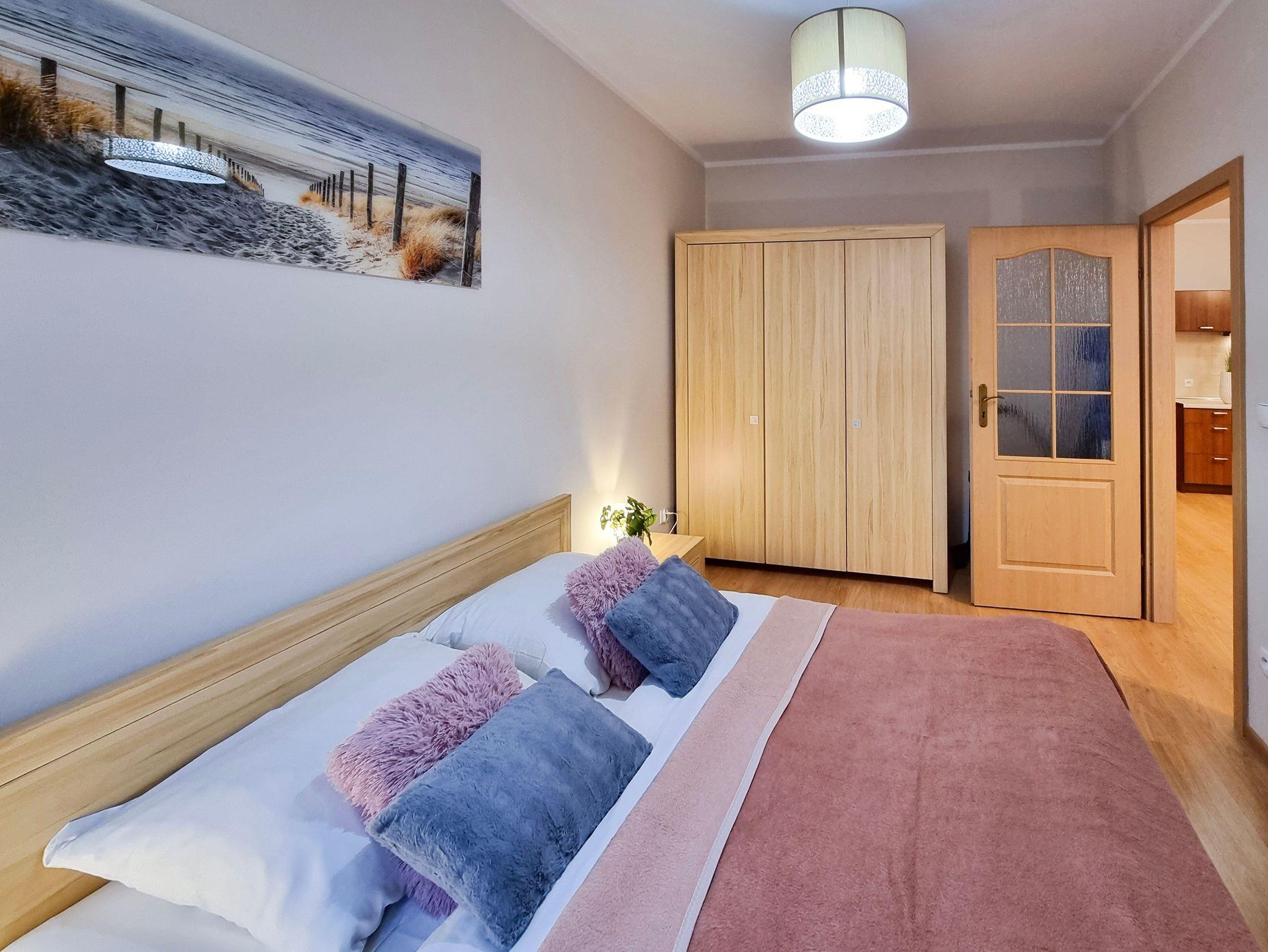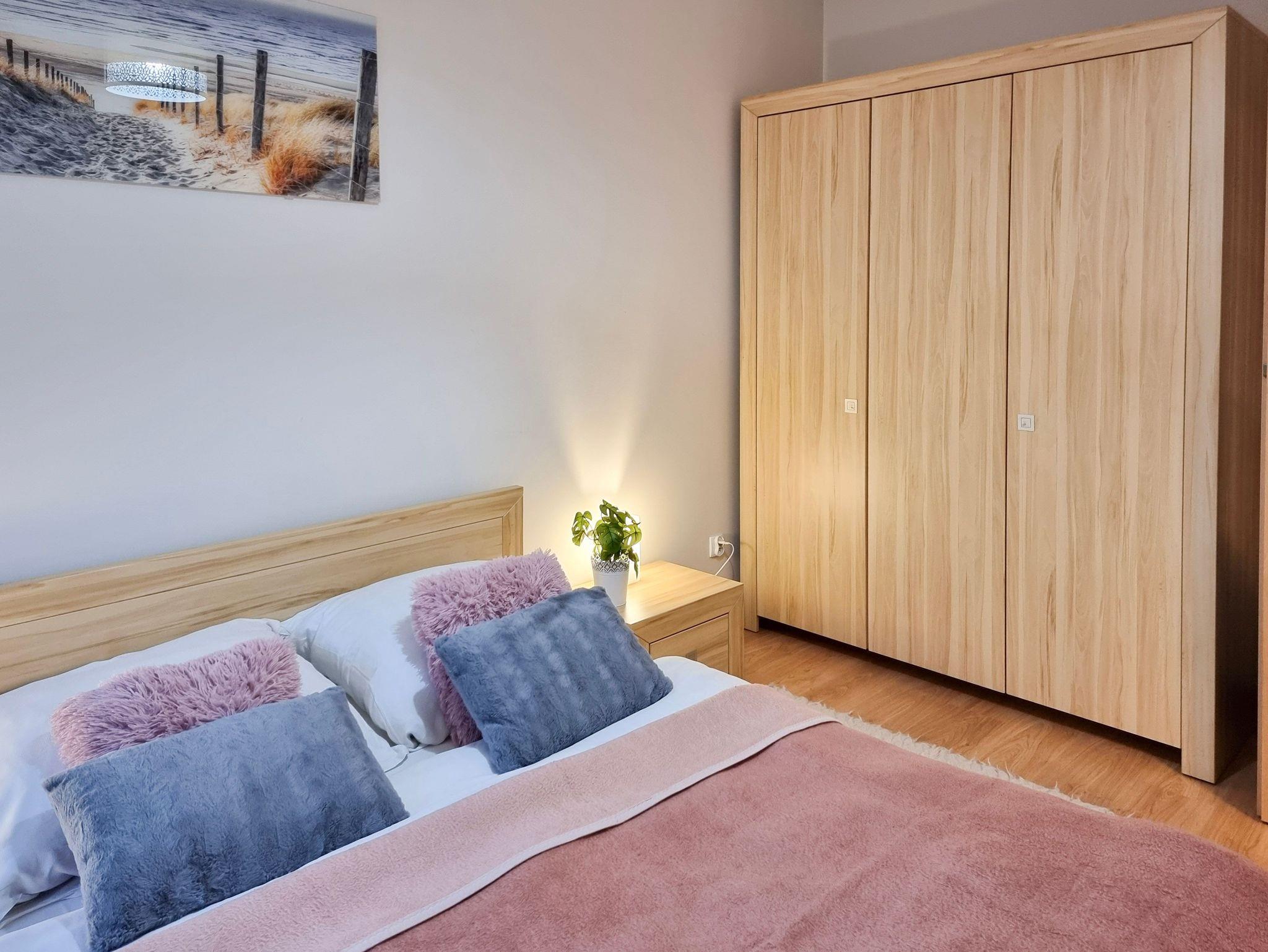 Das Schlafzimmer schafft ein Doppelbett mit einer Liegefläche 160x200cm und 2 Nachttische.