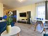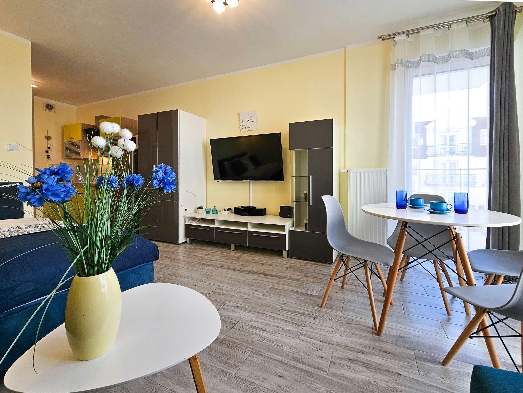 Das Wohnzimmer ist mit einem Doppelbett (160cm x 200cm), einem ausziehbaren Ecksofa, einem Couchtisch, einem Tisch mit 4 Stühlen, einem LCD-Fernseher und einem Kleiderschrank ausgestattet. Der Ausgang zum Balkon ist auf der Nordseite.