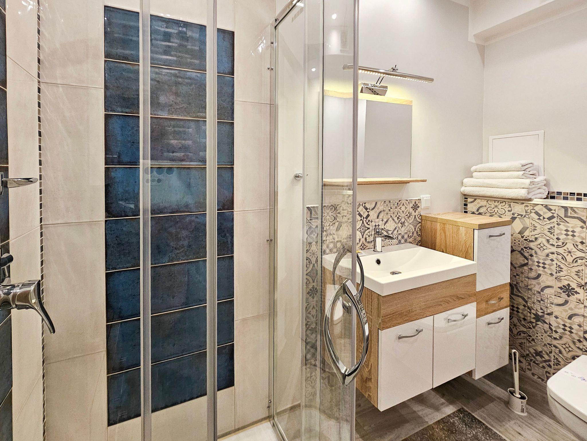Badezimmer mit WC und Dusche und Waschmaschine.
