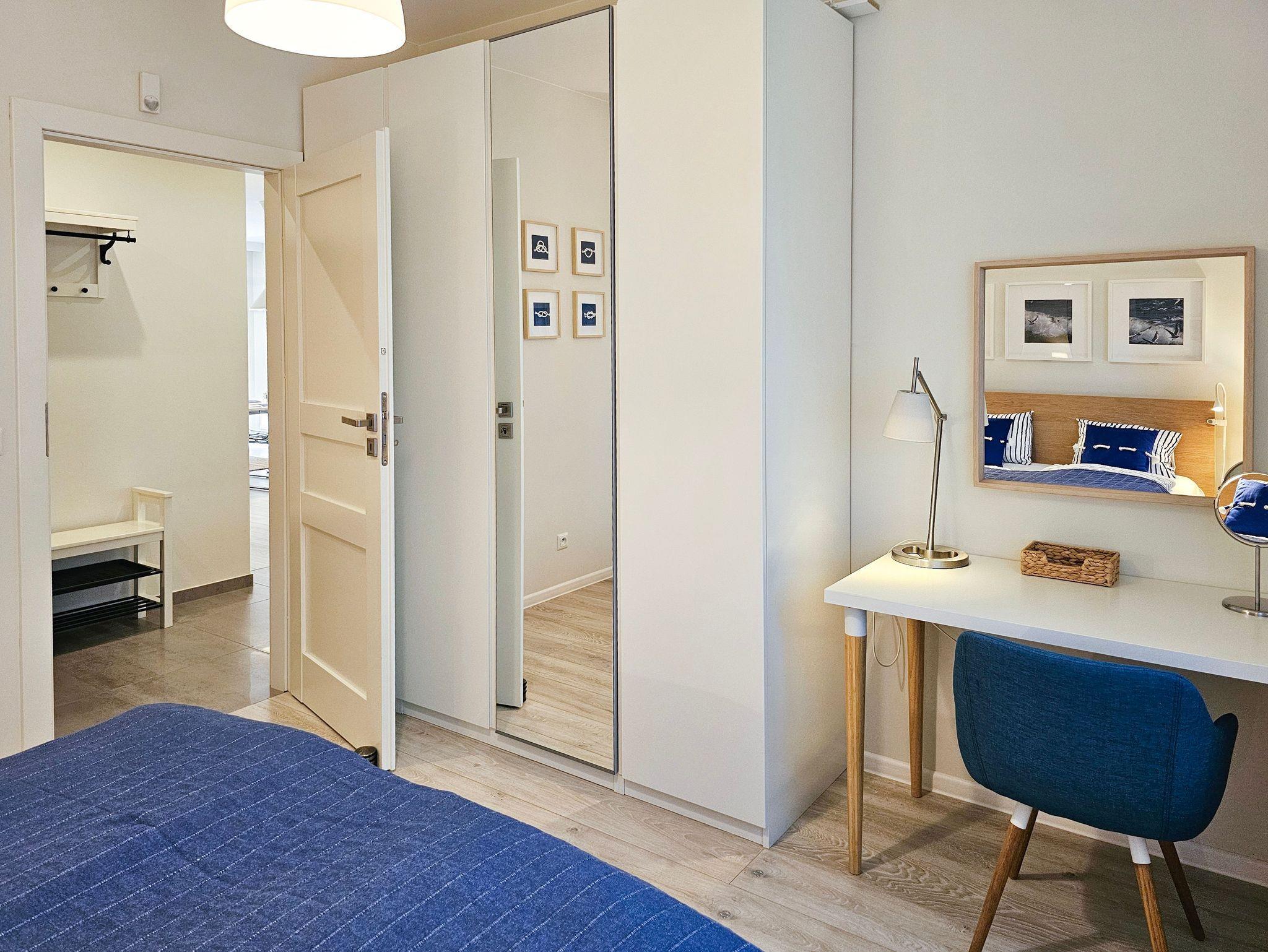 Sie besteht aus zwei Schlafzimmern und einem geräumigen Wohnzimmer mit Terrasse. Die Fenster der beiden Schlafzimmer sind nach Norden zum Innenhof gerichtet. Jedes Schlafzimmer ist mit einem Doppelbett, Kleiderschrank und einem Nachttisch mit Lampen ausgestattet, in einem der beiden befindet sich zusätzlich ein Frisiertisch.