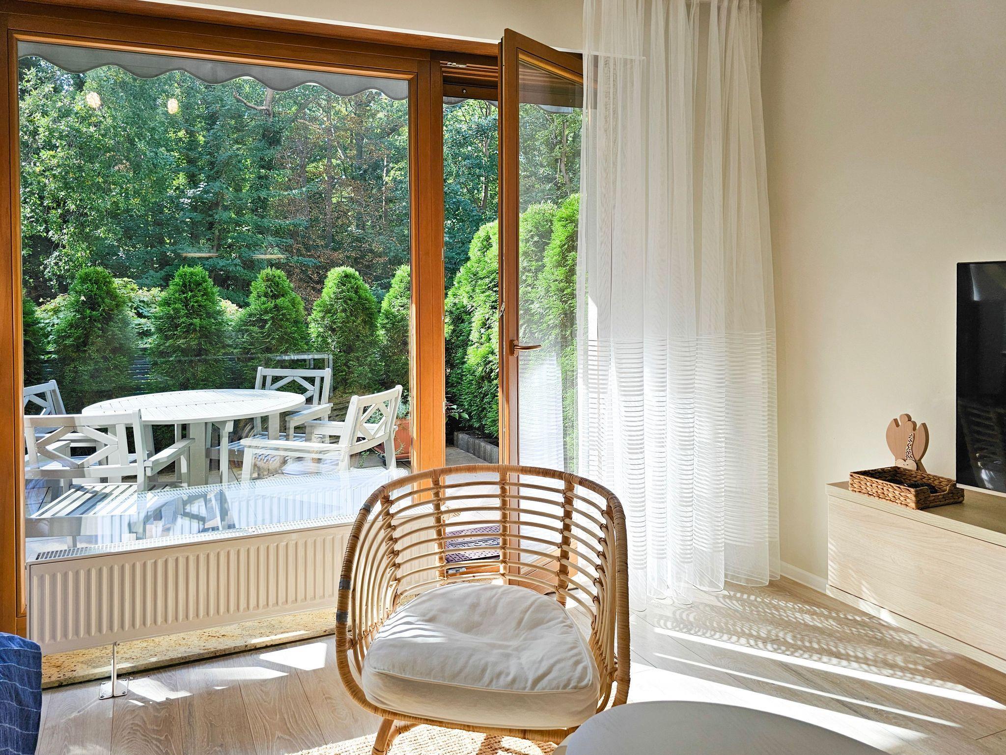 Die Fenster des Wohnzimmers und Terrasse sind nach Süden ausgerichtet, was den Gästen den Ausblick auf den in der Nähe liegenden Wald ermöglicht.