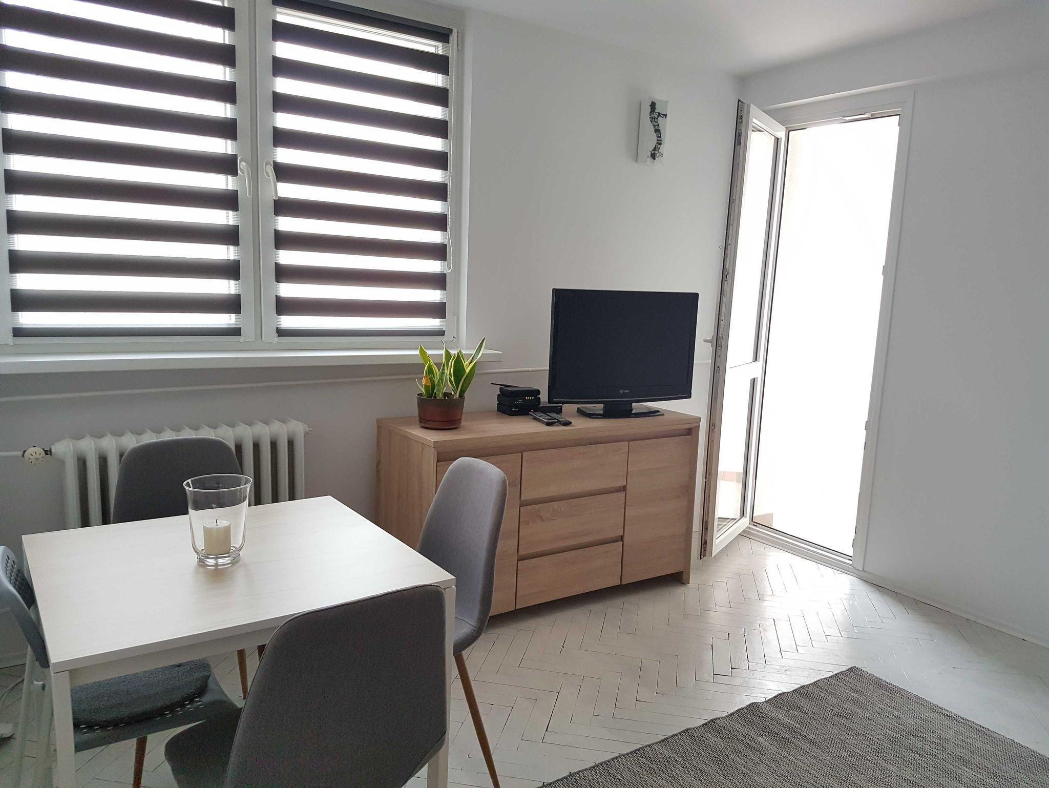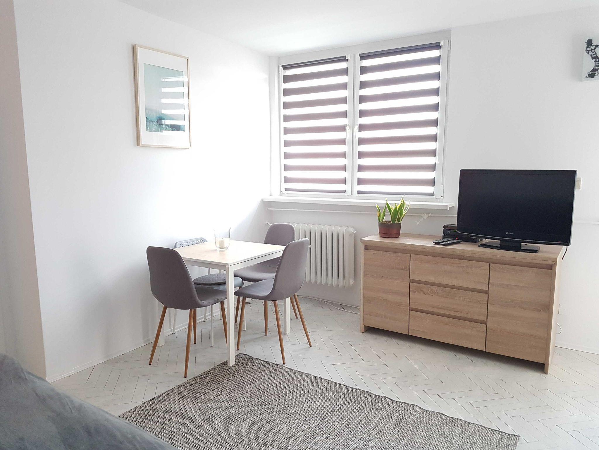 Ferienwohnung mit Schlafzimmer und Wohnzimmer (32 m²) befindet sich im 4. Stock eines Mehrfamilienhauses in der Matejki-Straße (Gebäude ohne Aufzug, Zugang nur über Treppen).
