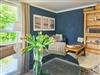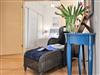 Im Wohnzimmer, von dem aus man auf den Balkon gelangt, stehen den Gästen ein bequemes Sofa (ausgeklappt mit einer Liegefläche von 140×200 cm), ein Couchtisch sowie ein Esstisch mit vier Sesseln zur Verfügung. Die Küchenzeile ist ausgestattet mit einem Kühlschrank, Wasserkocher, Filterkaffeemaschine, Toaster, Mikrowelle und Elektroherd. Zusätzlich steht ein Airfryer zur Verfügung. Die Fenster des Wohnzimmers sind nach Süden und Westen ausgerichtet, der Balkon liegt auf der Südseite.