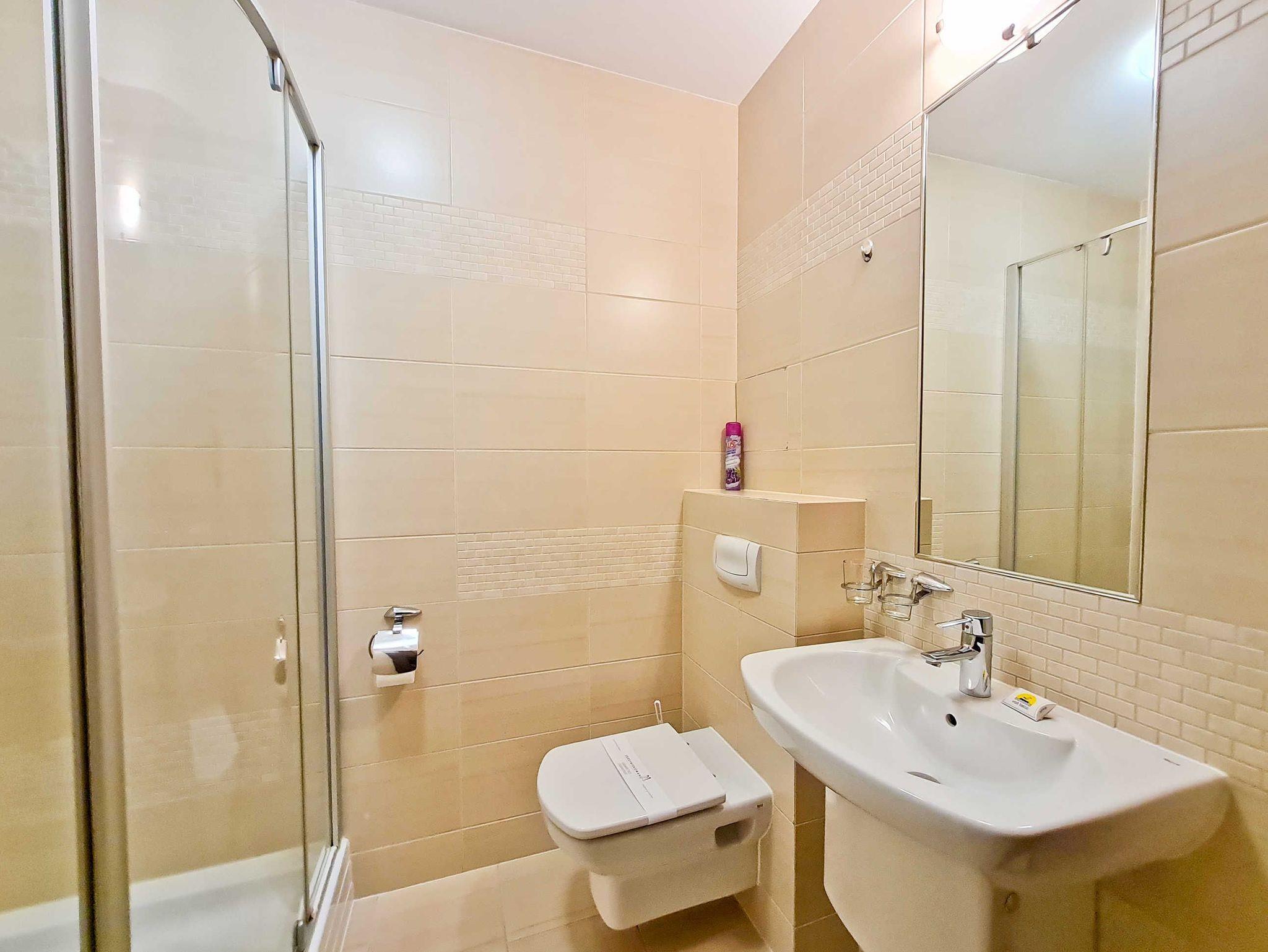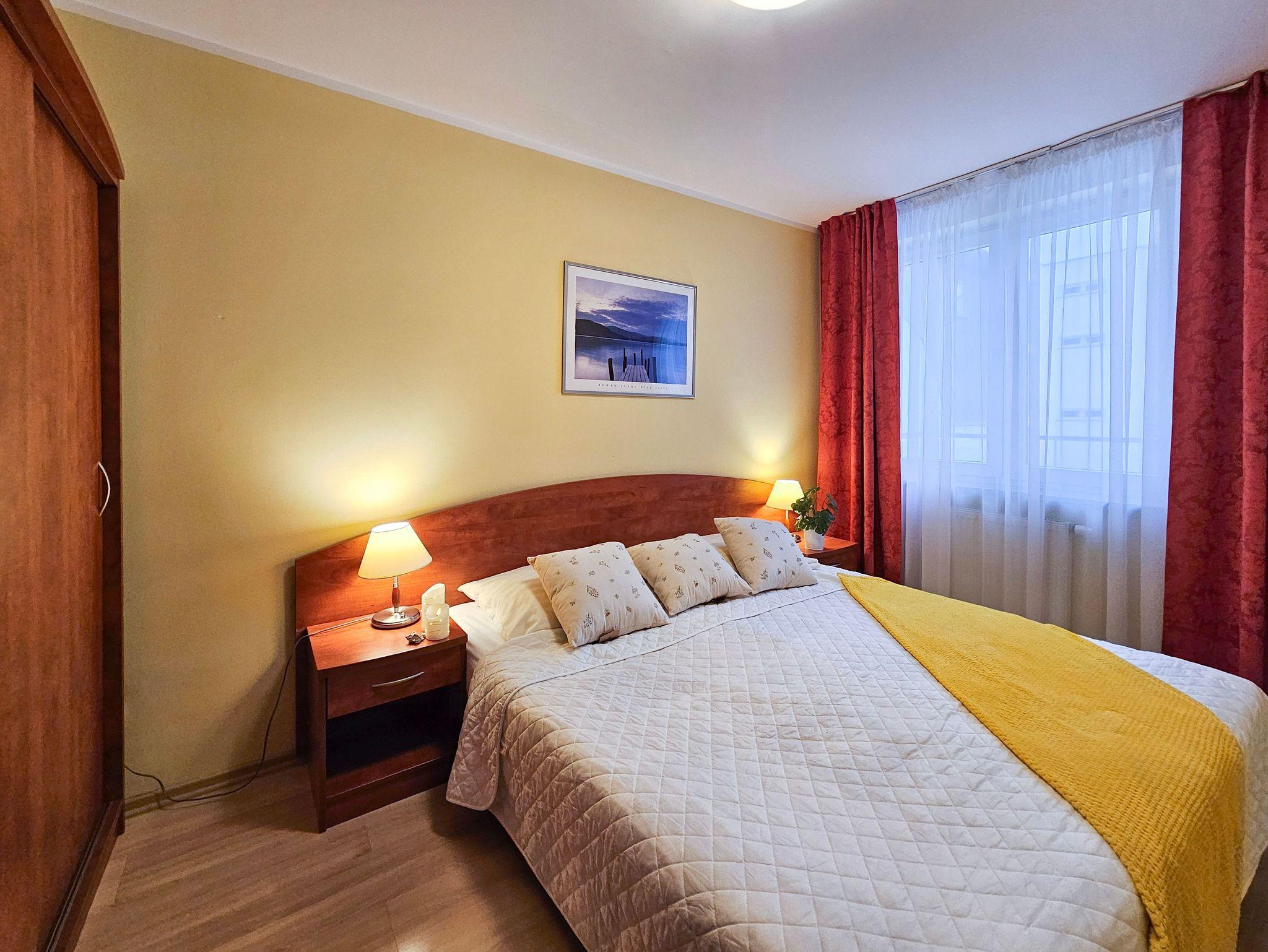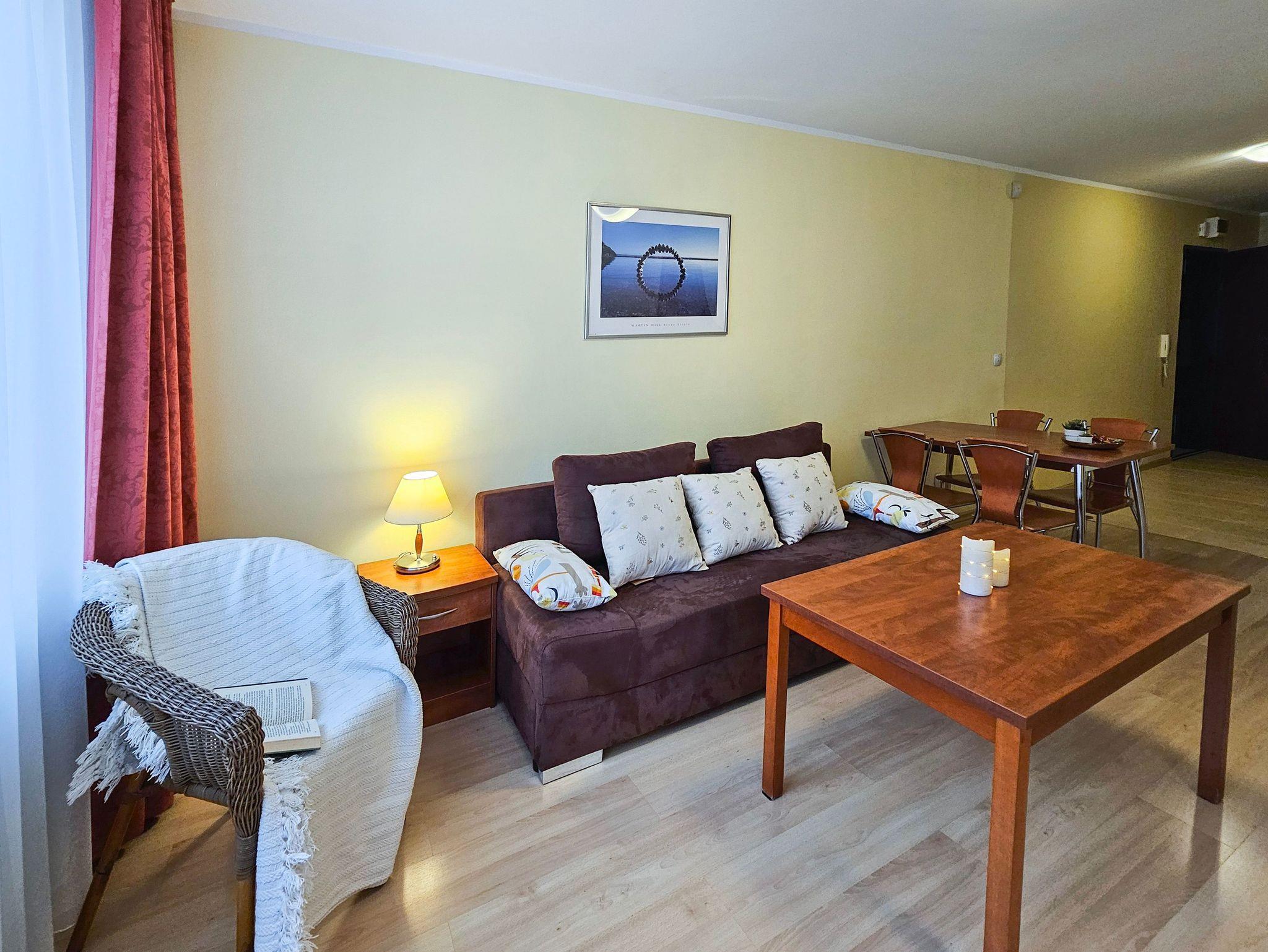 Schlafzimmer mit einem Doppelbett (160x200cm), Nachttischen, einem Kleiderschrank. Wohnzimmer mit Balkon und einem Tisch mit vier Stühlen. Die Wohnung hat der Balkon. Die Fenster und Balkon nach Nord ausgerichtet sind. Badezimmer mit Dusche, WC und Waschbecken.