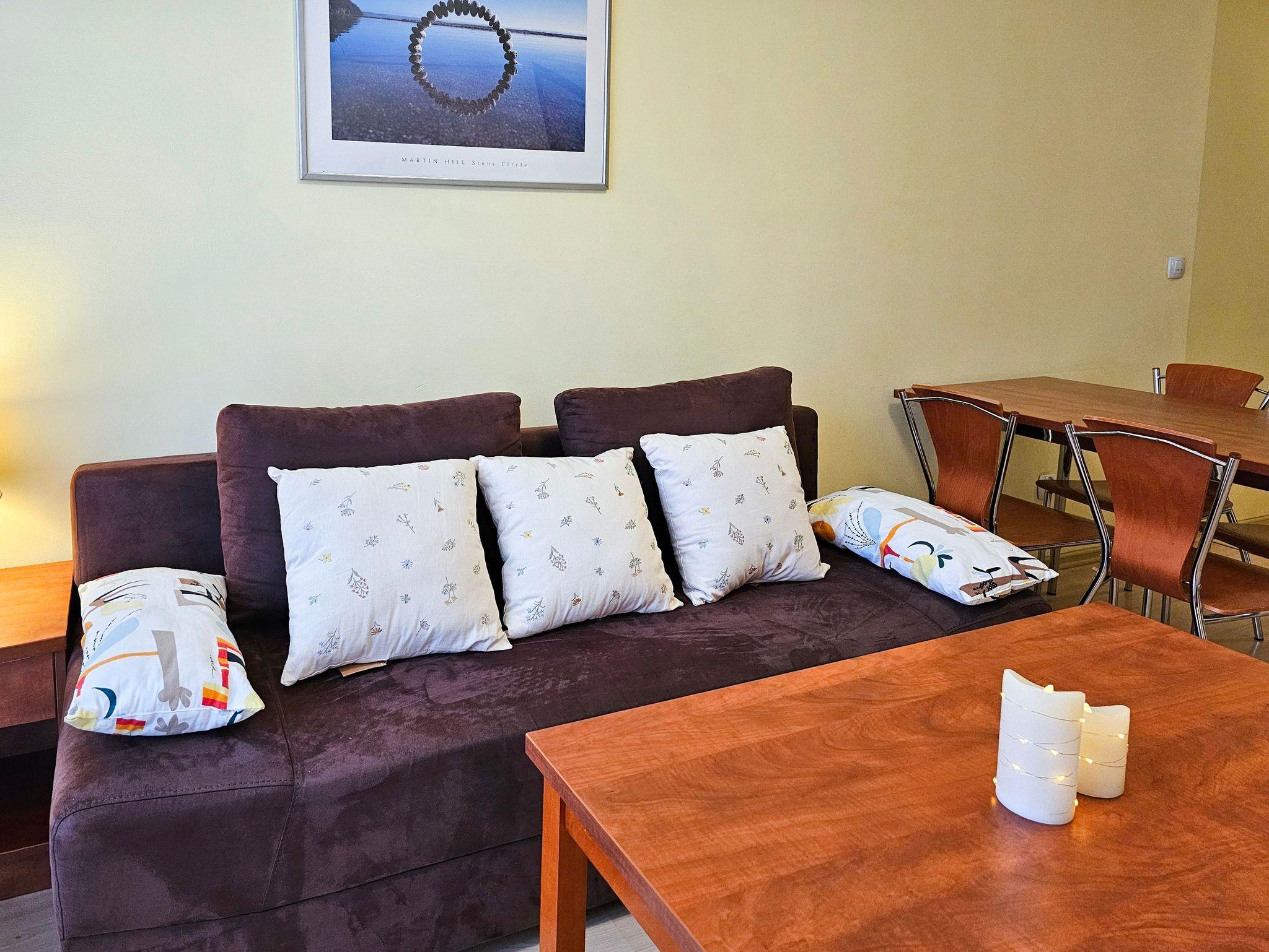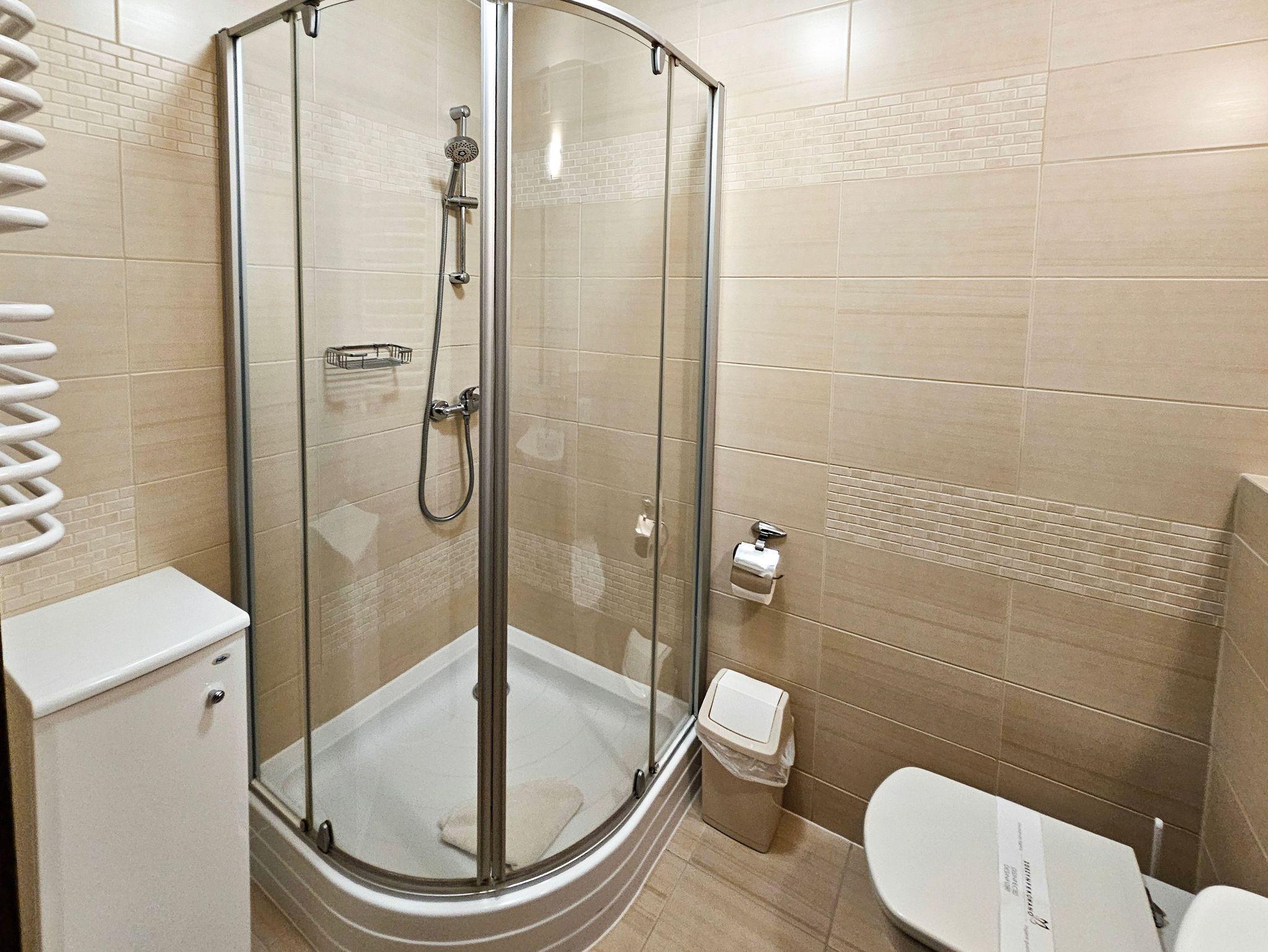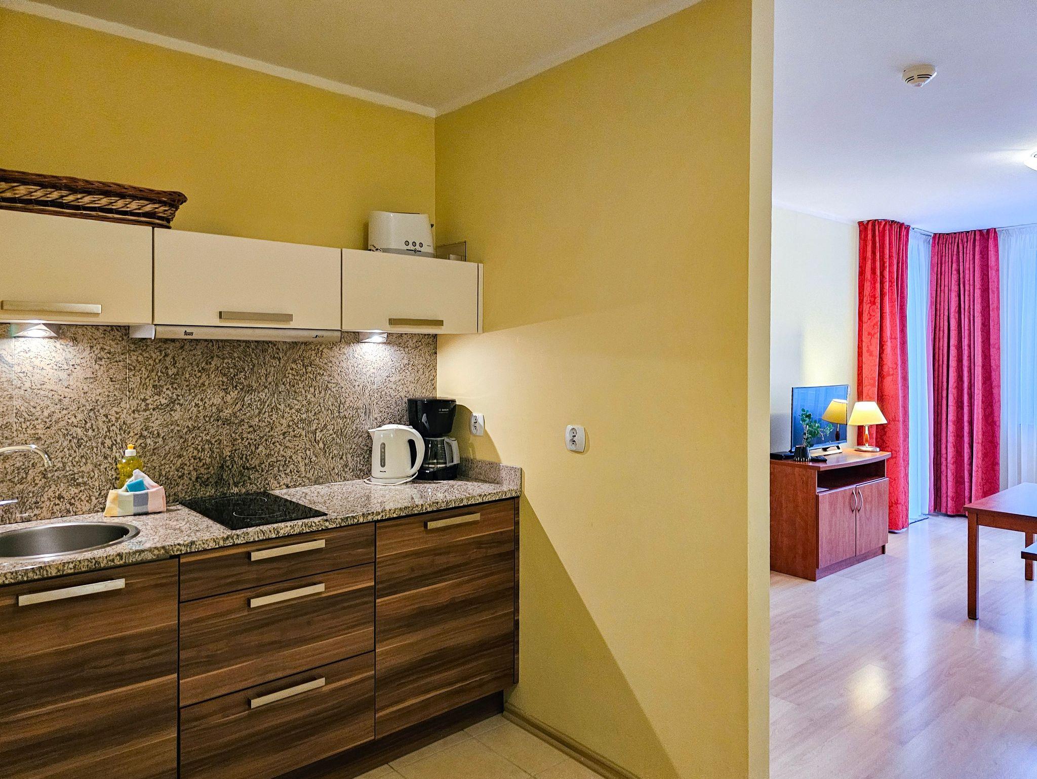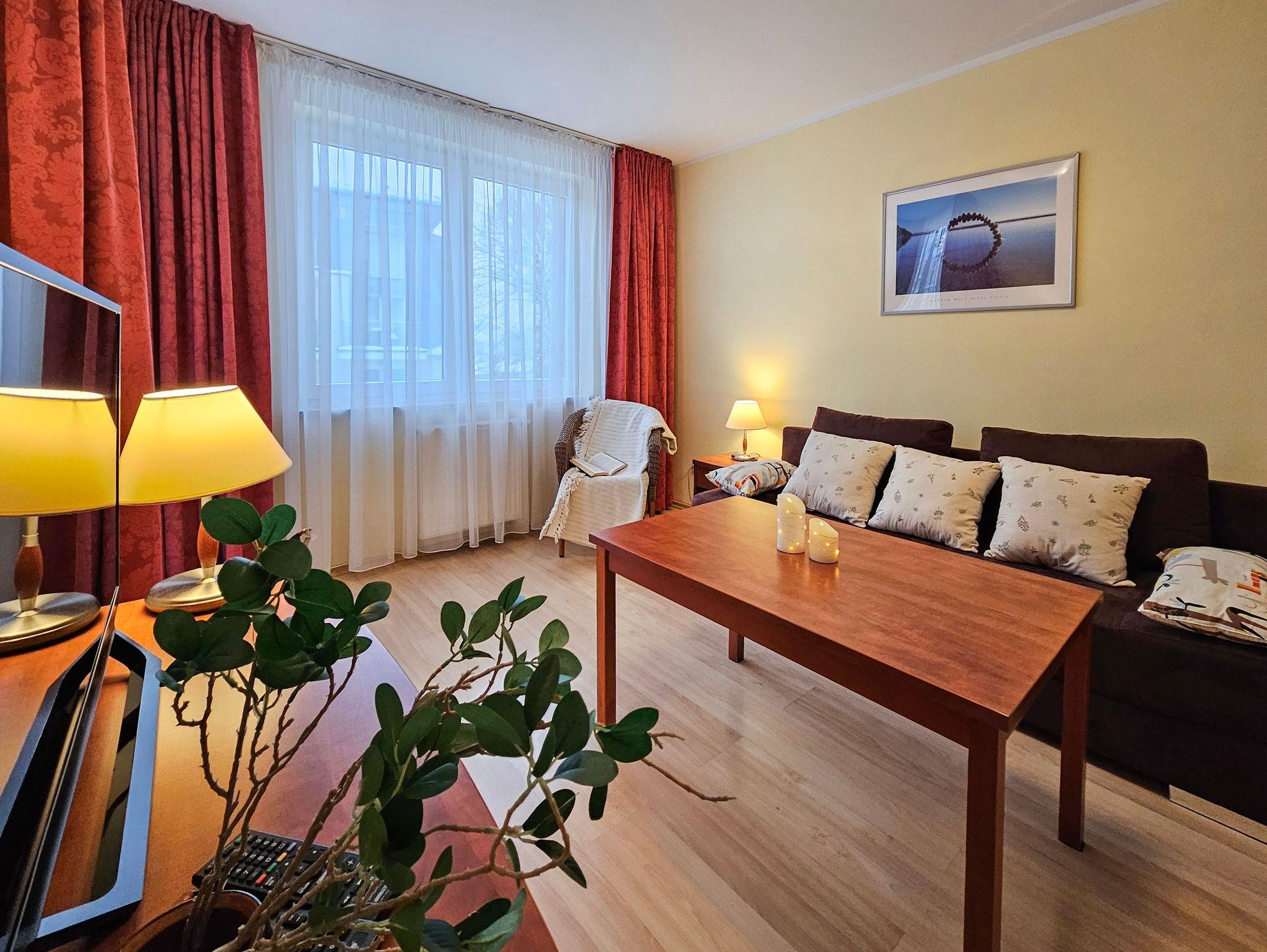 Schlafzimmer mit einem Doppelbett (160x200cm), Nachttischen, einem Kleiderschrank. Wohnzimmer mit Balkon und einem Tisch mit vier Stühlen. Die Wohnung hat der Balkon. Die Fenster und Balkon nach Nord ausgerichtet sind. Badezimmer mit Dusche, WC und Waschbecken.