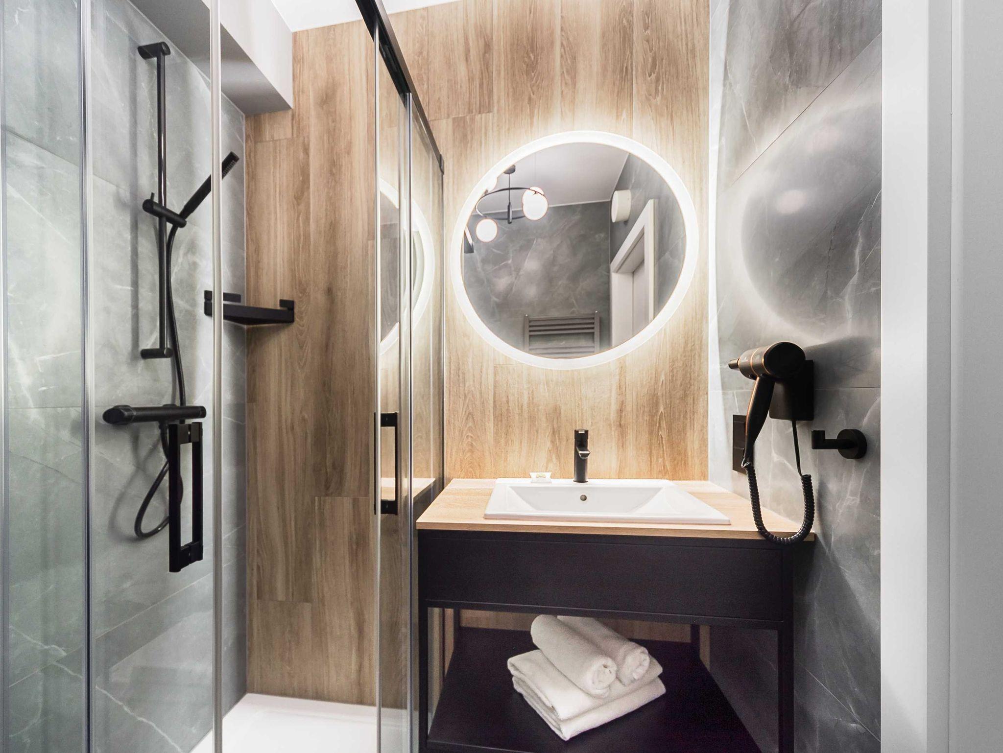 Das Zimmer verfügt über ein bequemes Kontinentalbett, (160x200) das in zwei kleinere geteilt werden kann ( 2x 80x 200) Nachttischen, einem Kleiderschrank und einem Tisch mit zwei Stühlen. Die Wohnung hat große Panoramafenster, die wie der Balkon, nach Süd-Osten ausgerichtet sind. Badezimmer mit bodengleicher Dusche, WC und Waschbecken.