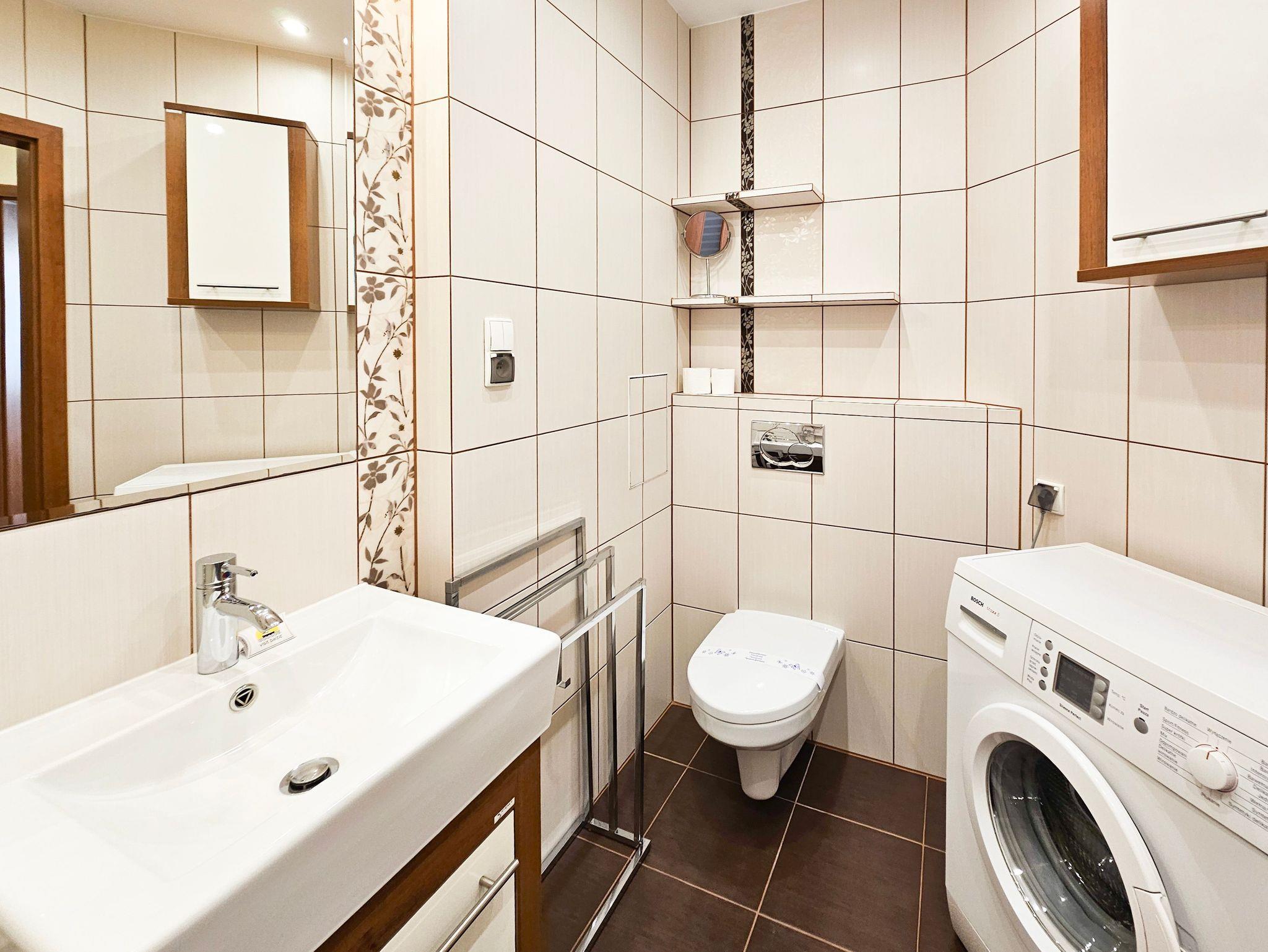 Badezimmer mit Badewanne, Toilette und Waschmaschine.