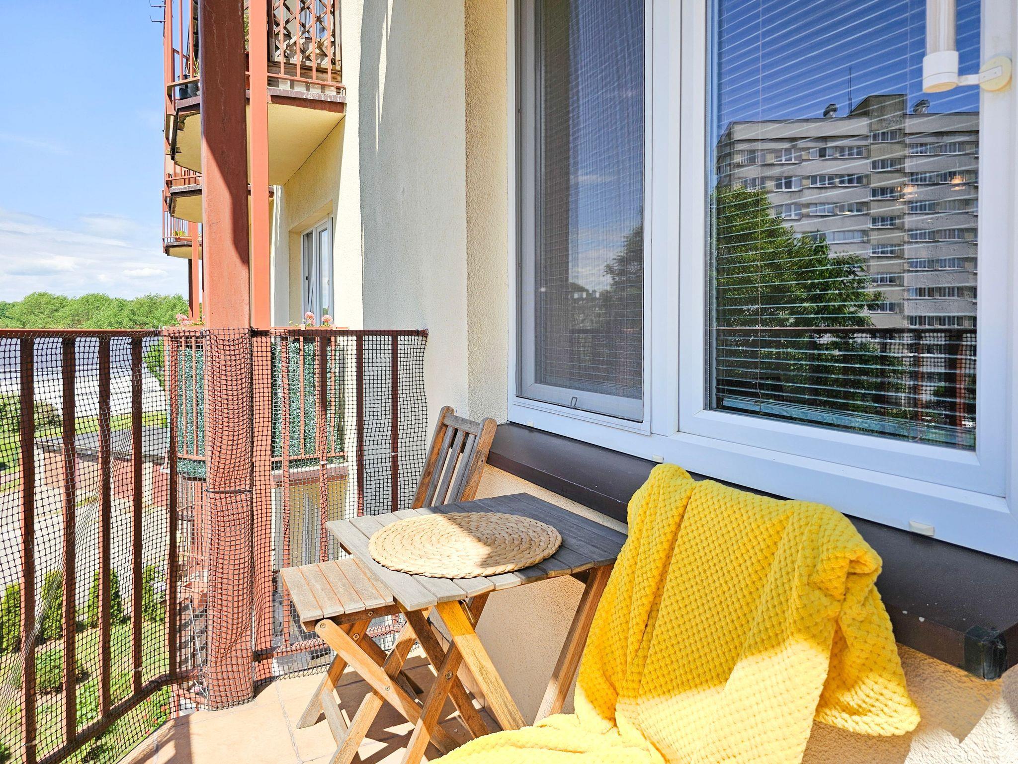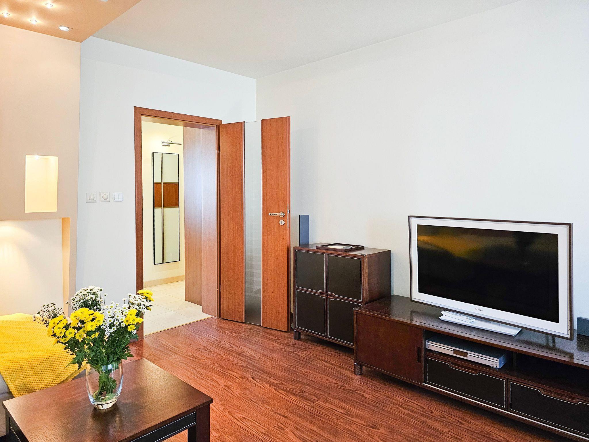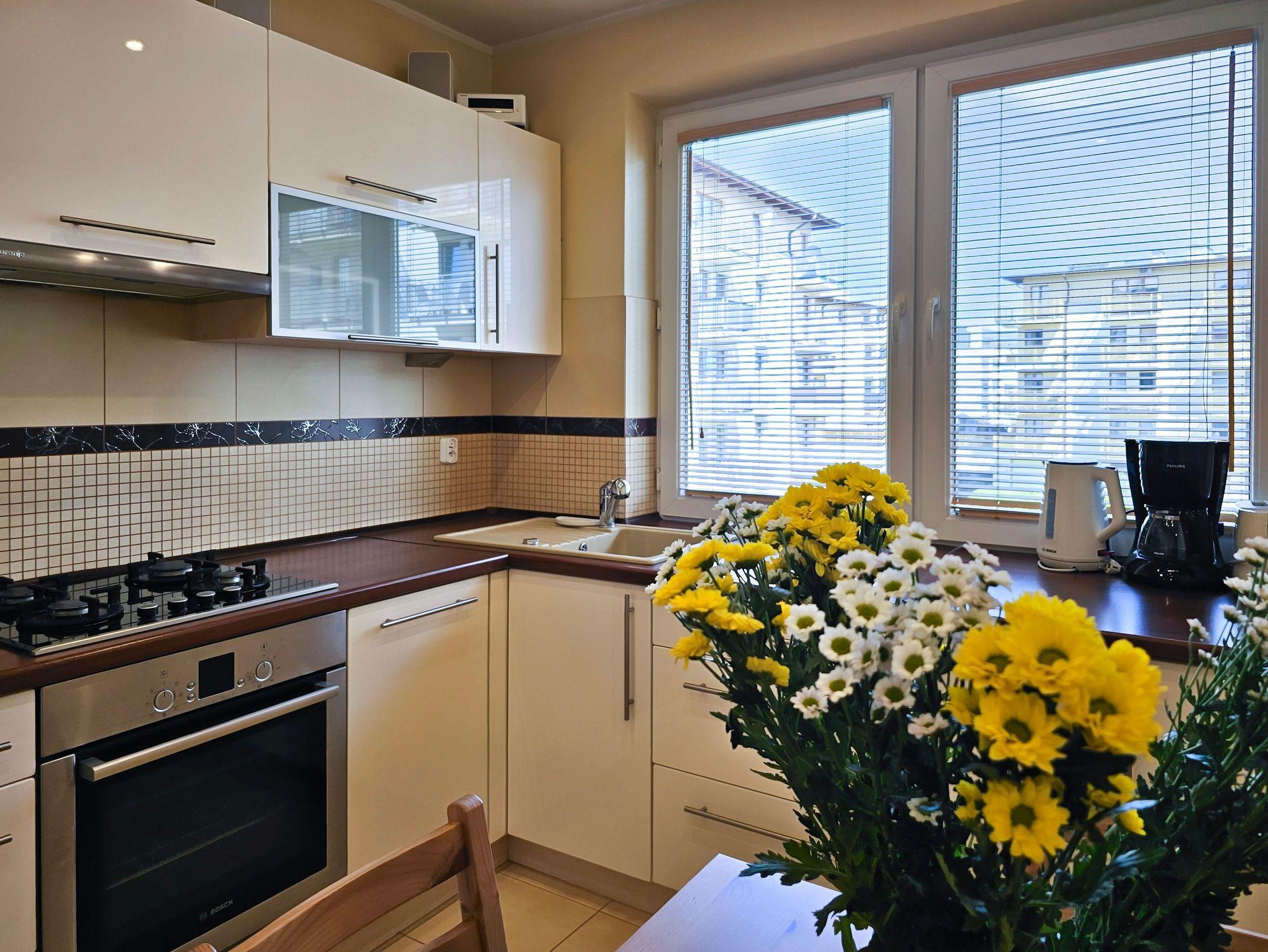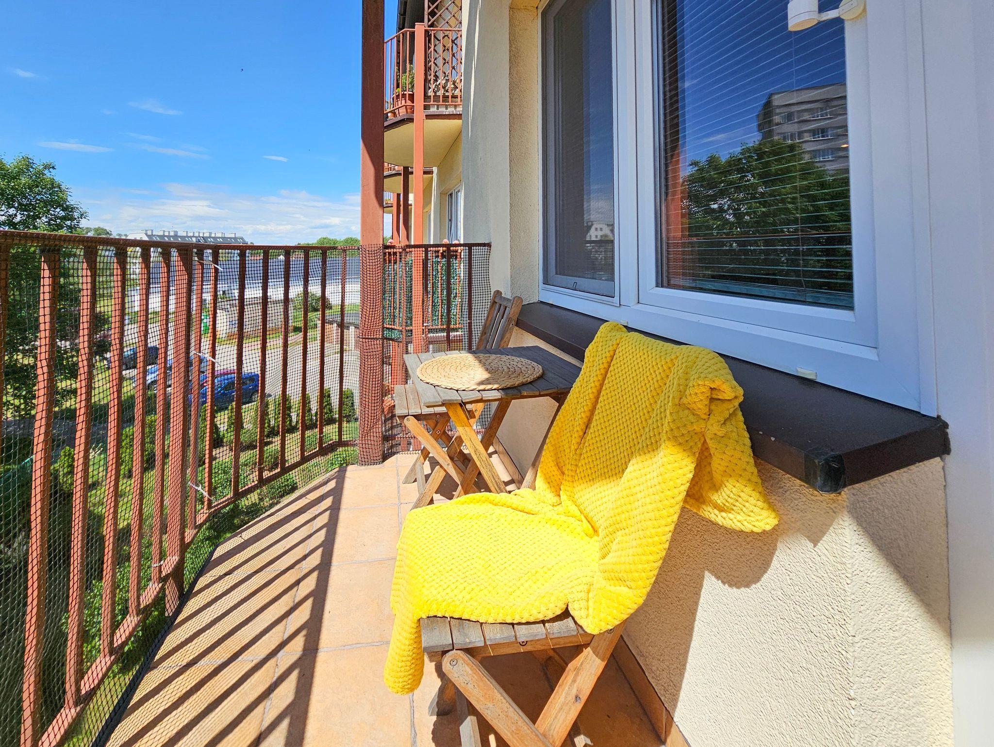 Geräumiges Wohnzimmer mit Zugang zu einem Südbalkon, Tisch mit 4 Stühlen, TV mit polnischen und deutschen Kanälen, Ledersofa.