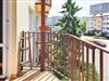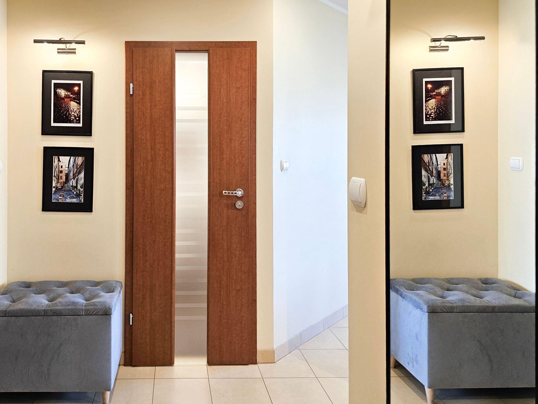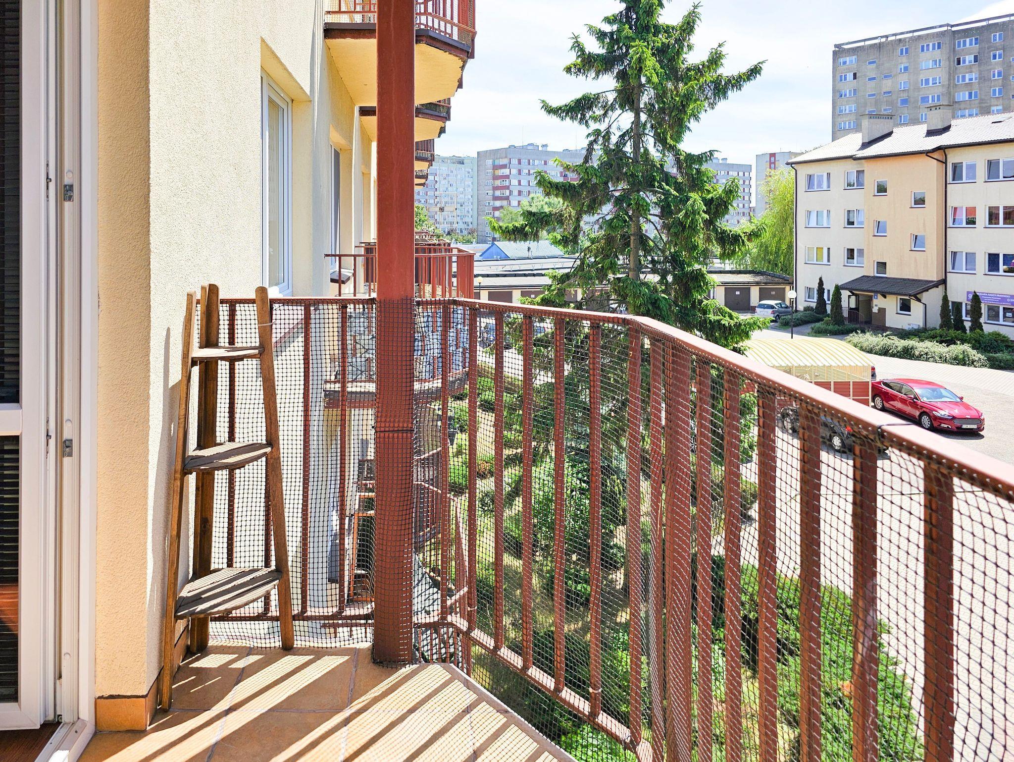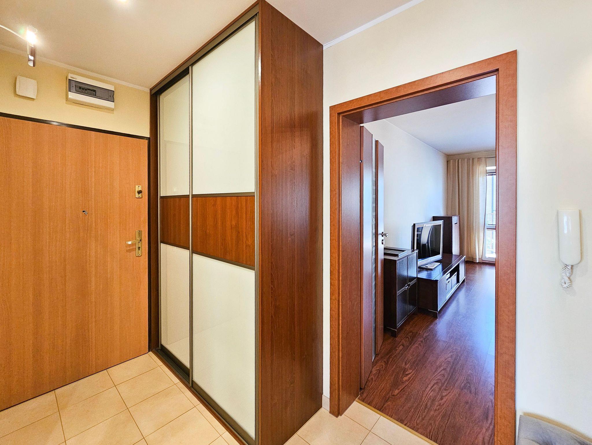 Geräumiges Wohnzimmer mit Zugang zu einem Südbalkon, Tisch mit 4 Stühlen, TV mit polnischen und deutschen Kanälen, Ledersofa.