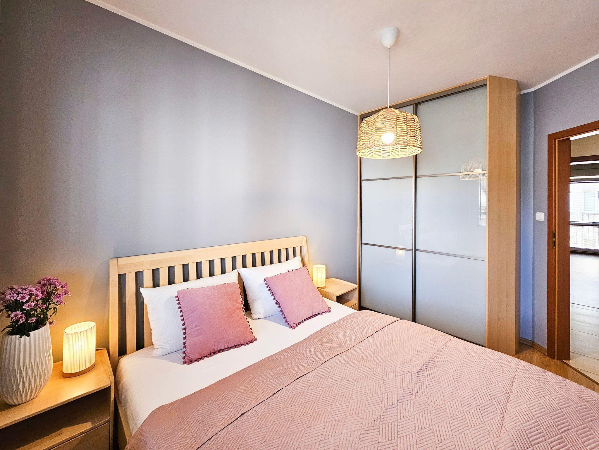 Schlafzimmer mit Doppelbett 160x200cm und großem Kleiderschrank.
