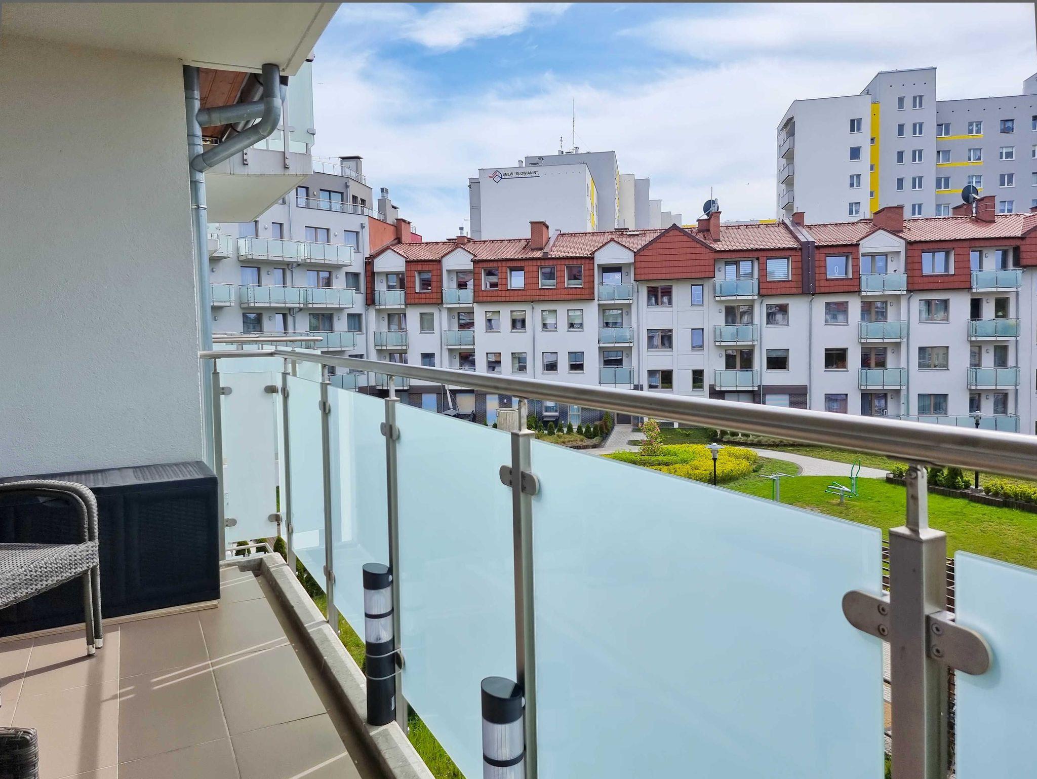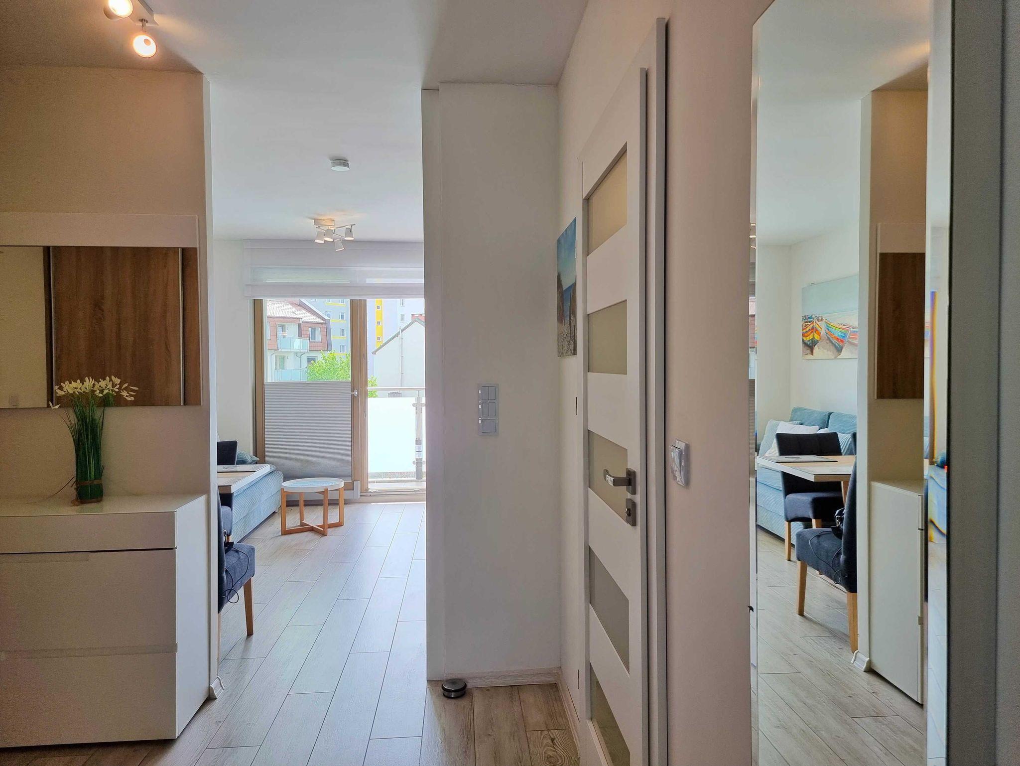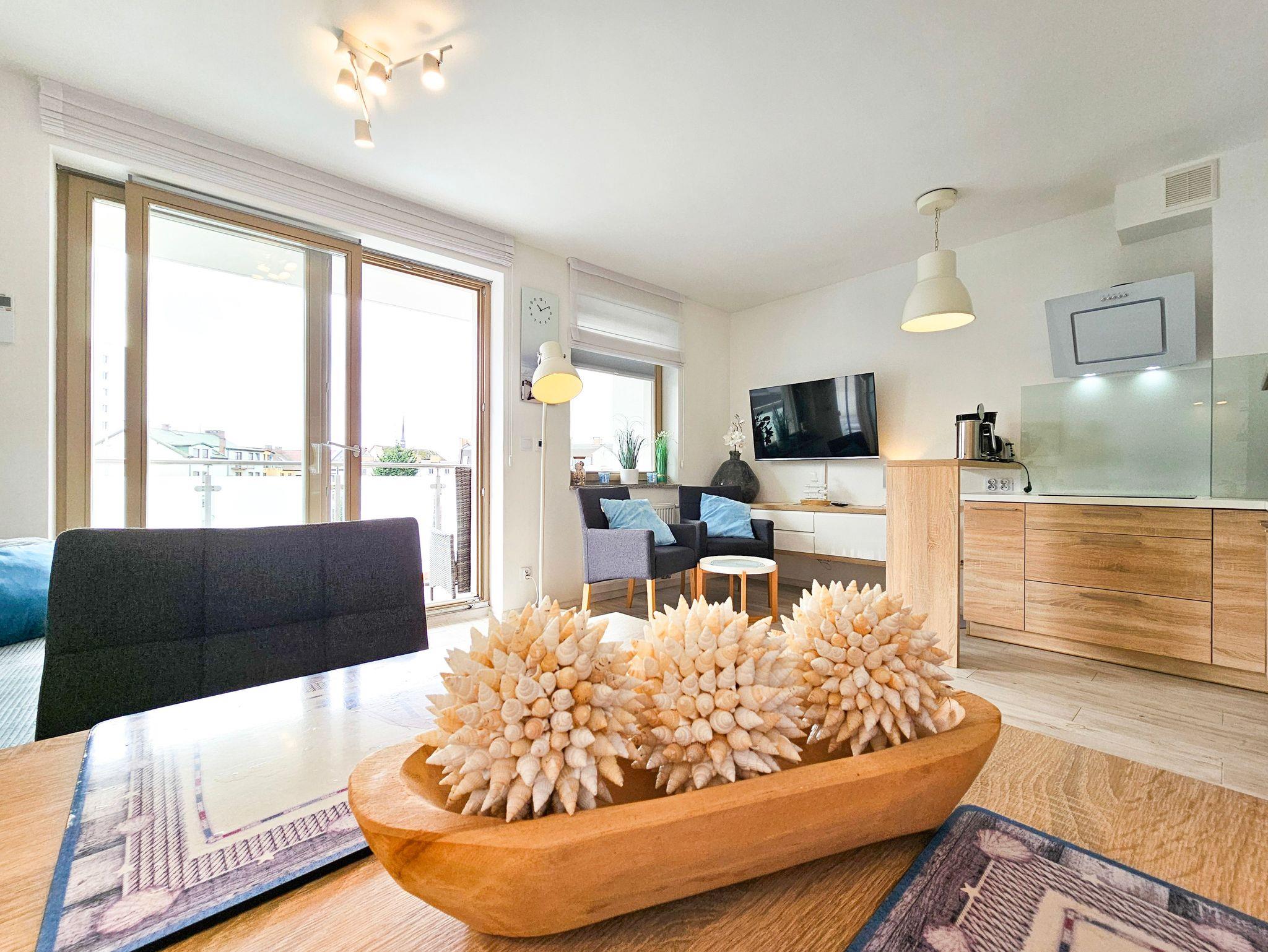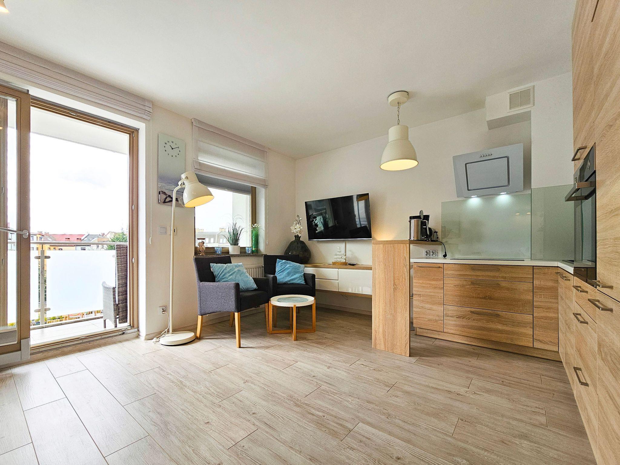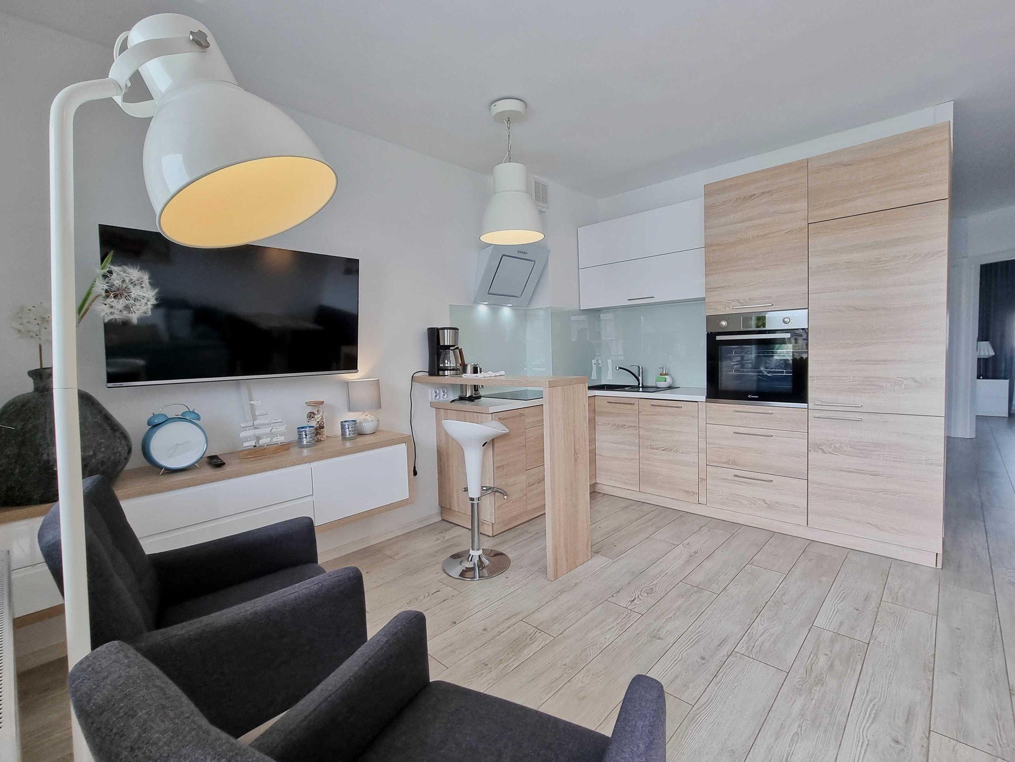 Die Wohnung besteht aus einem Wohnzimmer mit einem Schlafsofa (140cm x 200cm), einem Tisch mit einer Bank und zwei Stühlen, einer Küchenzeile und Zugang zu einem großen Balkon mit Blick auf einen grünen Innenhof. Im Wohnzimmer gibt es einen LCD-Fernseher mit polnischen und deutschen Kanälen. Die Küche ist mit allen Geräten ausgestattet, die für die Zubereitung und den Verzehr von Mahlzeiten notwendig sind, sowie mit einem großen Kühlschrank mit Gefrierfach, Backofen, Mikrowelle, Geschirrspüler, Induktionsherd mit 4 Kochplatten, Wasserkocher, Toaster und Filterkaffeemaschine.