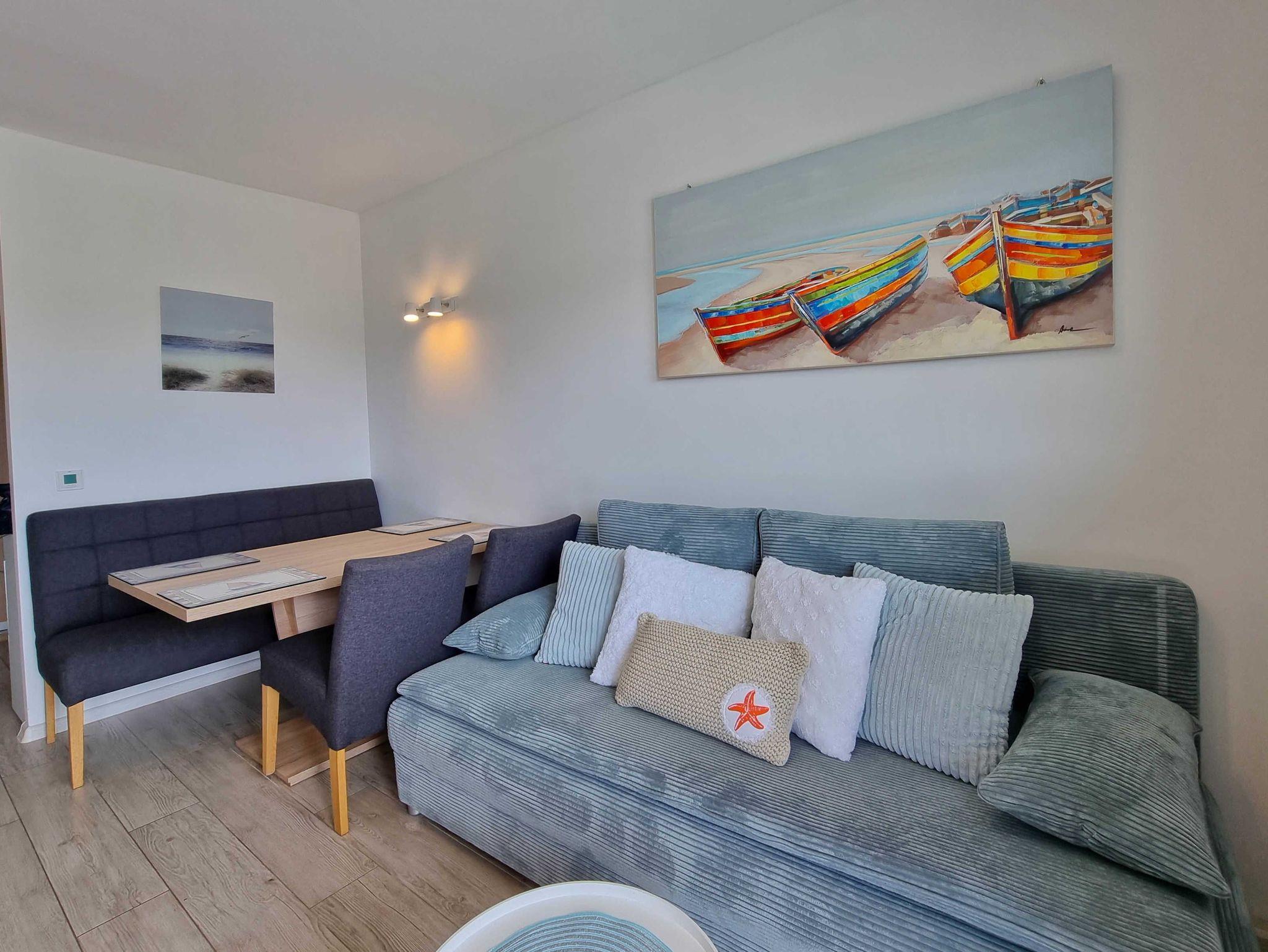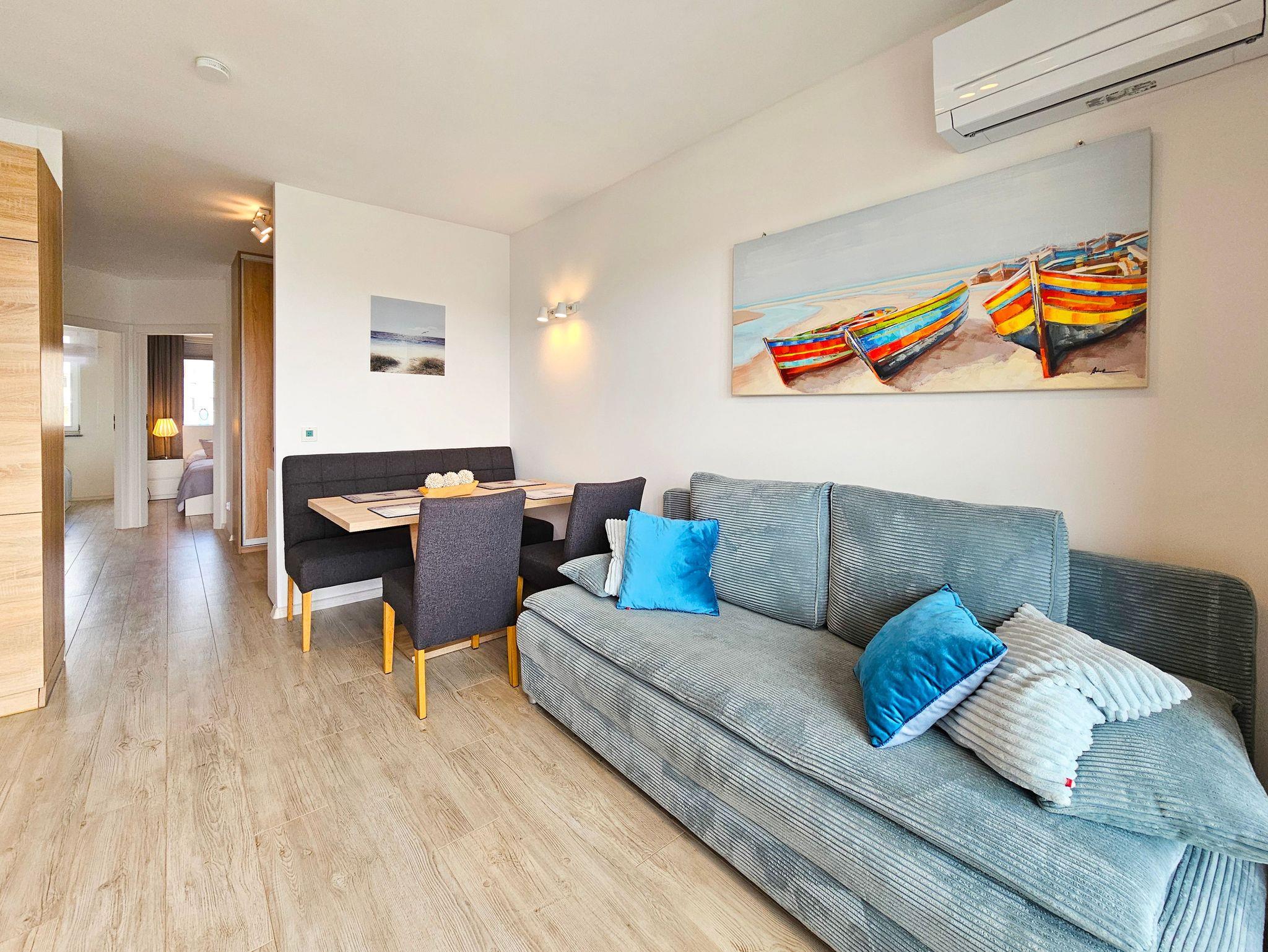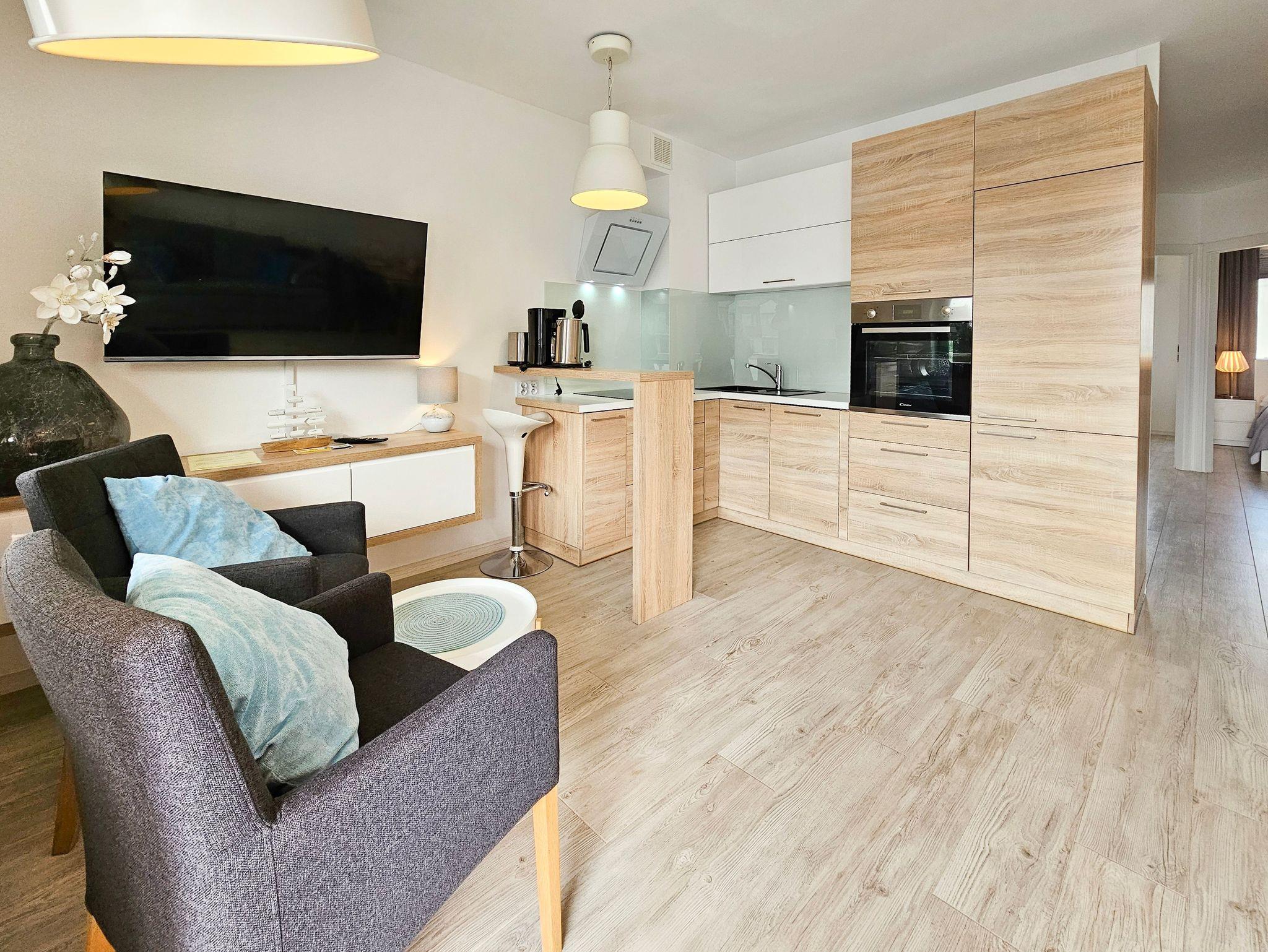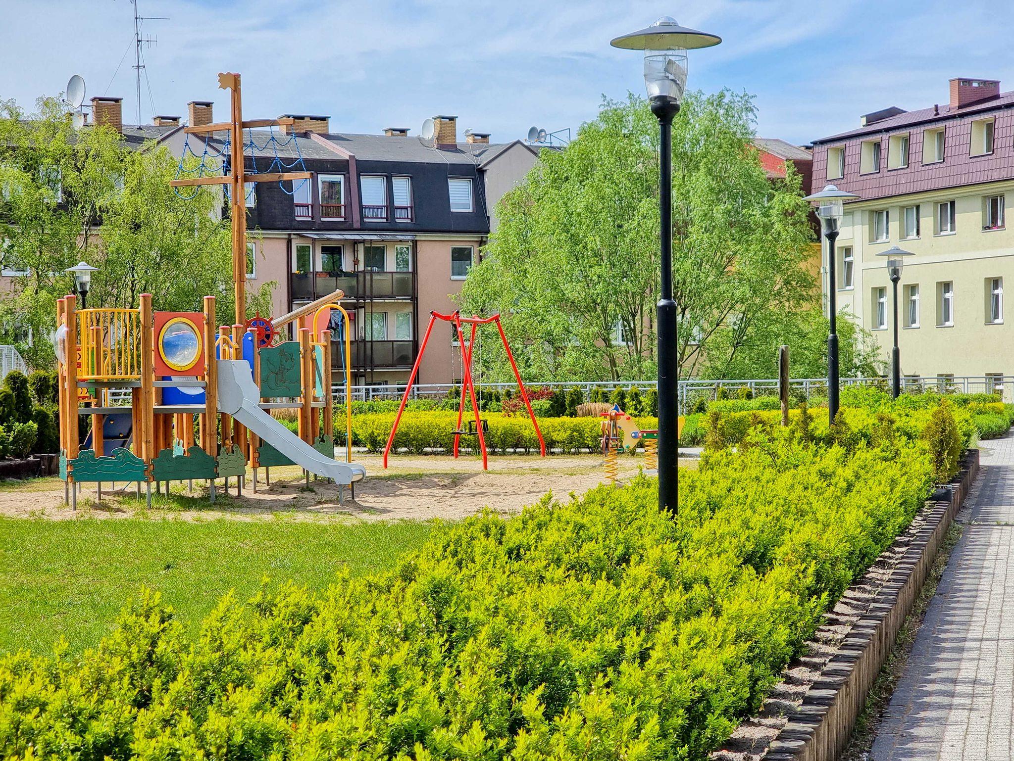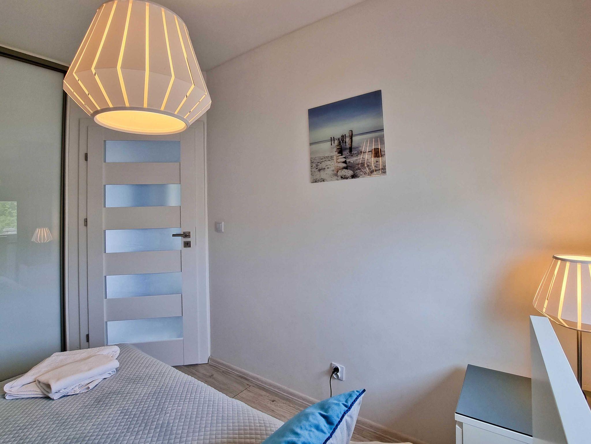 Die Wohnung besteht aus einem Wohnzimmer mit einem Schlafsofa (140cm x 200cm), einem Tisch mit einer Bank und zwei Stühlen, einer Küchenzeile und Zugang zu einem großen Balkon mit Blick auf einen grünen Innenhof. Im Wohnzimmer gibt es einen LCD-Fernseher mit polnischen und deutschen Kanälen. Die Küche ist mit allen Geräten ausgestattet, die für die Zubereitung und den Verzehr von Mahlzeiten notwendig sind, sowie mit einem großen Kühlschrank mit Gefrierfach, Backofen, Mikrowelle, Geschirrspüler, Induktionsherd mit 4 Kochplatten, Wasserkocher, Toaster und Filterkaffeemaschine.